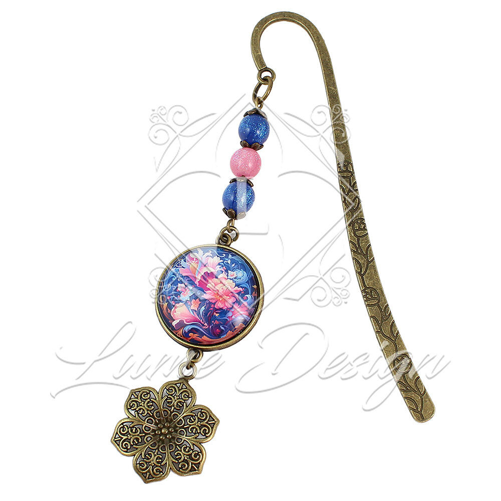 Ręcznie wykonana zakładka do książki, przyciągająca wzrok subtelnym pięknem i romantycznym nastrojem. Grafika skryta pod wypukłym szkiełkiem ukazuje delikatne, wiosenne kwiaty w odcieniach błękitu i różu, przypominające secesyjne, roślinne witraże.