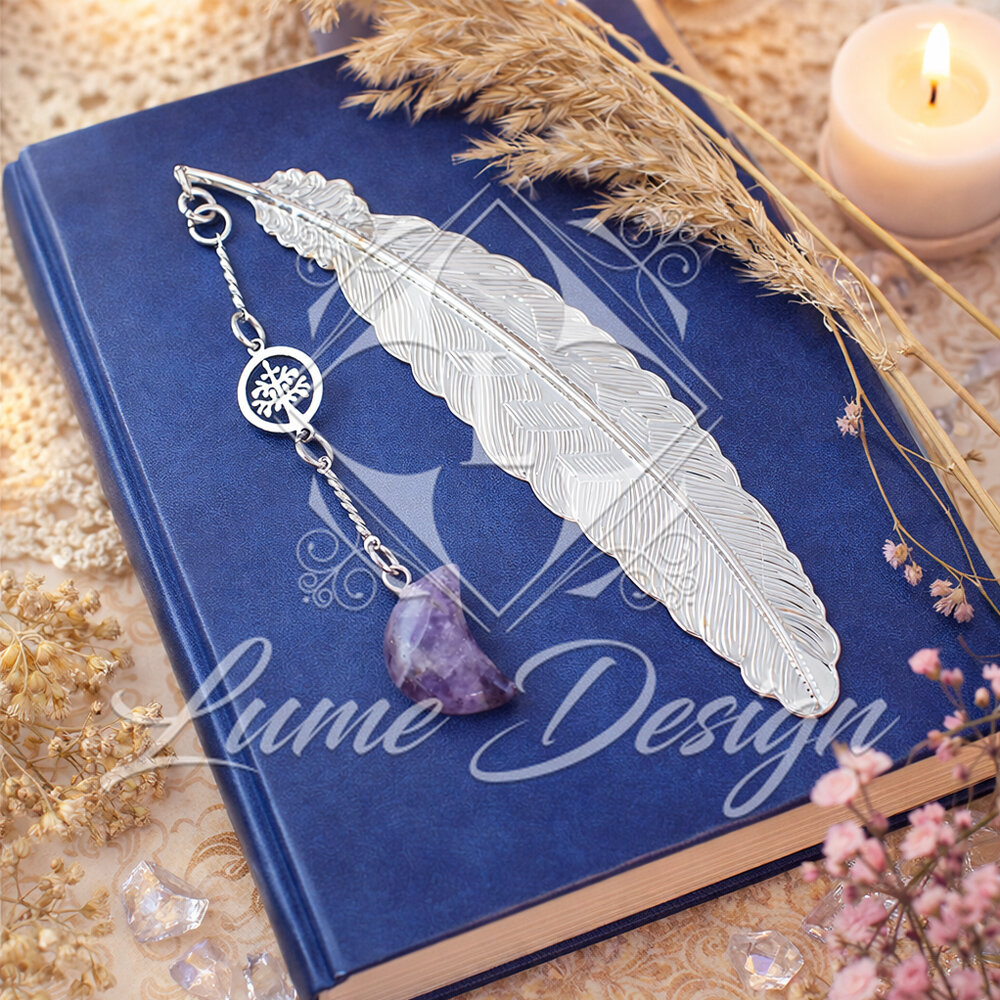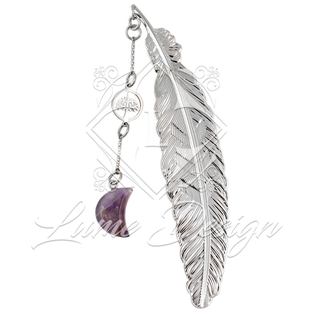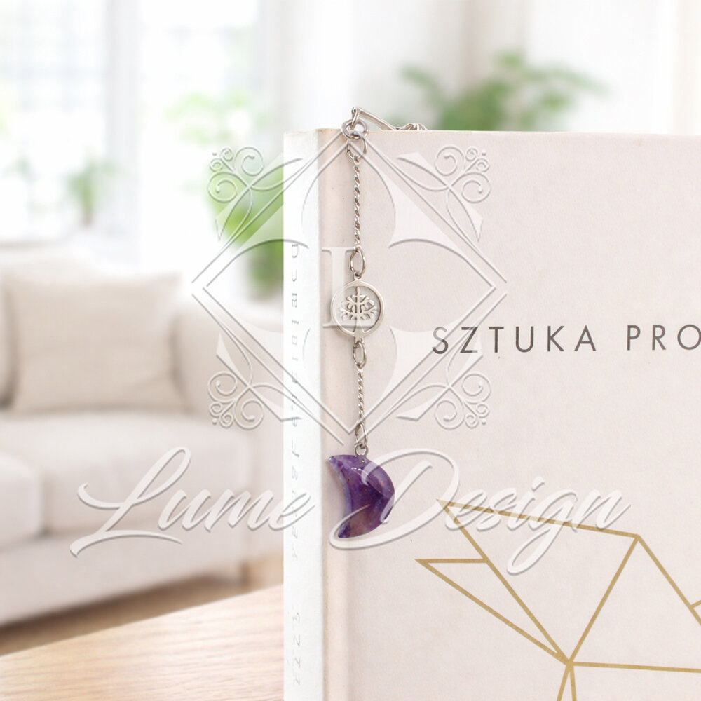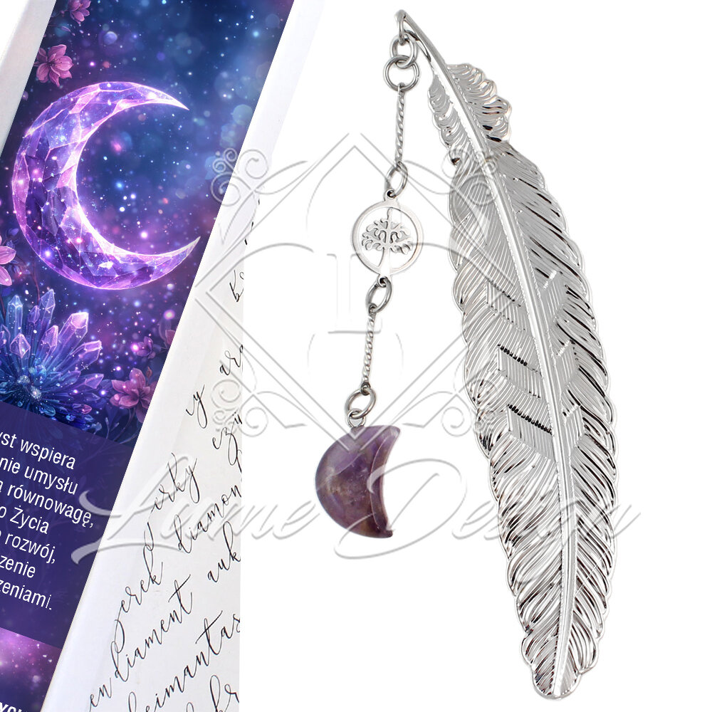 Ozdobna zawieszka łączy w sobie głęboki, fioletowy odcień kamienia w kształcie półksiężyca z precyzyjnie wyciętym symbolem drzewa. Każdy kawałek ametystu jest unikalny, co nadaje Twojej zakładce niepowtarzalny charakter.