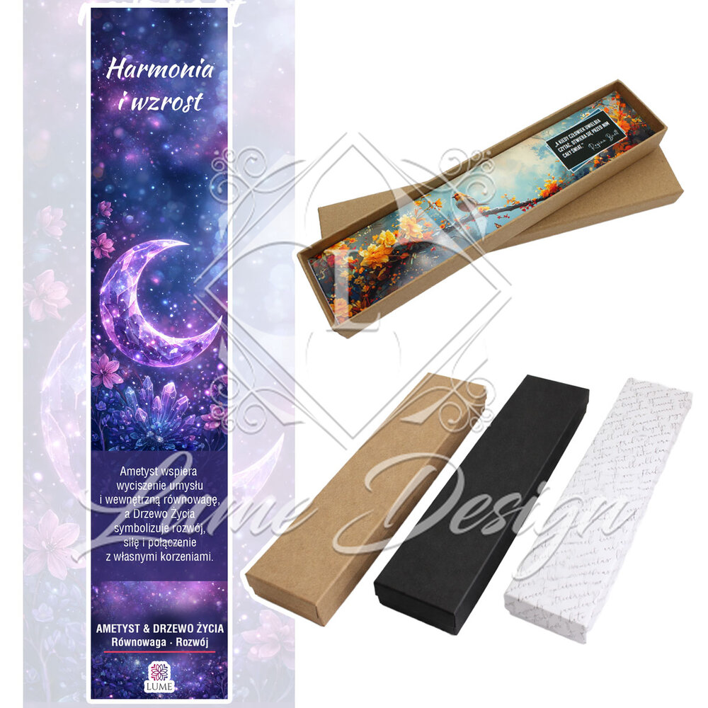 Zakładka zapakowana jest w ozdobne pudełko z dedykowaną wkładką. Znajduje się na niej opis znaczenia użytego kamienia oraz informacja o symbolice drzewa życia.