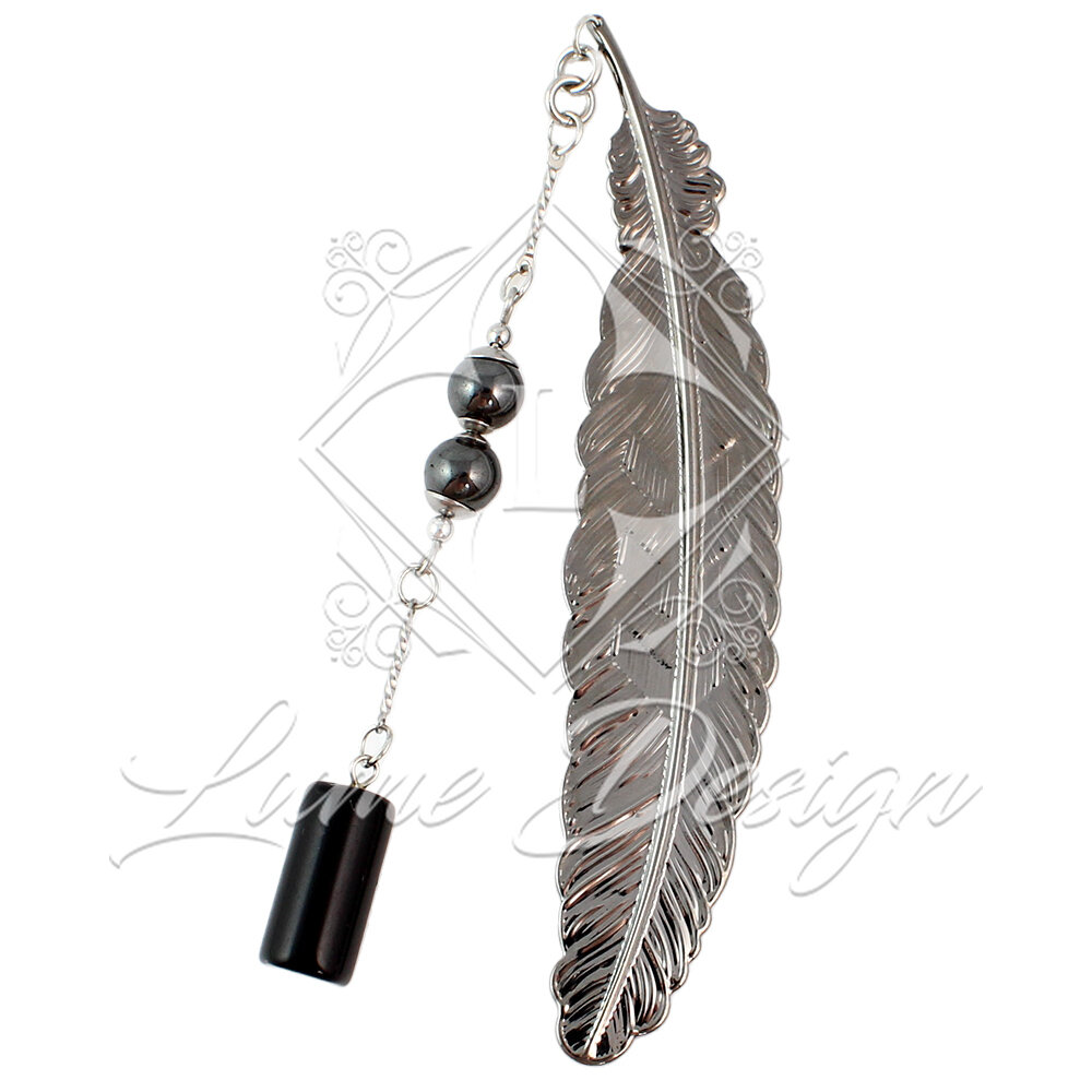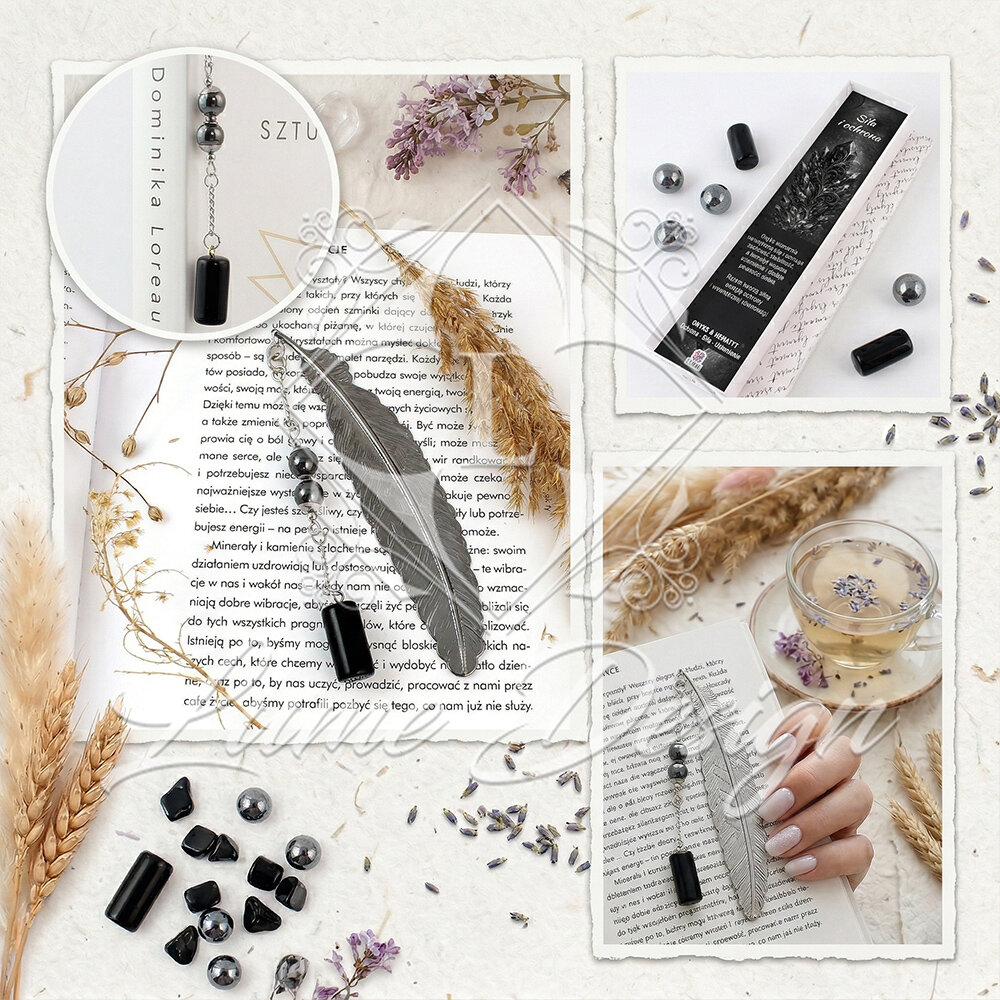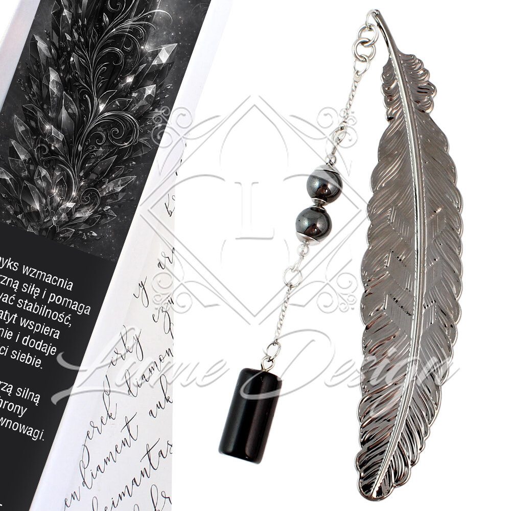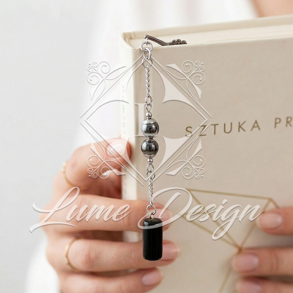Zakładka z zawieszką Onyks i Hematyt charakteryzuje się wyjątkową lekkością i smukłą formą. Została zaprojektowana z myślą o czytelnikach ceniących subtelne akcesoria, które nie obciążają stron i idealnie przylegają do grzbietu książki. Ciemna kolorystyka w odcieniu gunmetal nadaje jej nowoczesnego, zdecydowanego charakteru.