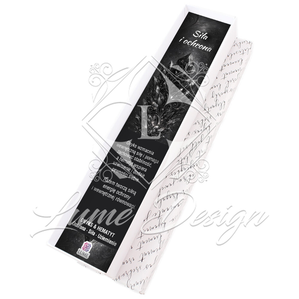 "Siła i ochrona. Onyks wzmacnia wewnętrzną siłę i pomaga zachować stabilność, a hematyt wspiera uziemienie i dodaje pewności siebie. Razem tworzą silną energię ochrony i wewnętrznej równowagi."