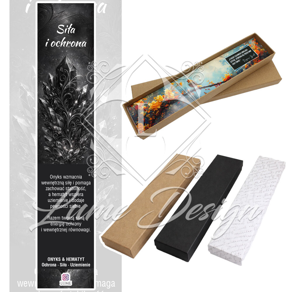 Zakładka zapakowana jest w ozdobne pudełko z dedykowaną wkładką. Znajduje się na niej opis znaczenia użytych kamieni oraz informacja o ich ochronnym działaniu.
