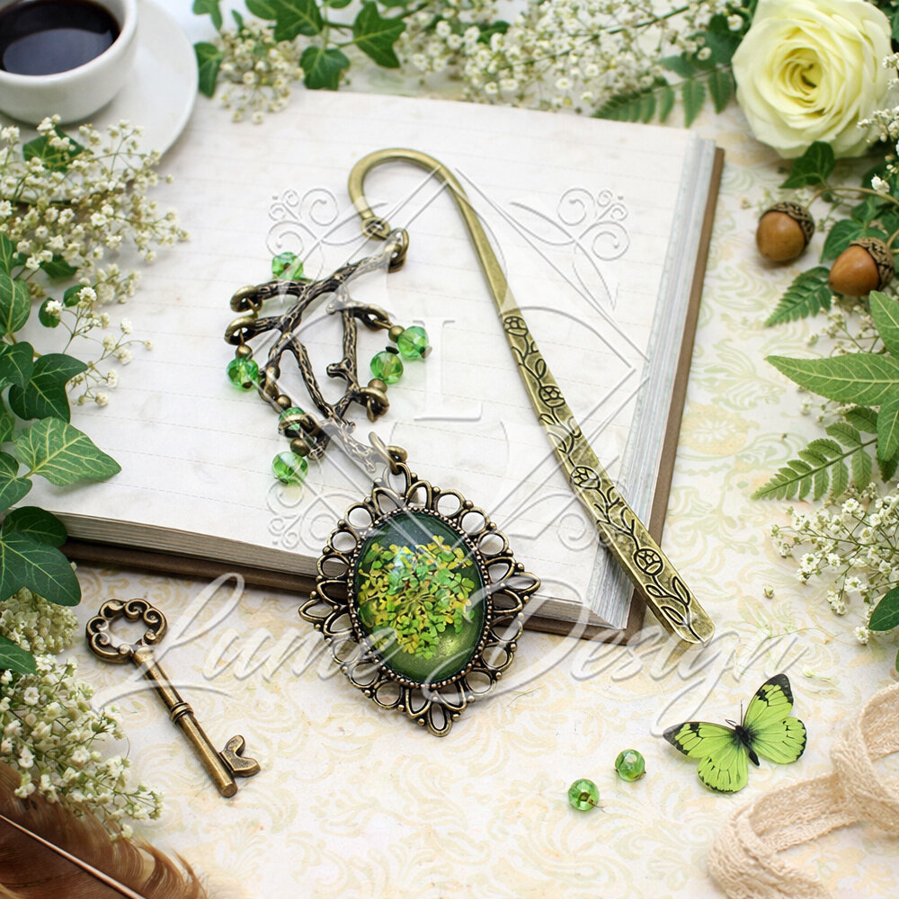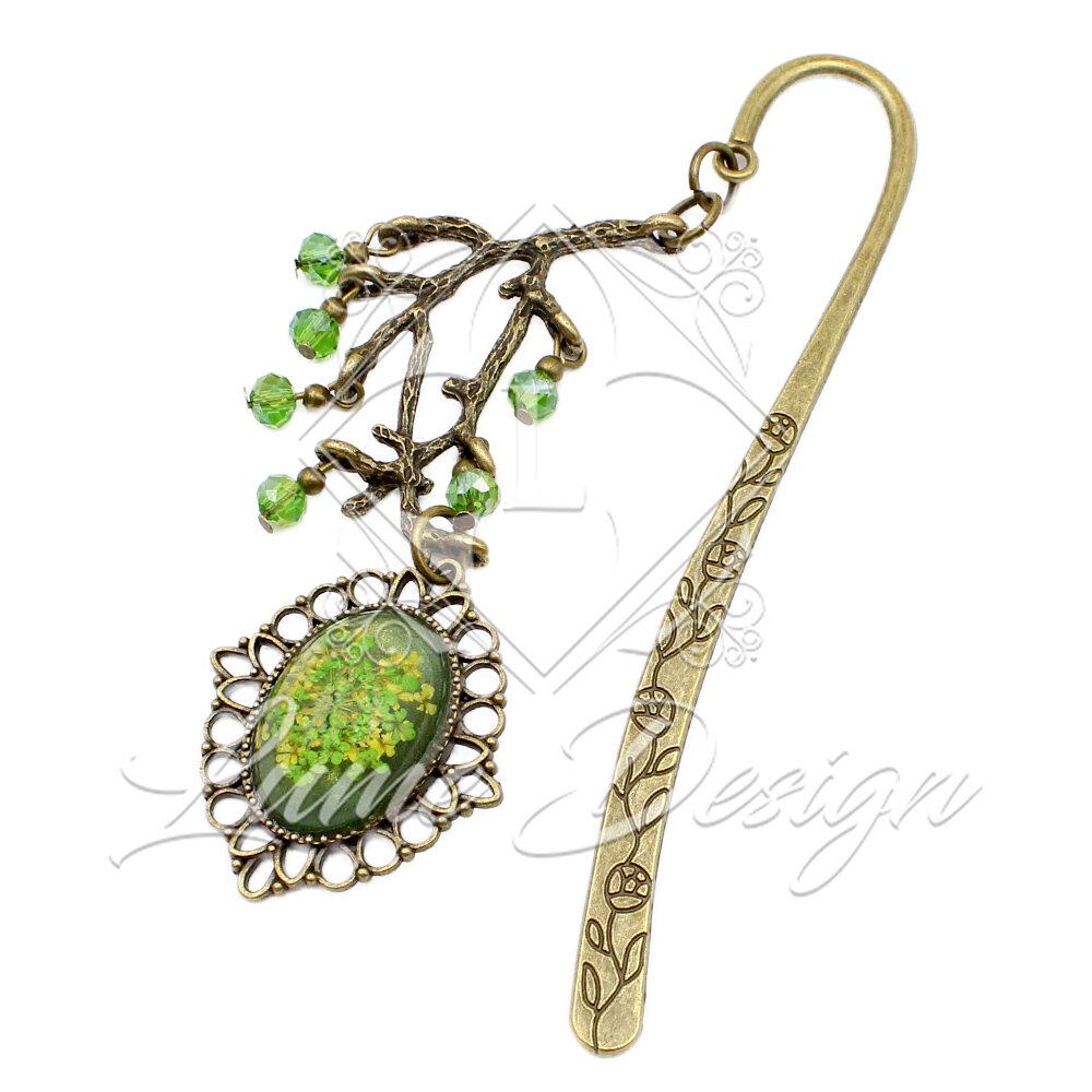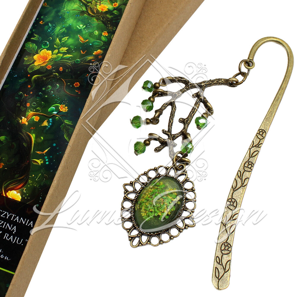 Ręcznie wykonana zakładka z zatopionymi w żywicy suszonymi kwiatkami. Uzupełniona kryształkami szklanymi i zawieszką w kształcie gałązek. Piękna i symboliczna.