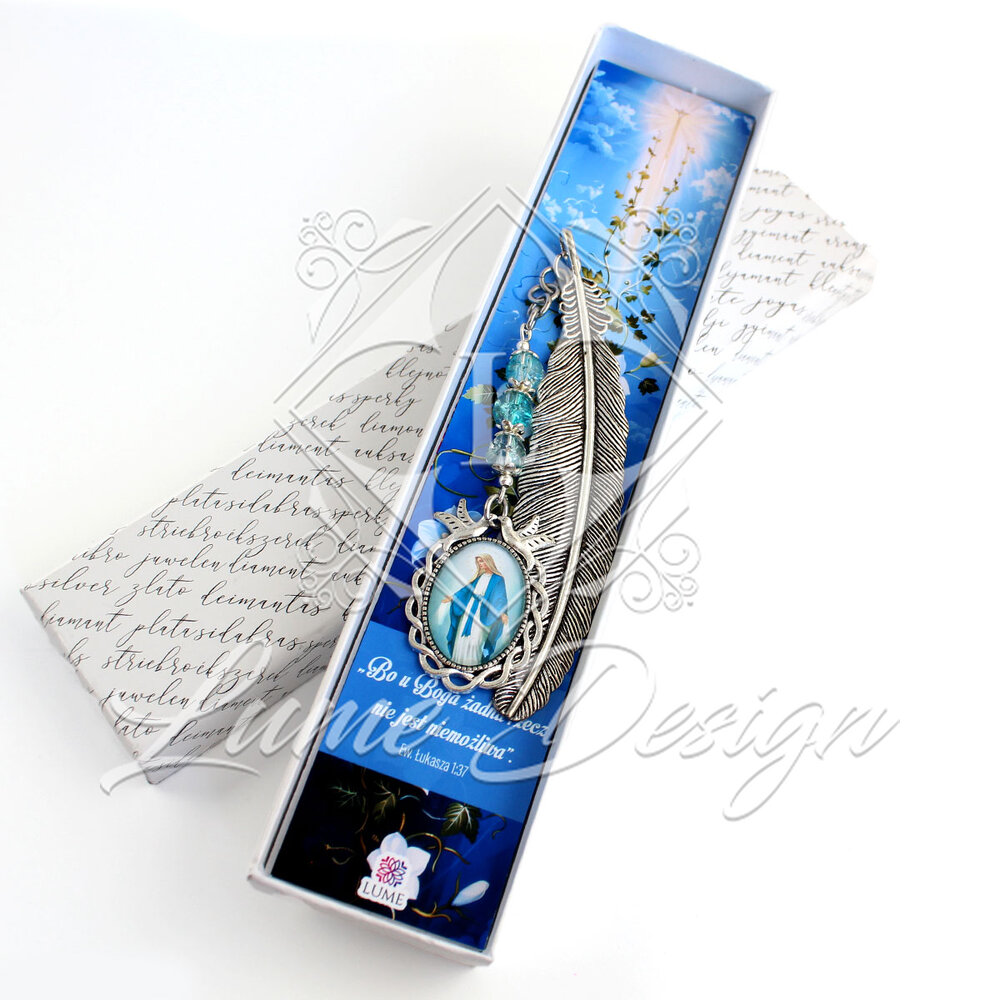Jak używać zakładki? Wsuń metalowy element zakładki (piórko) między kartki książki, tak aby pozostawał niewidoczny. Zawieszka z wizerunkiem Matki Bożej będzie swobodnie zwisać wzdłuż grzbietu książki, tworząc efekt biżuterii.