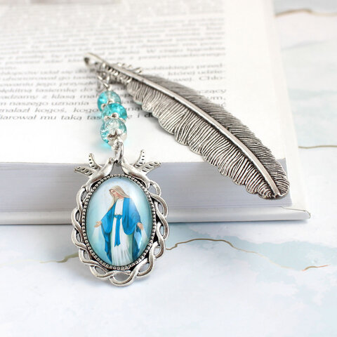 Unikalna zakładka wykonana z elementów w kolorze starego srebra, ozdobiona religijnym motywem Matki Bożej zamkniętym pod wypukłym szkiełkiem oraz szklanymi koralikami. Idealna na prezent lub upominek duchowy.