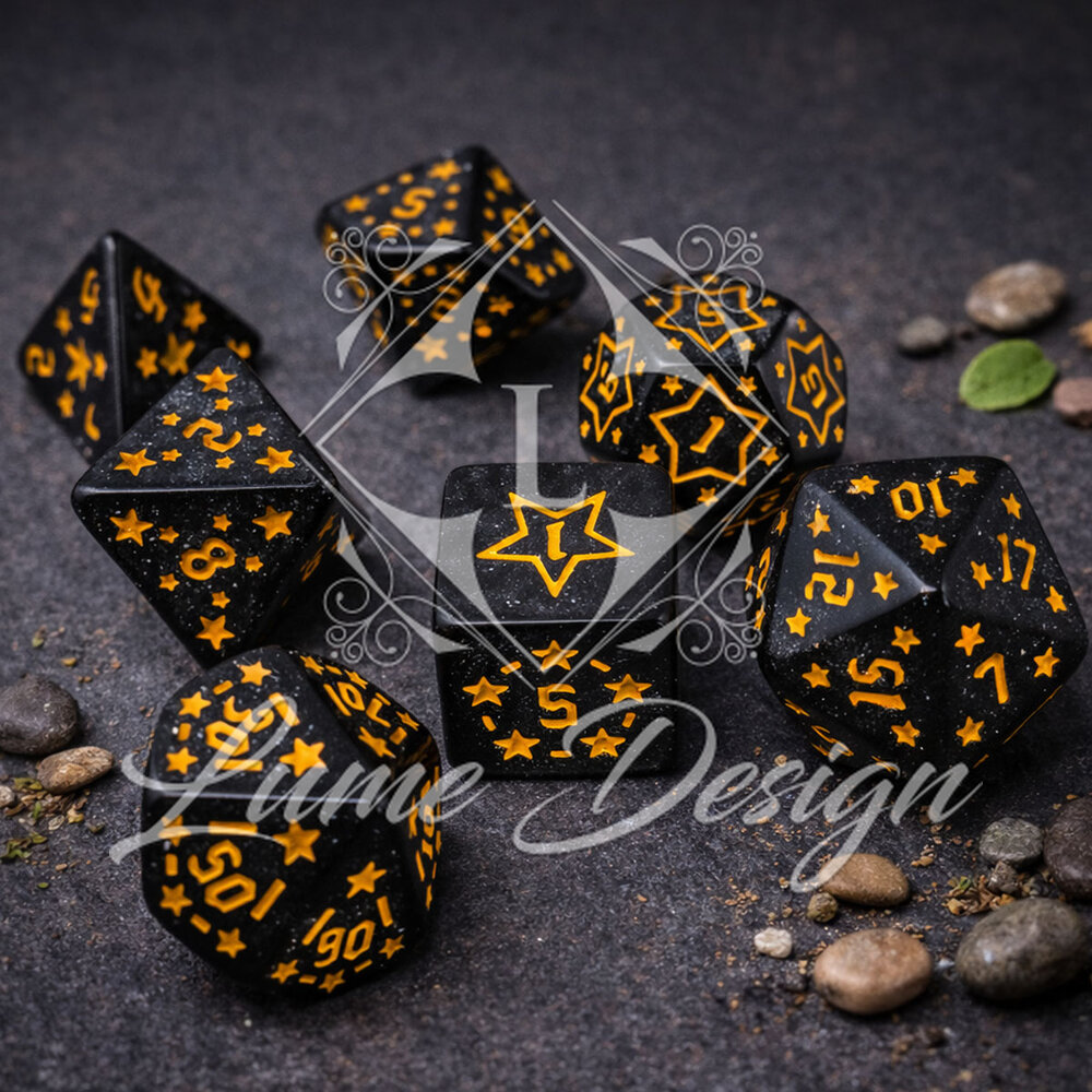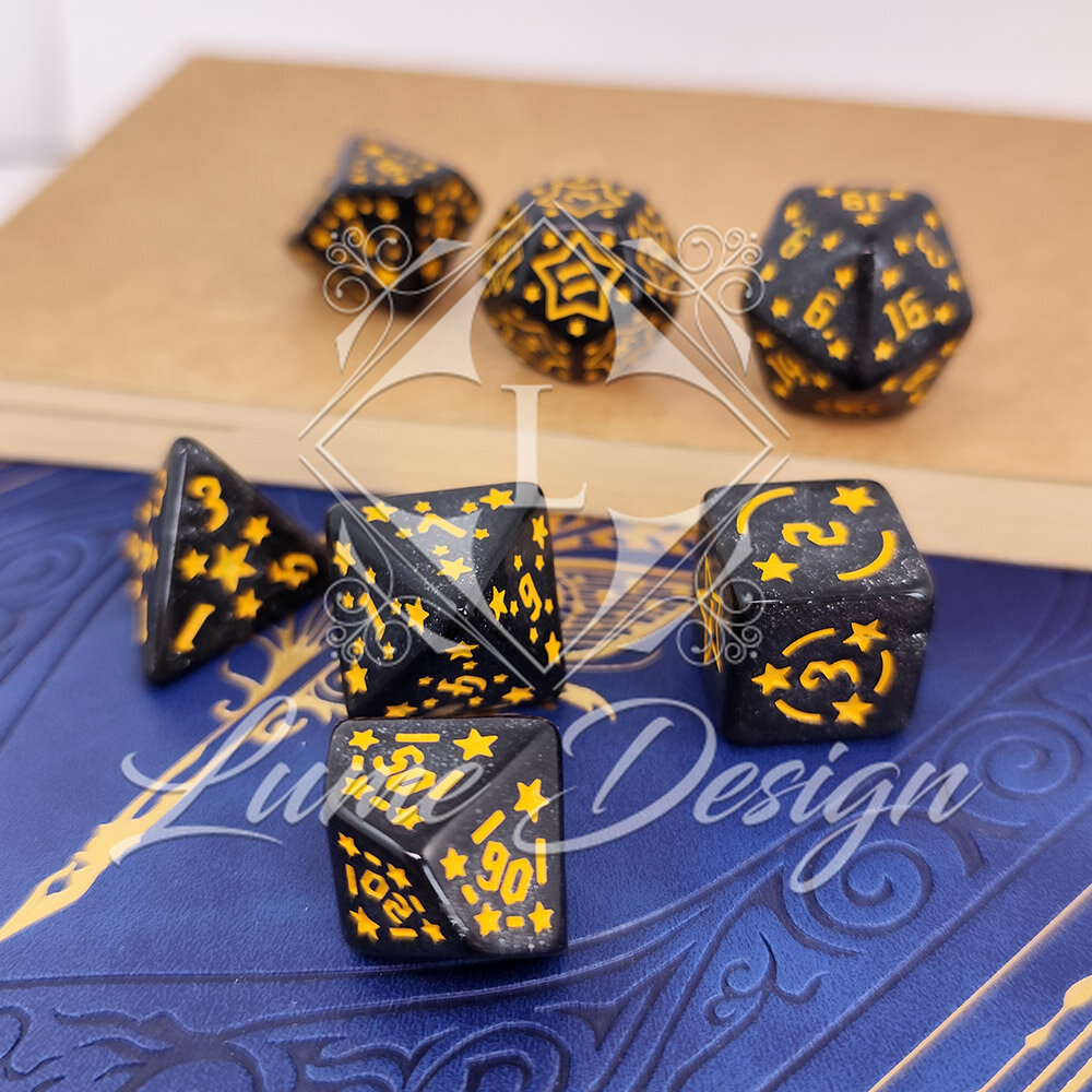 Te kości to kawałek nocnego nieba zamknięty w dłoni. Ciemny, grafitowy materiał rozświetlony jest subtelnym brokatem, przypominającym drogę mleczną, a każda cyfra wpisana jest w wyrazisty symbol gwiazdy. Idealne dla Czarodzieja, Druida lub każdej postaci, która wpatruje się w nocny firmament szukając odpowiedzi.