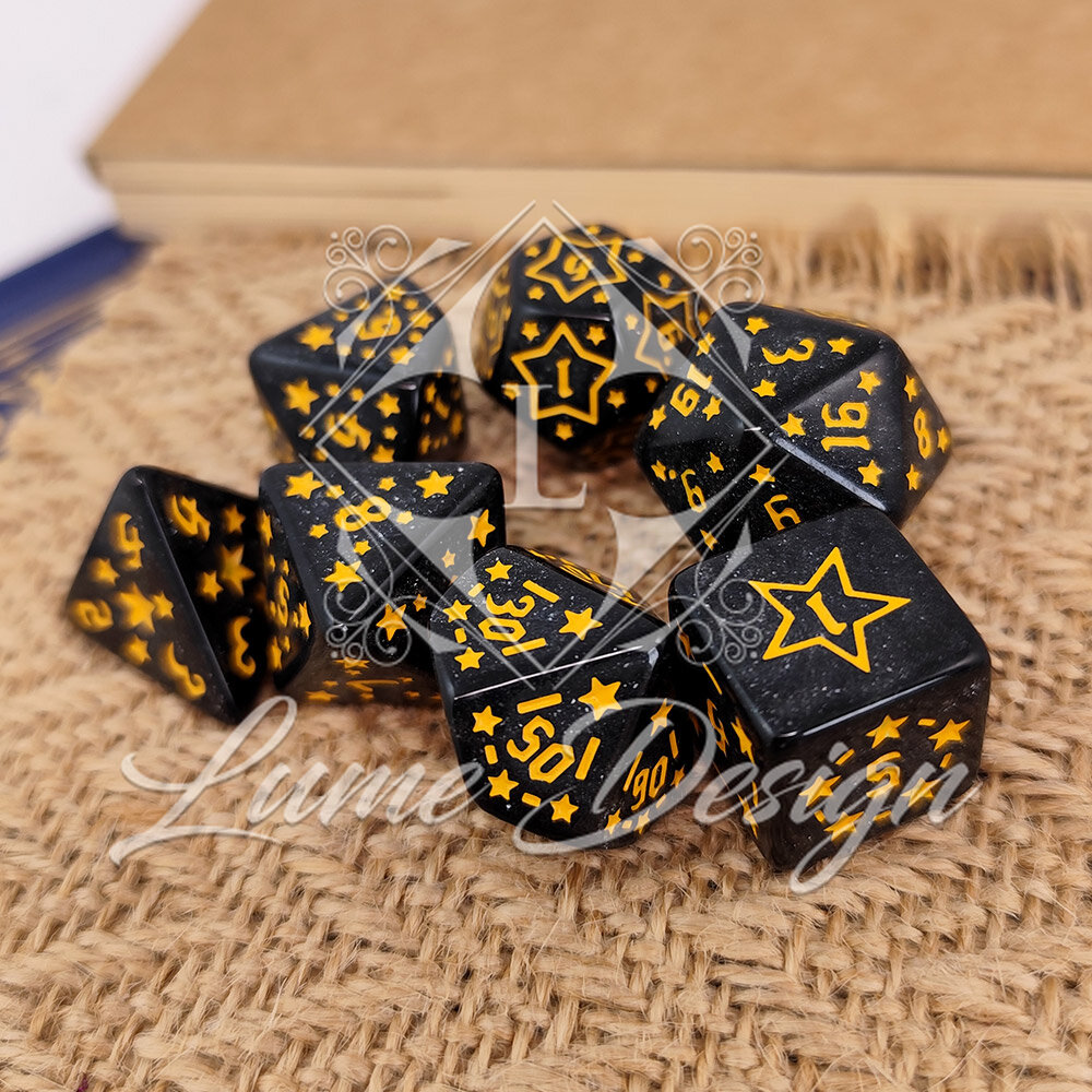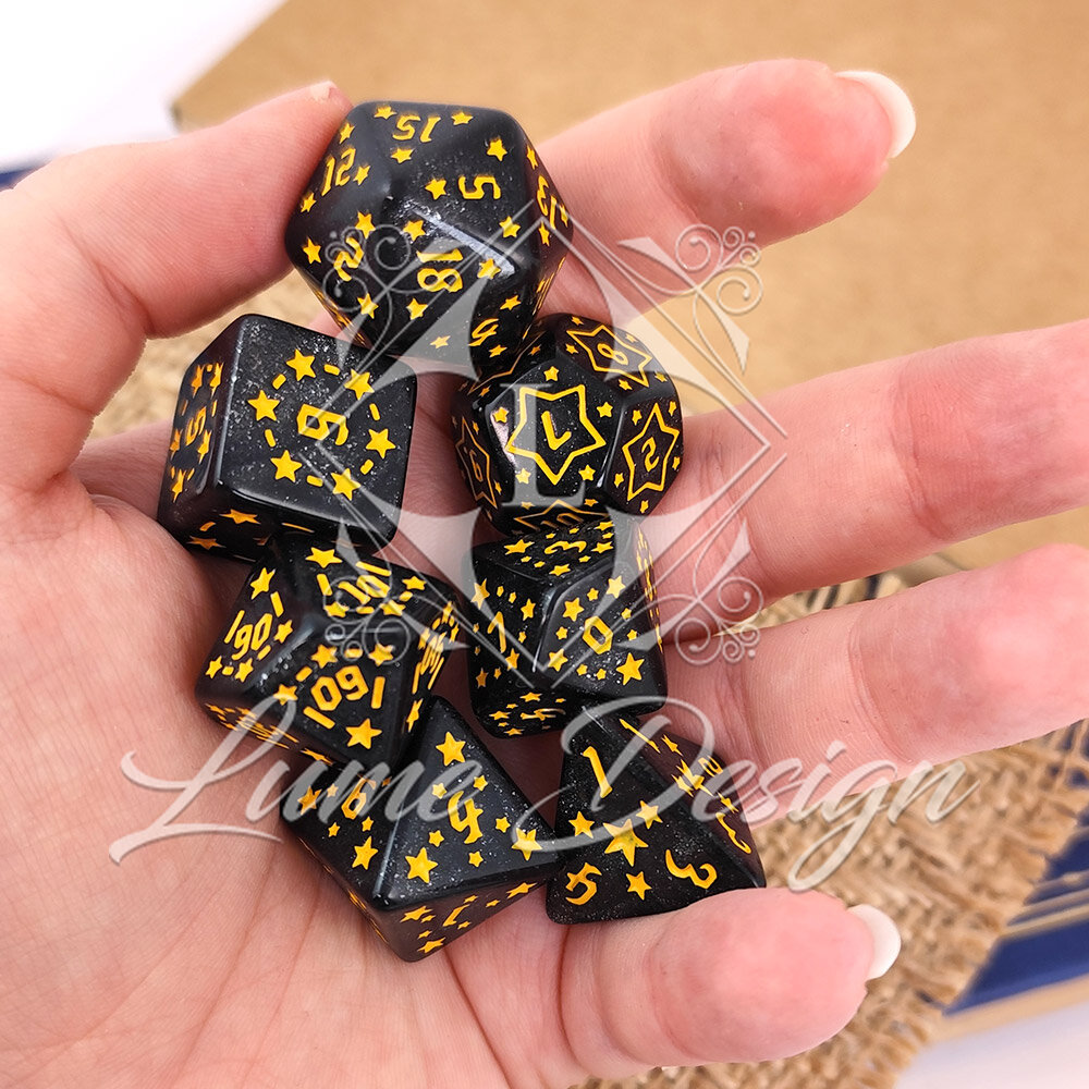 Zestaw Kości RPG Akrylowe Czarne w Gwiazdki Brokat DnD
