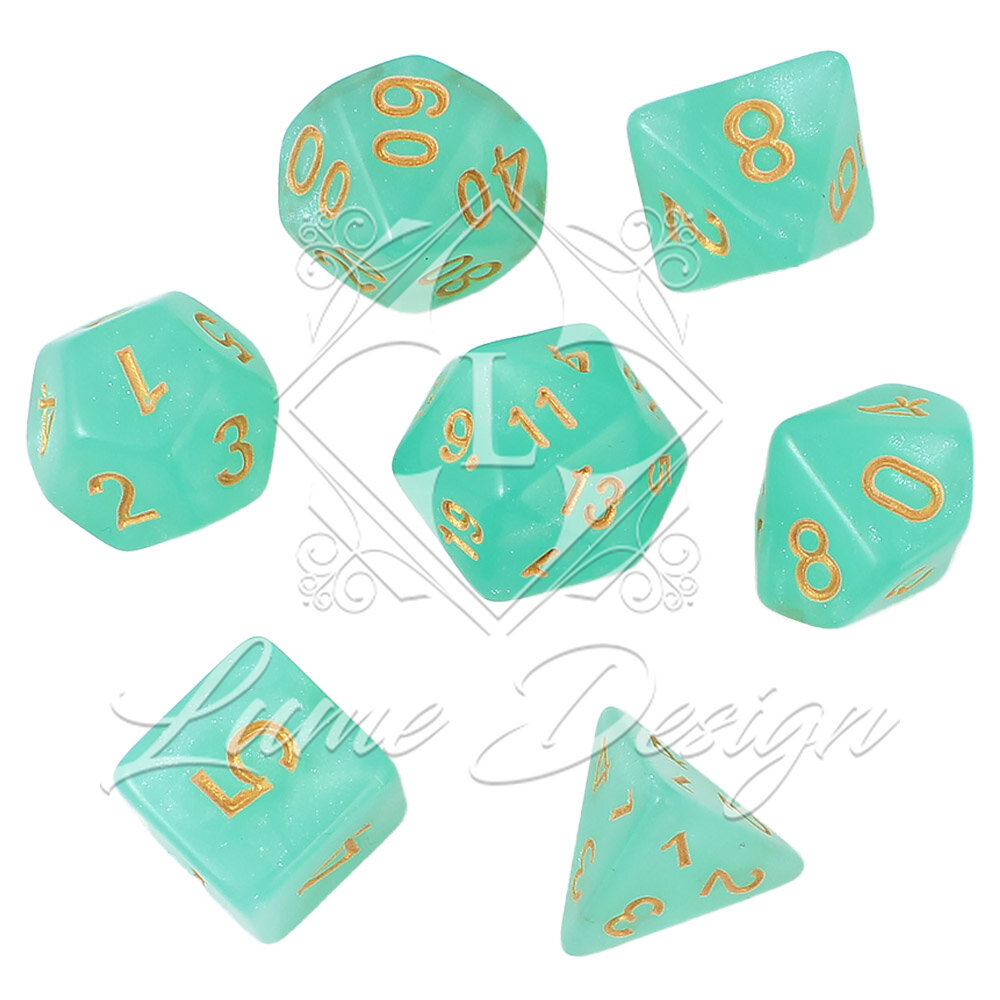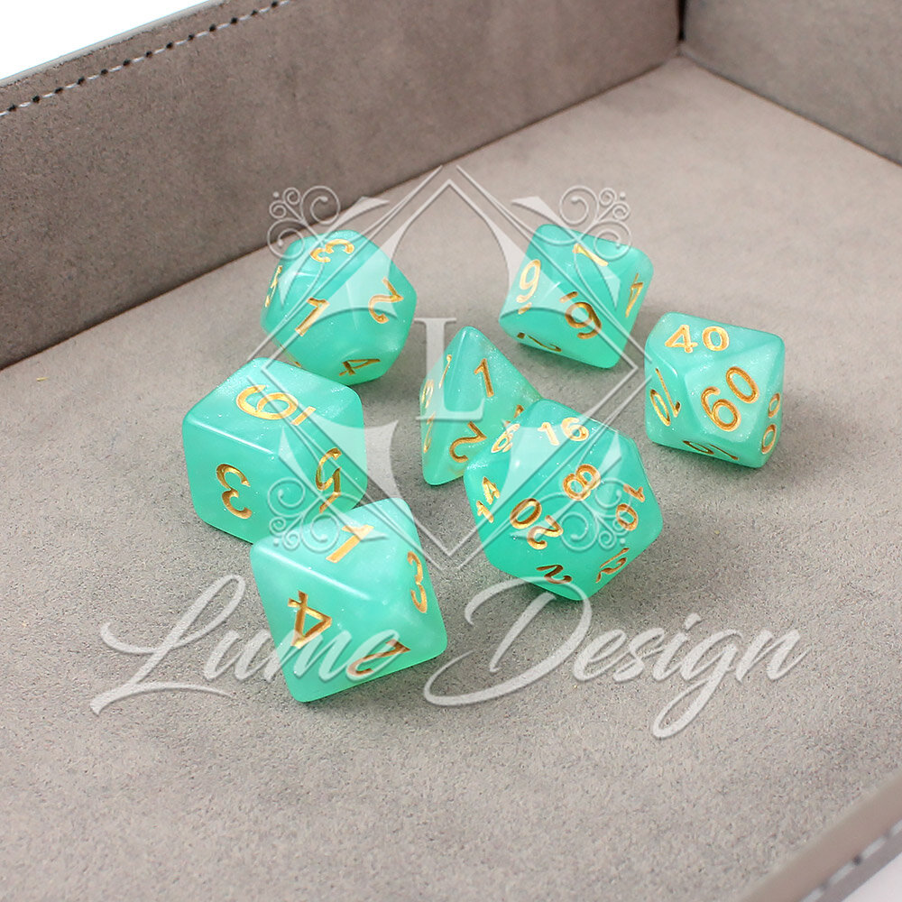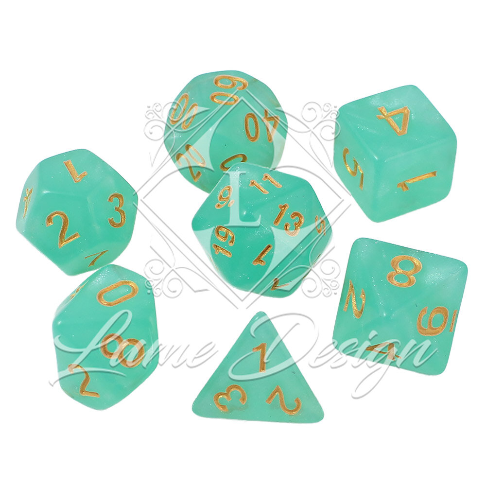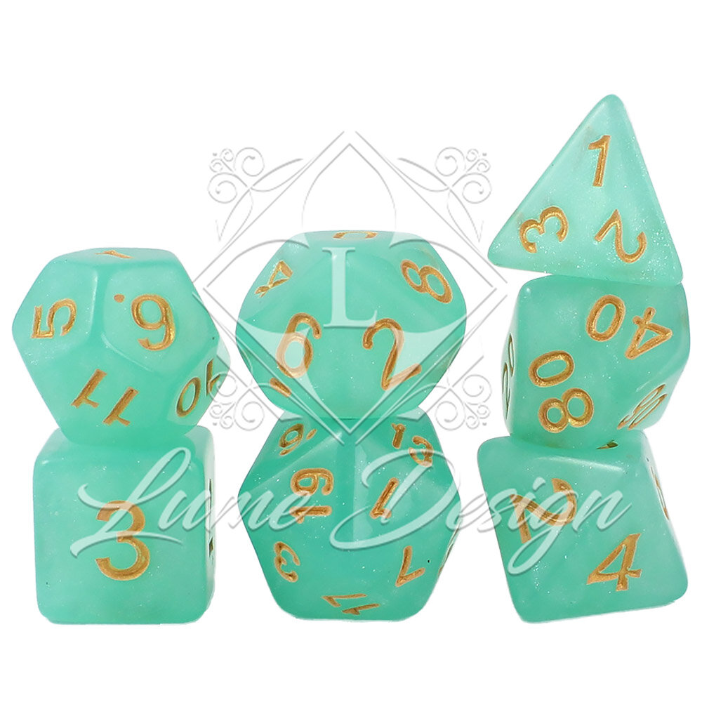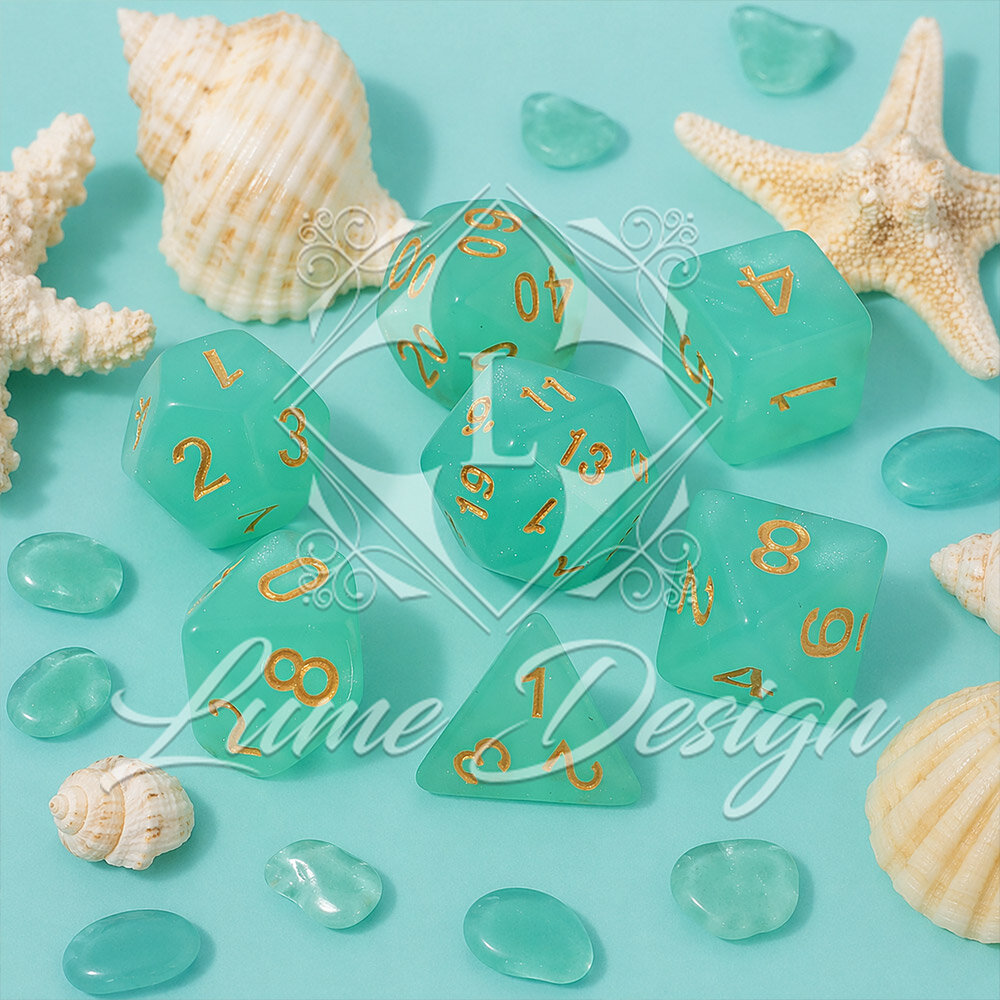 Zestaw zainspirowany jest eterycznymi krainami elfów oraz tajemnicami skrytymi pod powierzchnią wody. Delikatne, lśniące drobinki zawieszone w cyjanowej strukturze akrylu przypominają światło słońca odbijające się w morskiej toni. Złote cyfry dodają całości elegancji i sprawiają, że kości wyglądają jak artefakty wyciągnięte prosto ze skarbca mitycznej Syreny. To idealny wybór dla graczy, którzy cenią klasyczną estetykę w świeżym, kojącym wydaniu.