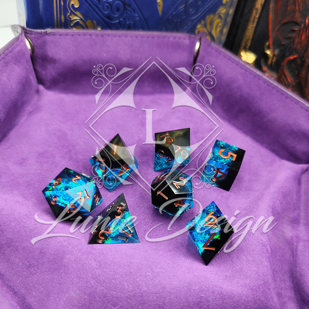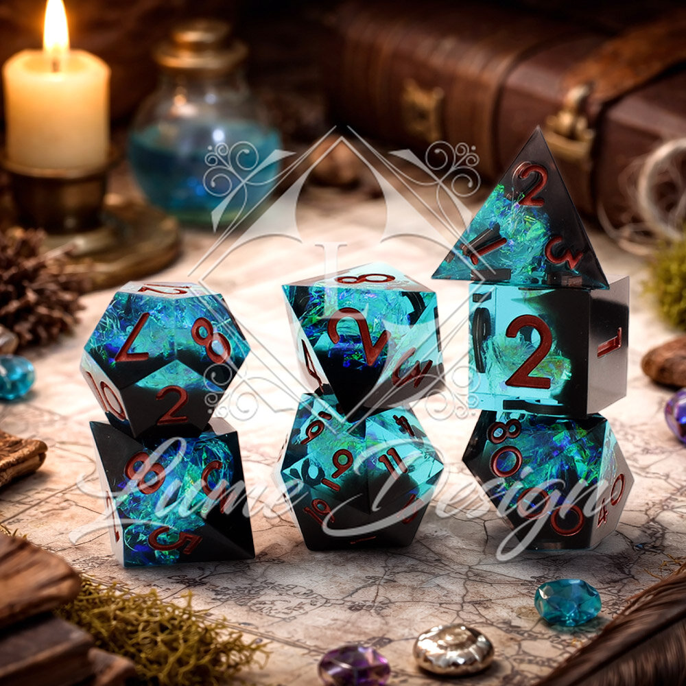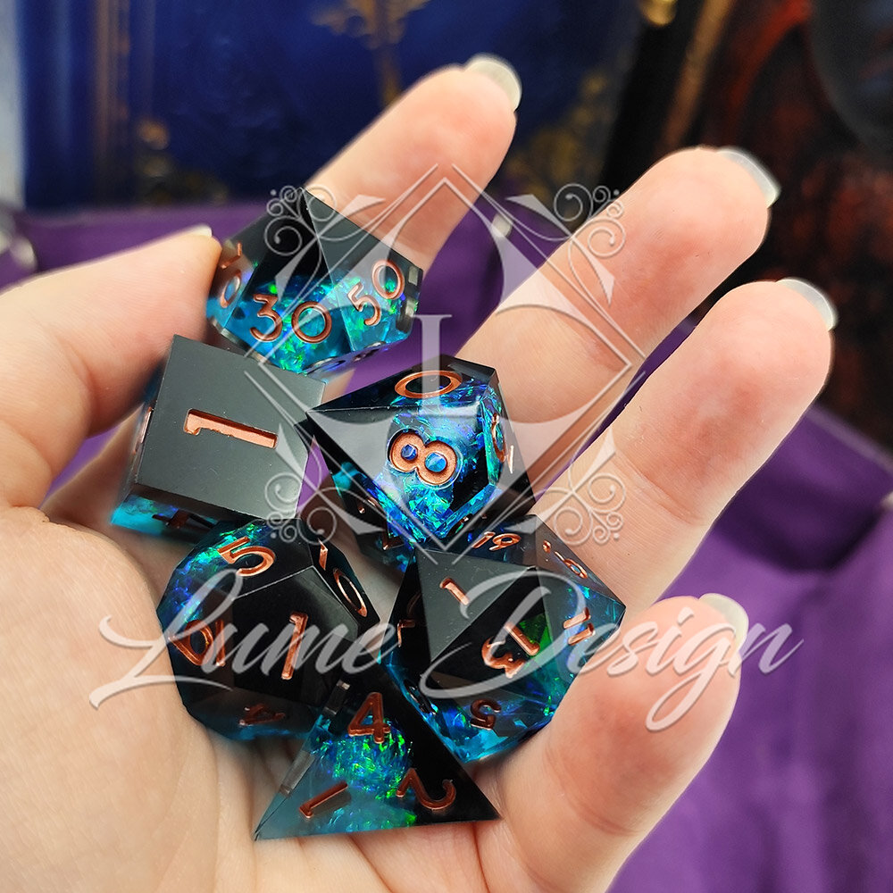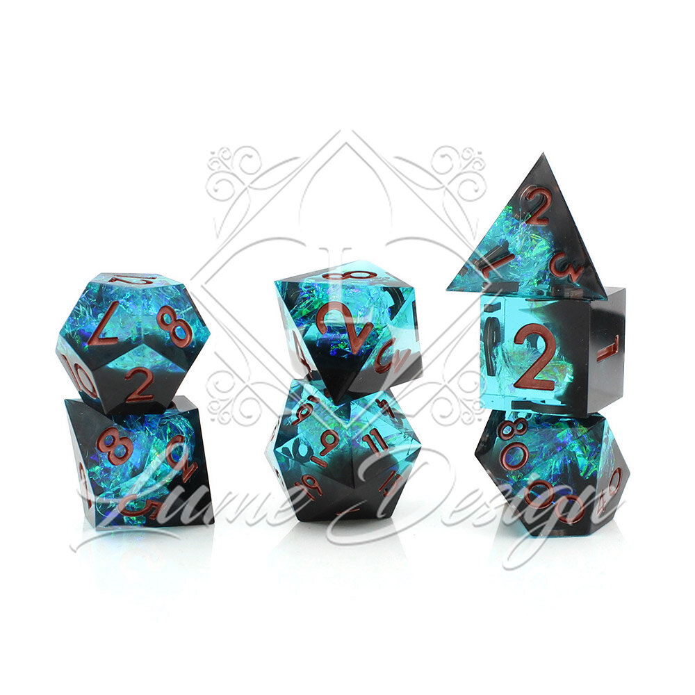 Celestial Shard to zestaw kości RPG inspirowanych fragmentem magicznego kryształu. Wnętrze kości mieni się wielobarwnym, pryzmatycznym światłem, które zmienia się w zależności od kąta i oświetlenia. Kości stworzone dla tych, którzy lubią wyjątkowe i efektowne akcesoria do gry.