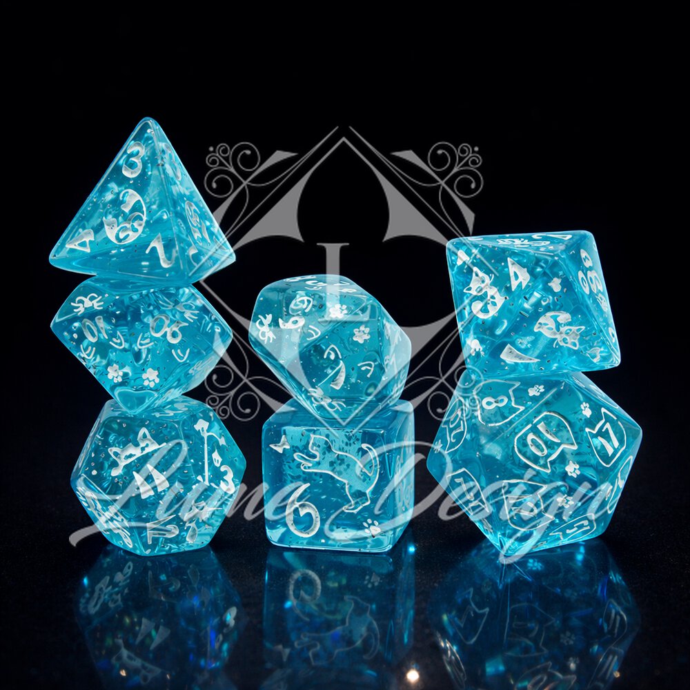 Cat Magic Dice to komplet wielościennych kości RPG z uroczym motywem kotów. Błękitna, transparentna forma oraz delikatnie mieniące się wnętrze sprawiają, że kości są lekkie wizualnie, radosne i wyjątkowo przyjemne w odbiorze.