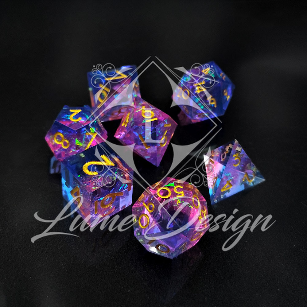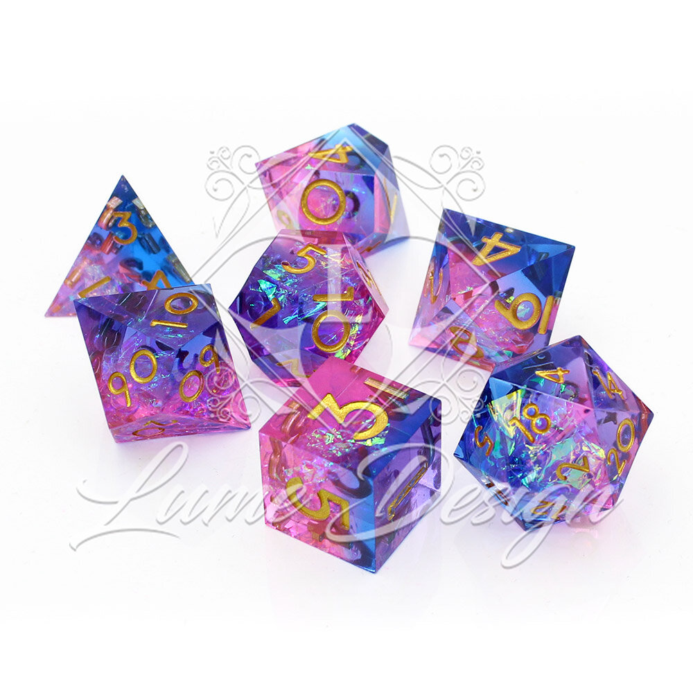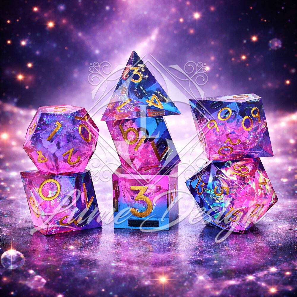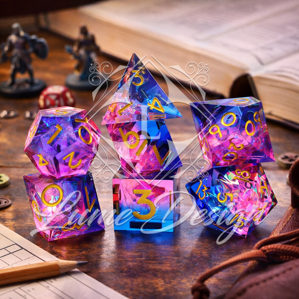 Prismatic Aura to zestaw kości RPG o magicznym, pryzmatycznym efekcie. Wnętrze kości mieni się wielobarwnymi refleksami, które zmieniają się w zależności od światła i kąta patrzenia. Połączenie różu, błękitu i tęczowego blasku nadaje zestawowi fantastyczny, niemal eteryczny charakter.