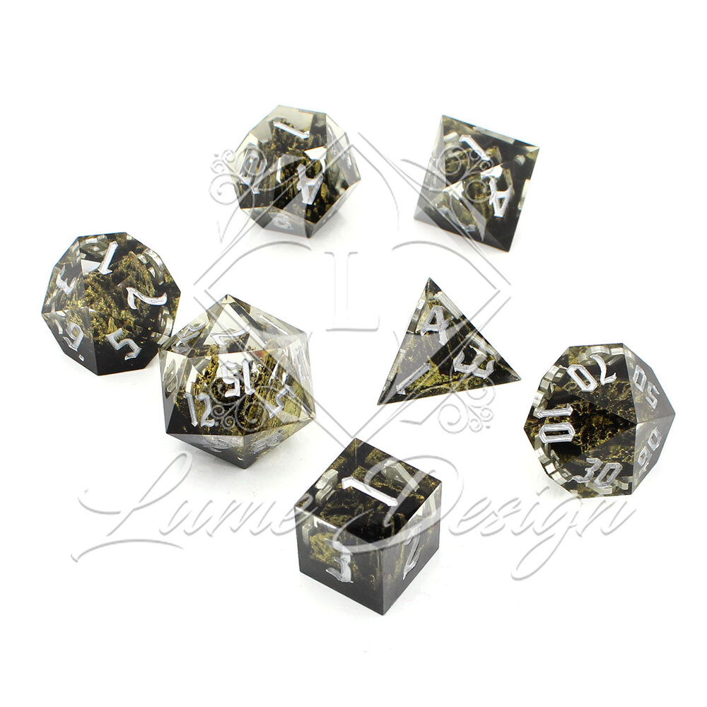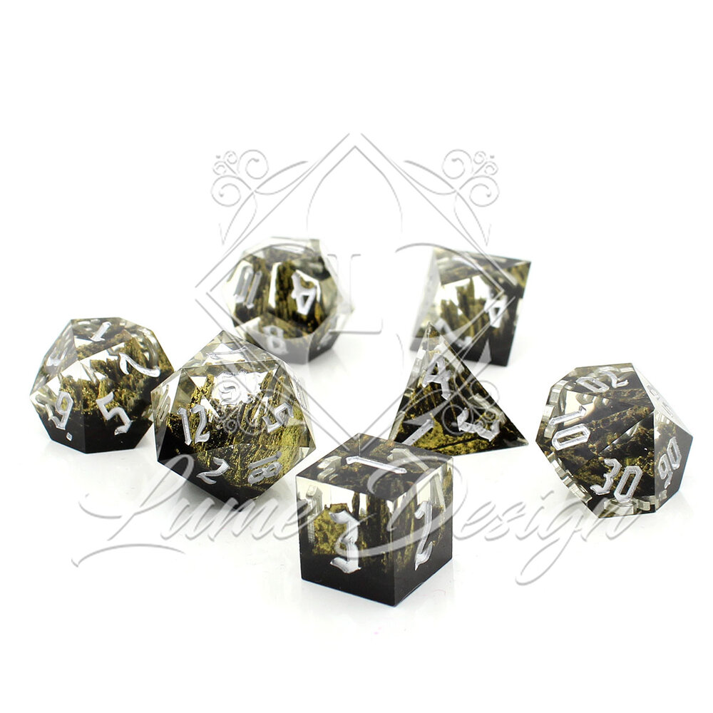 Golden Forest Core to zestaw kości RPG inspirowanych pradawnym lasem i naturą zaklętą w żywicy. Wewnątrz każdej kości znajdują się fragmenty drewna, które tworzą unikalny, organiczny wzór — jakby kawałek magicznego lasu został zamknięty w artefakcie. Transparentno-czarna struktura z subtelnymi złotymi tonami nadaje zestawowi elegancki i naturalny charakter premium.