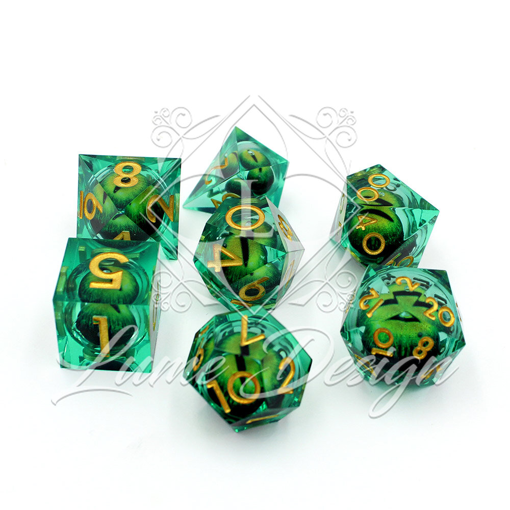 Eye of the Dragon to zestaw wielościennych kości RPG wykonanych z żywicy, z efektem liquid core. Wewnątrz każdej kości znajduje się ruchome oko, które porusza się podczas rzutu.