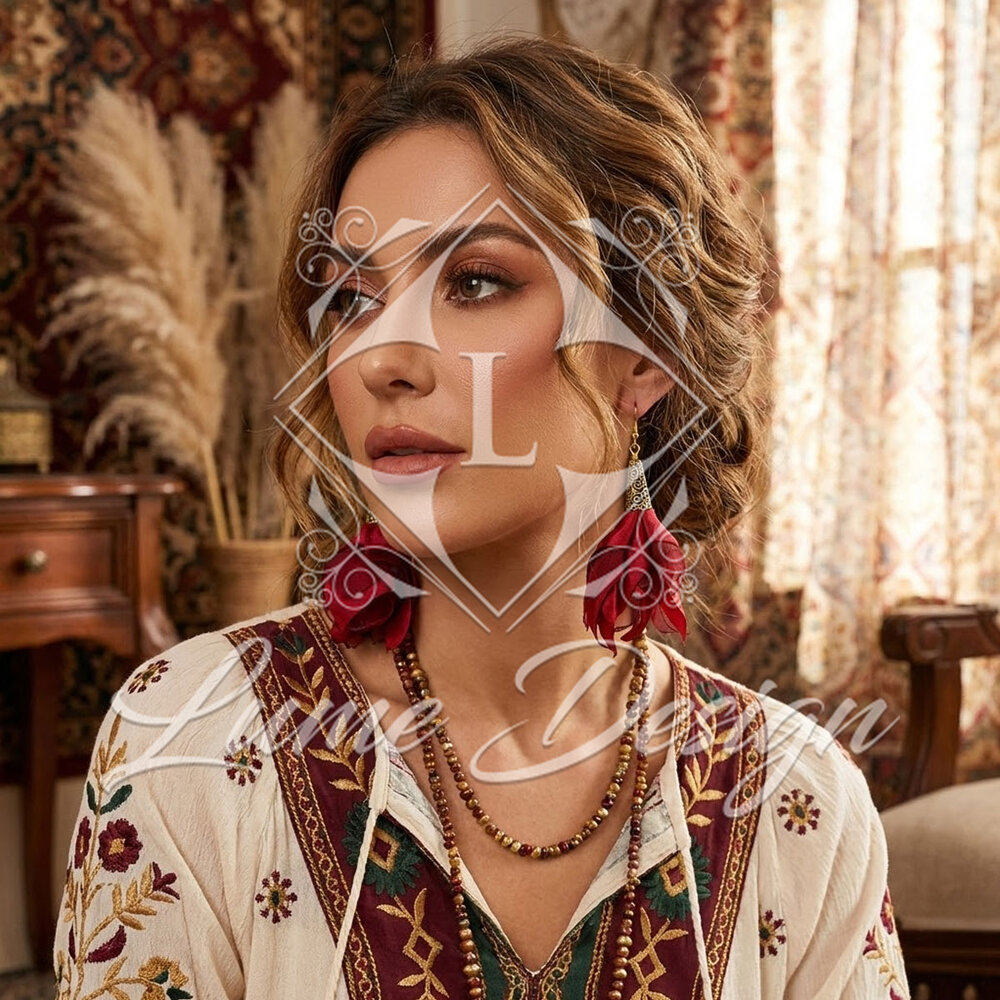 Ręcznie robiona biżuteria, która przyciąga wzrok intensywną kolorystyką i zdecydowaną formą. Model ten łączy odcienie czerwieni z elementami w kolorze antycznego złota, tworząc elegancki dodatek o barokowym charakterze.