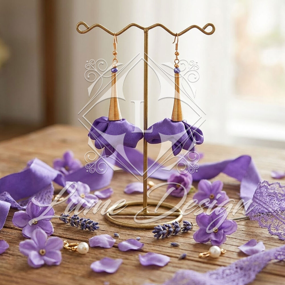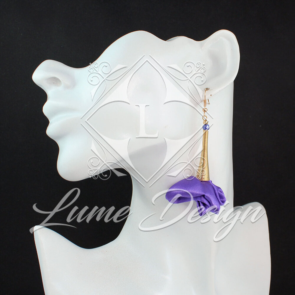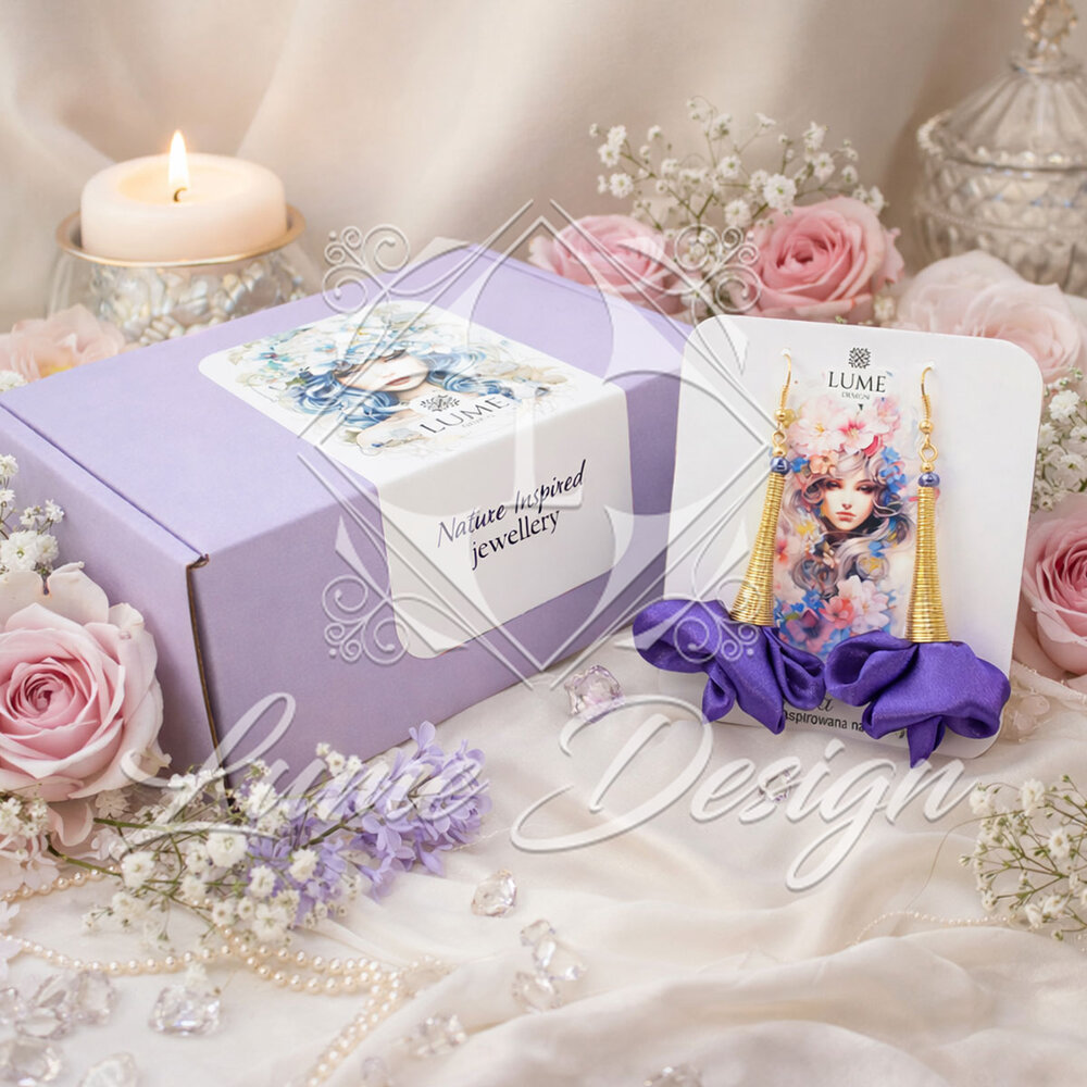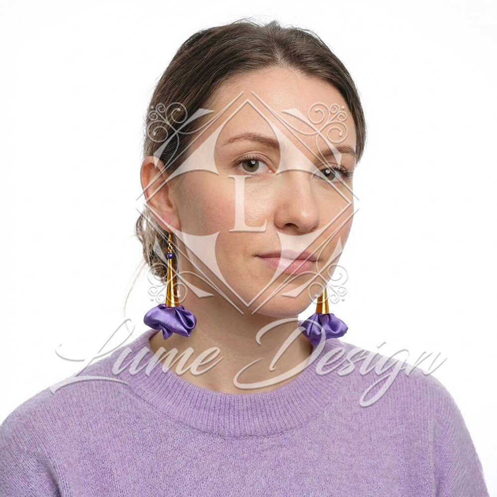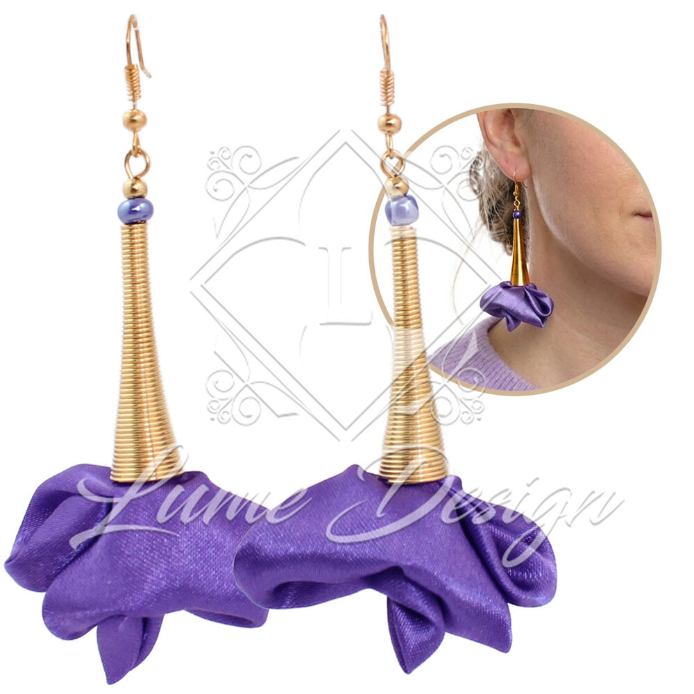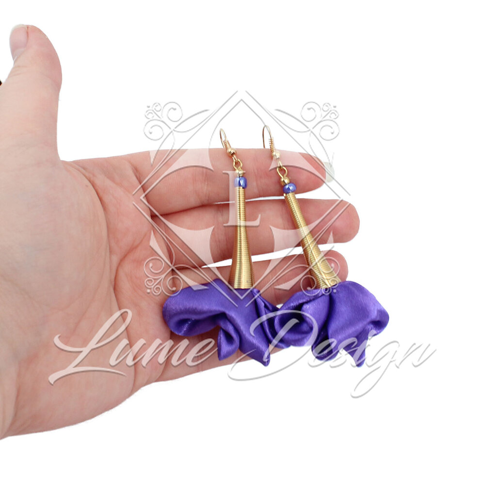 Długie Kolczyki Kwiaty Fioletowe Satynowe Złote Bigle Lekkie