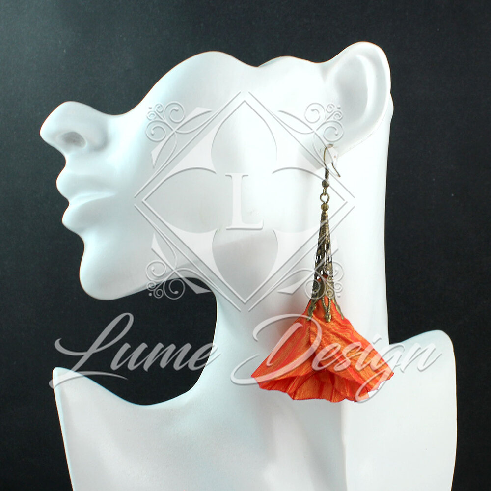 Ręcznie robiona biżuteria, która emanuje ciepłem i energią. Model ten został wykonany z nieco sztywniejszej tkaniny w kolorze pomarańczowym z żółtym połyskiem, co sprawia, że płatki pięknie mienią się w świetle i utrzymują swój unikatowy kształt. Całość dopełnia wykończenie w kolorze antycznego brązu, nadające biżuterii szlachetnego charakteru w stylu vintage.