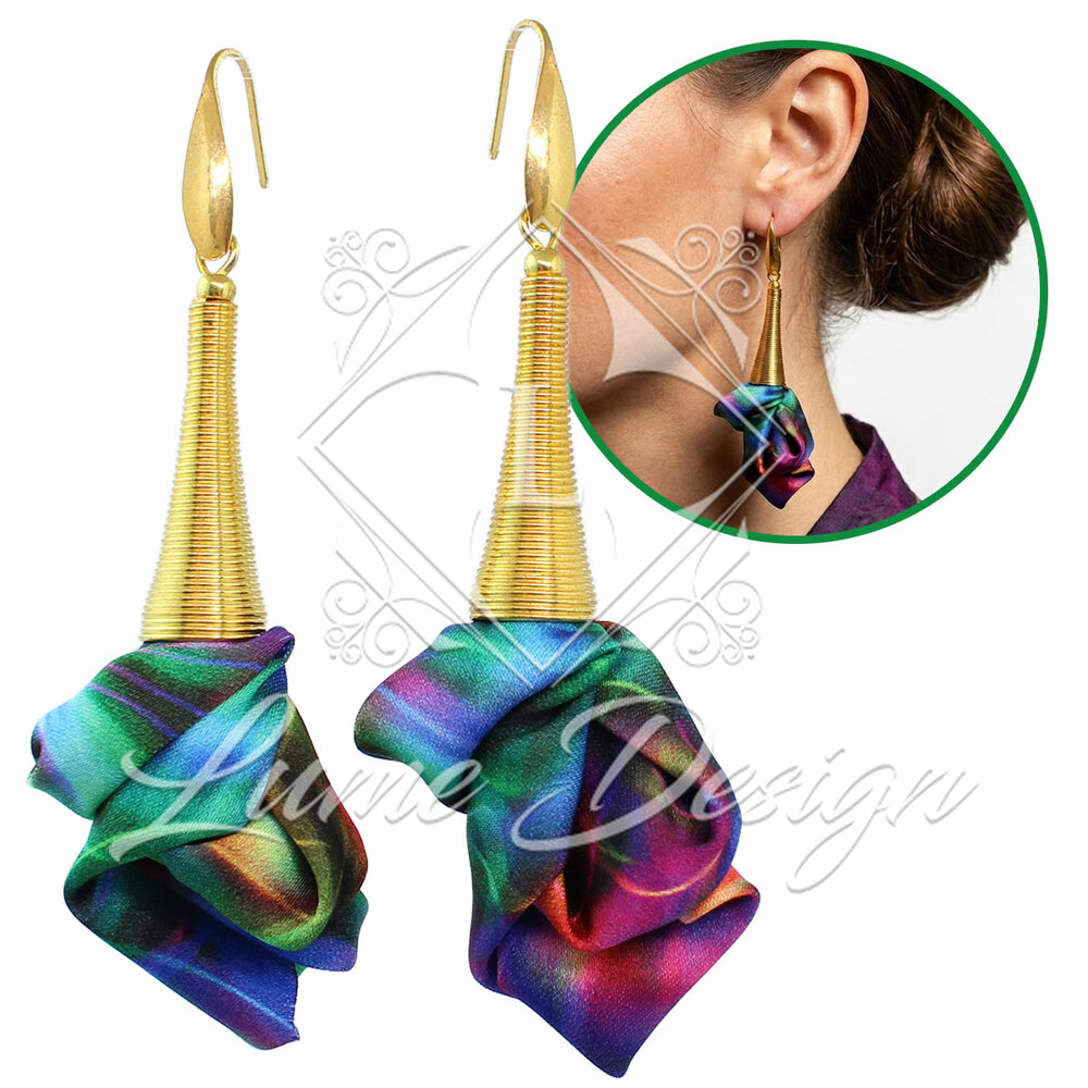 Ręcznie robiona biżuteria stworzona dla kobiet, które kochają wyróżniać się unikatowymi dodatkami. Kolczyki zostały wykonane z wielobarwnej tkaniny o nasyconych odcieniach. Ze względu na specyfikę materiału i proces ręcznego tworzenia, każda para posiada swój indywidualny, niepowtarzalny układ barw – poszczególne kolczyki mogą różnić się od siebie przewagą konkretnych kolorów.