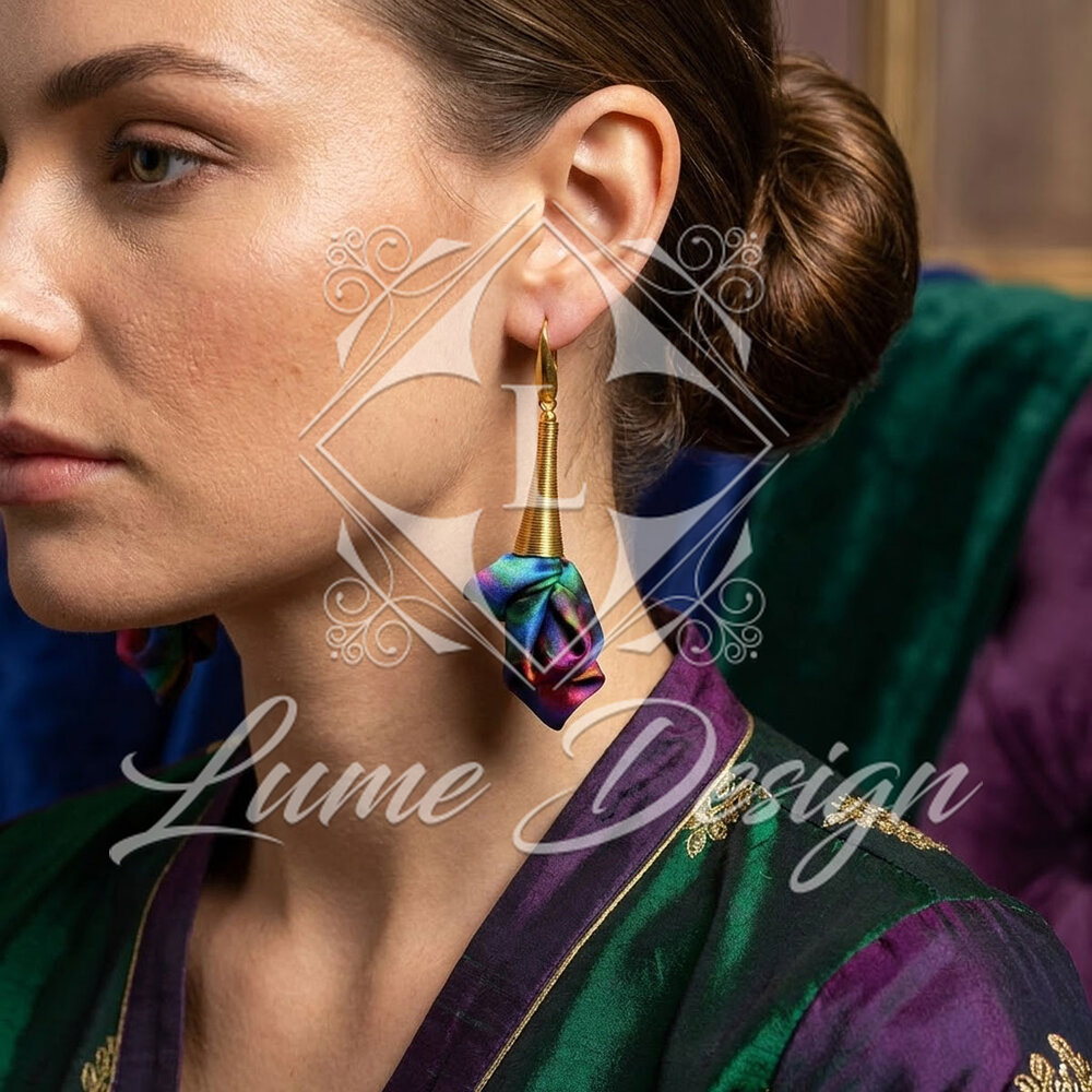 Ważne: Każda para jest jedyna w swoim rodzaju. Otrzymany produkt może różnić się rozkładem kolorów od modelu prezentowanego na zdjęciu, co jest naturalną cechą biżuterii tworzonej z barwionej tkaniny.