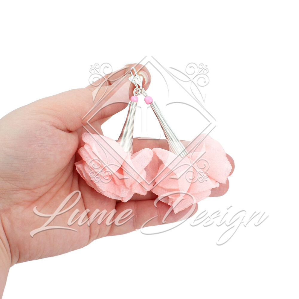 Ręcznie robiona biżuteria, która łączy w sobie subtelność pastelowych barw z eleganckim, srebrnym wykończeniem. Wyjątkowo zwiewna tkanina w odcieniu pudrowego różu sprawia, że kolczyki są eteryczne i niemal niewyczuwalne podczas noszenia, stanowiąc jednocześnie wyrazisty element stylizacji.