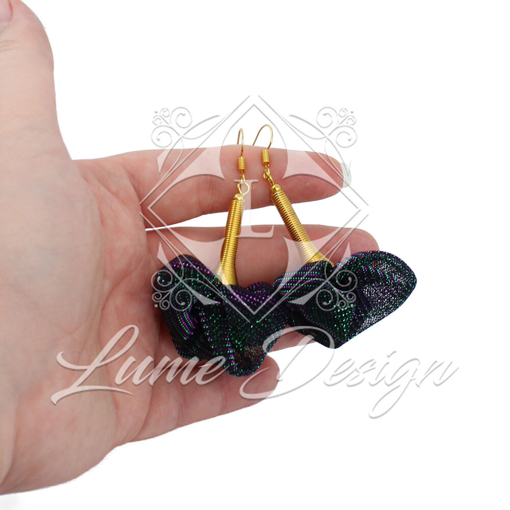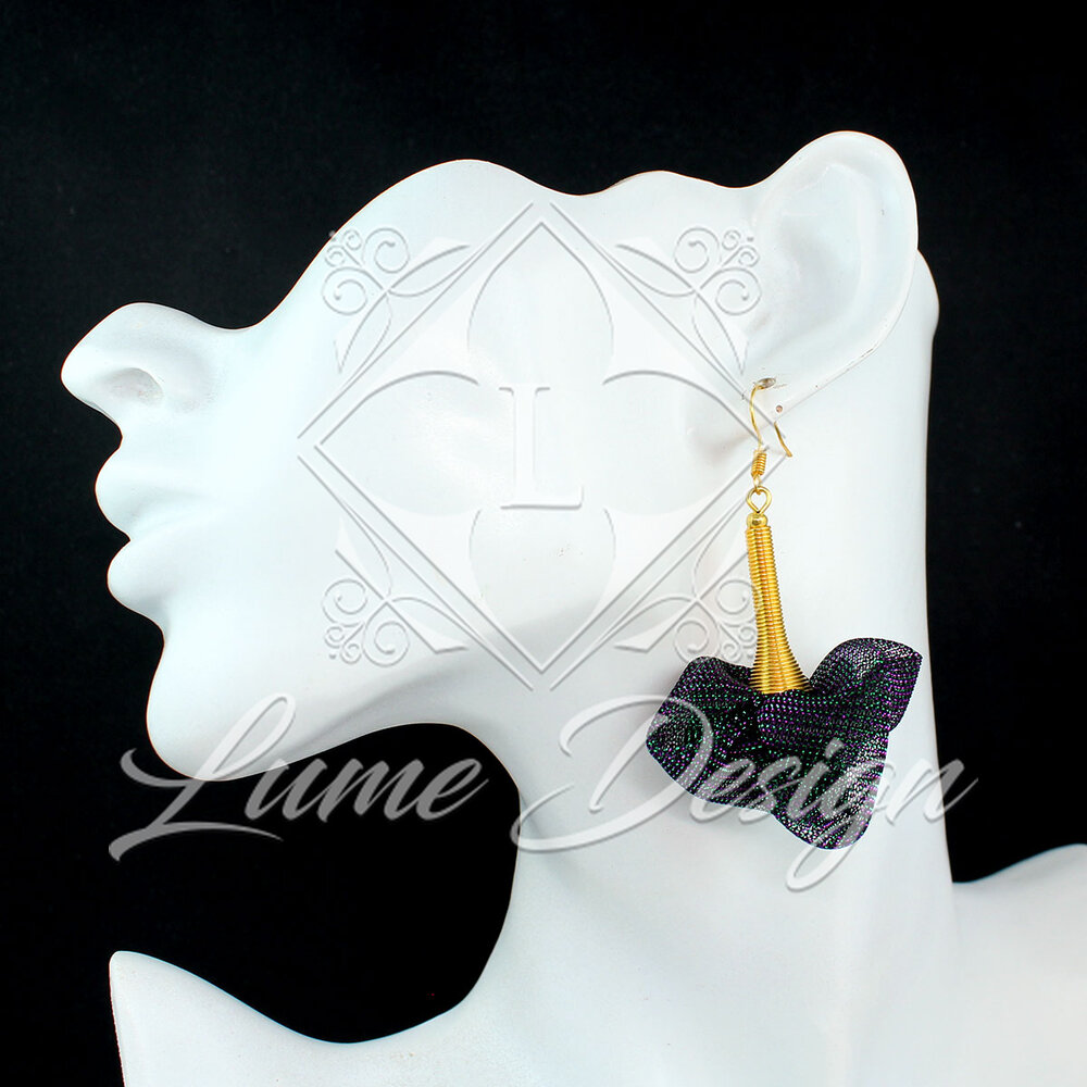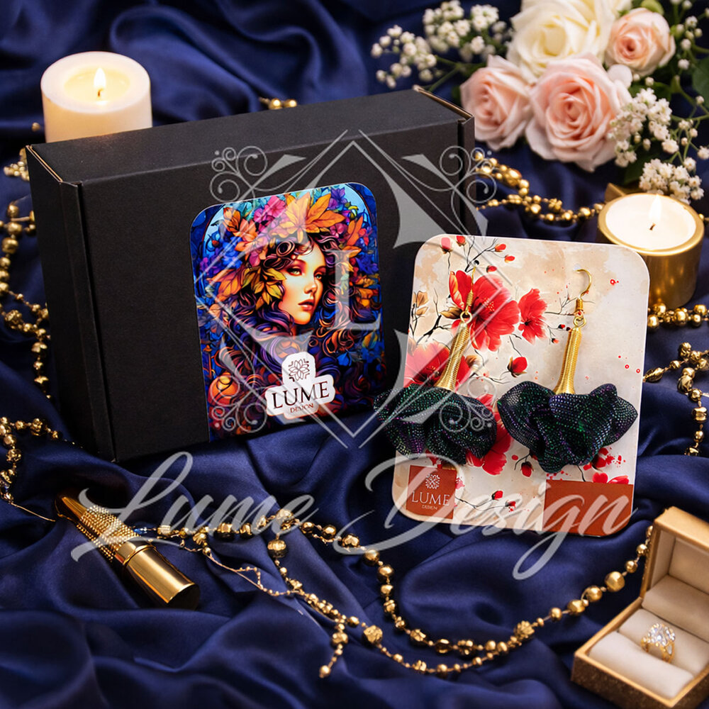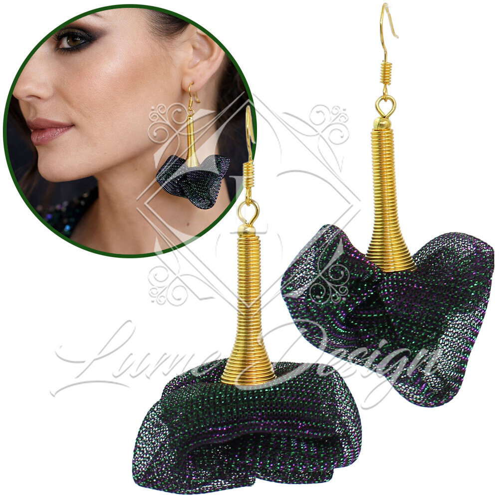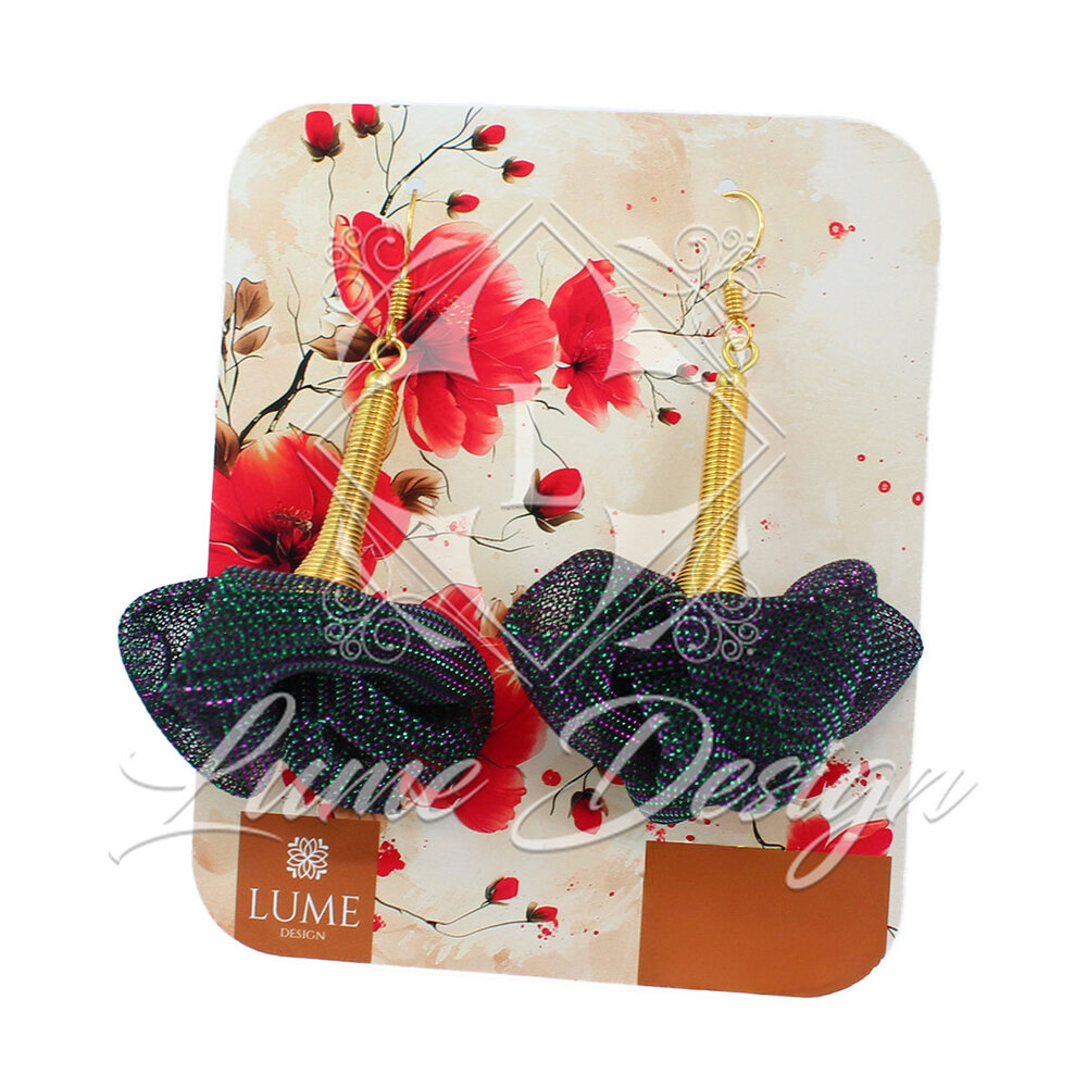 Ręcznie robiona biżuteria od Lume Design, stworzona z unikatowej tkaniny o strukturze siateczki. Materiał ten intryguje nieoczywistą grą barw – mieni się między głęboką, leśną zielenią a tajemniczym fioletem, a wpleciona błyszcząca nitka dodaje całości subtelnego rozświetlenia.