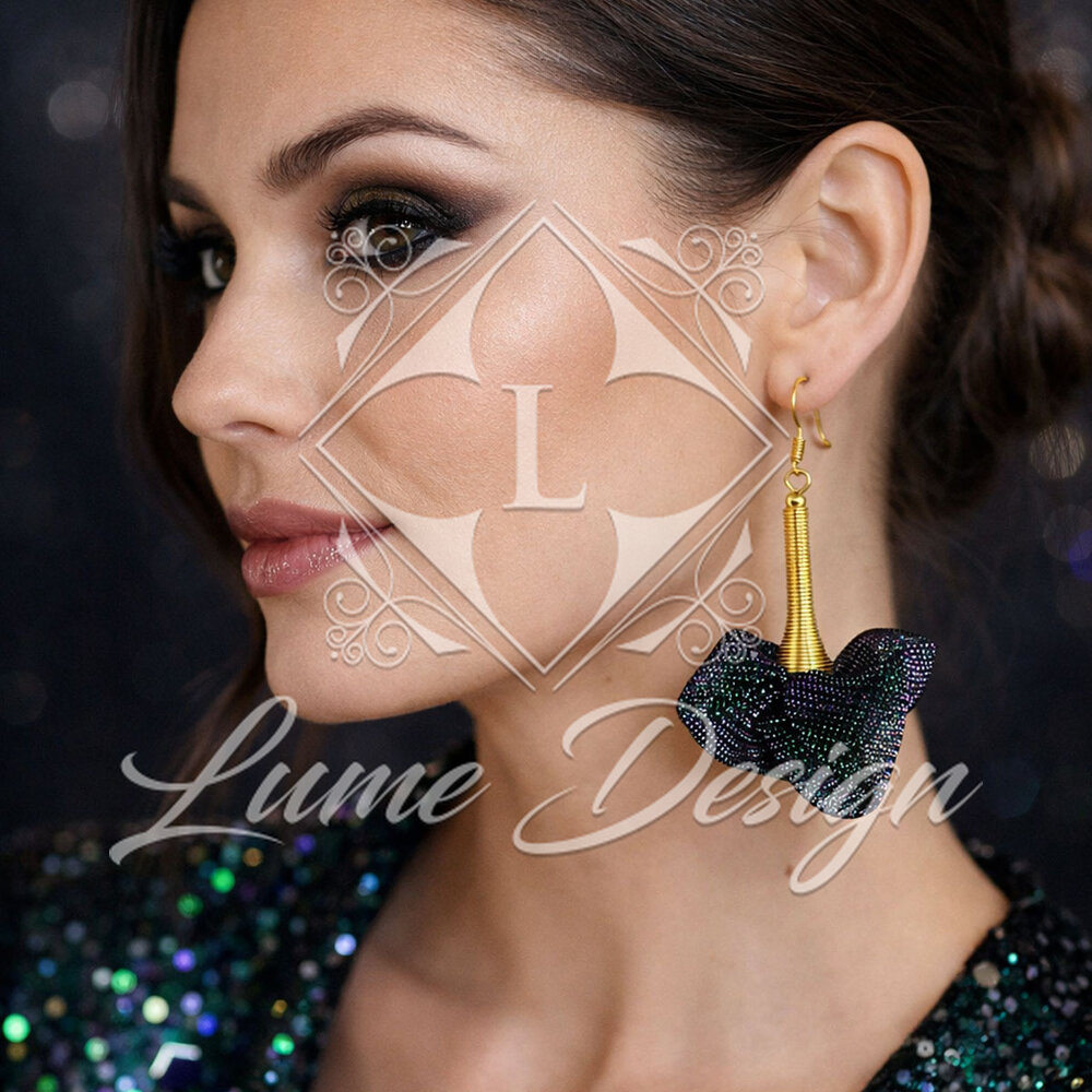 Długie Kolczyki Kwiaty Zielone Fioletowe Mieniące Złote Bigle