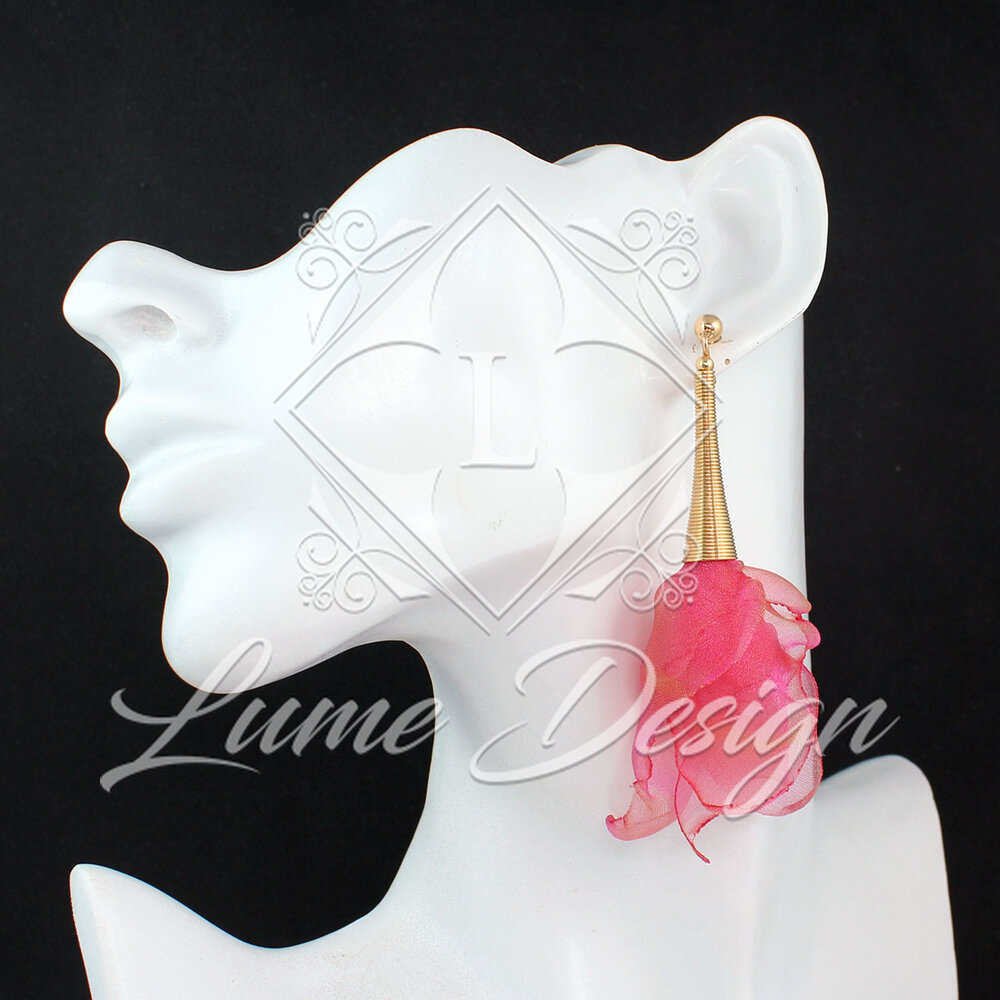 Ręcznie robione kolczyki z delikatnej, zwiewnej tkaniny o wielokolorowym połysku. W świetle pojawiają się odcienie pomarańczu, czerwieni, różu i żółci.