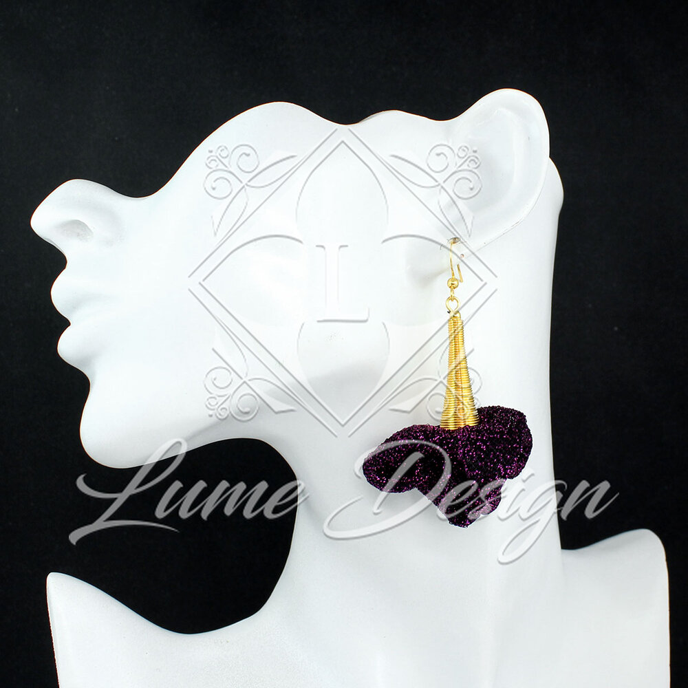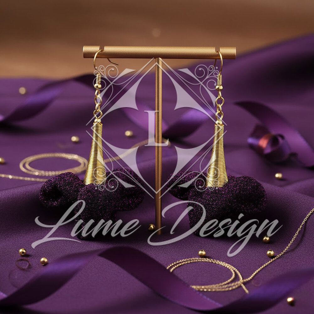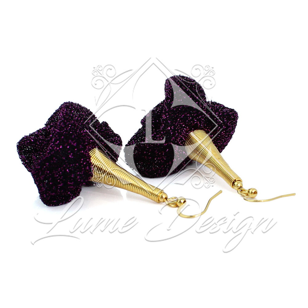 Ręcznie wykonane kolczyki z delikatnej, lekkiej tkaniny w kolorze ciemnego fioletu, która subtelnie mieni się w świetle.
