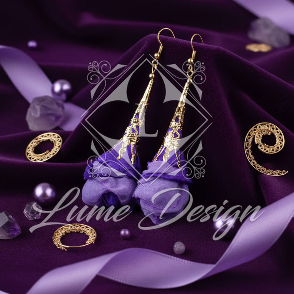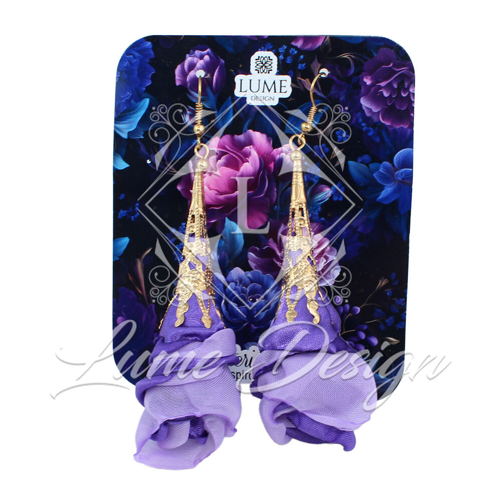 Kolczyki wiszące długie fioletowe ażurowe kwiaty z tkaniny złote