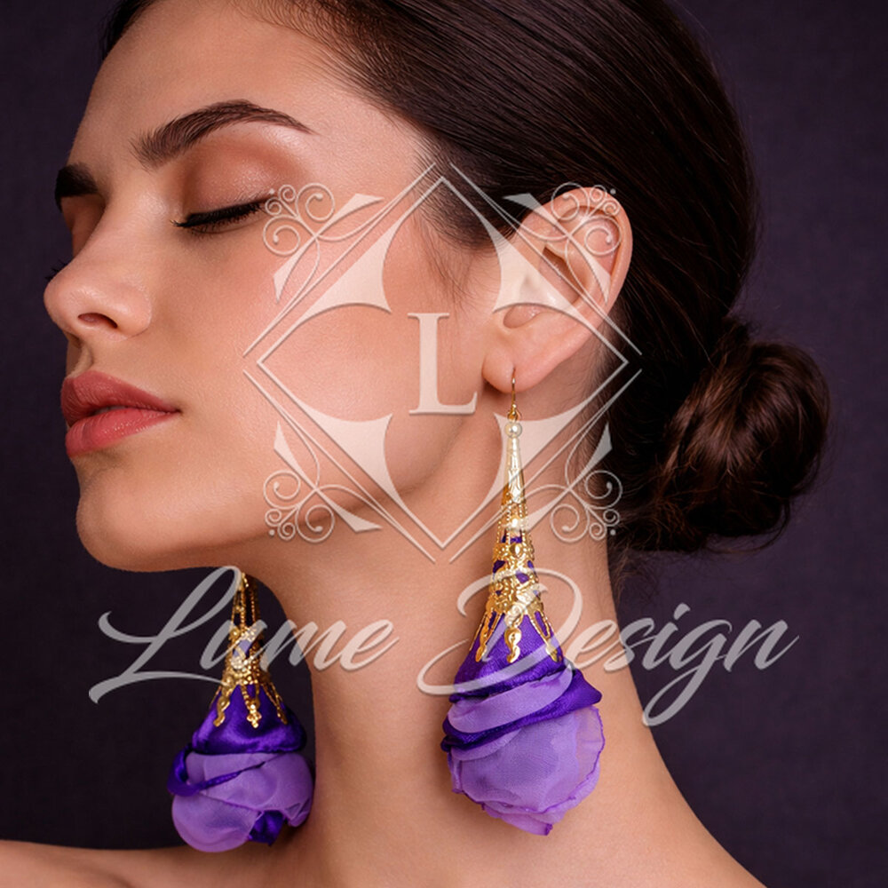 Ręcznie wykonane kolczyki z lekkiej tkaniny, układającej się w miękkie, warstwowe płatki kwiatów.