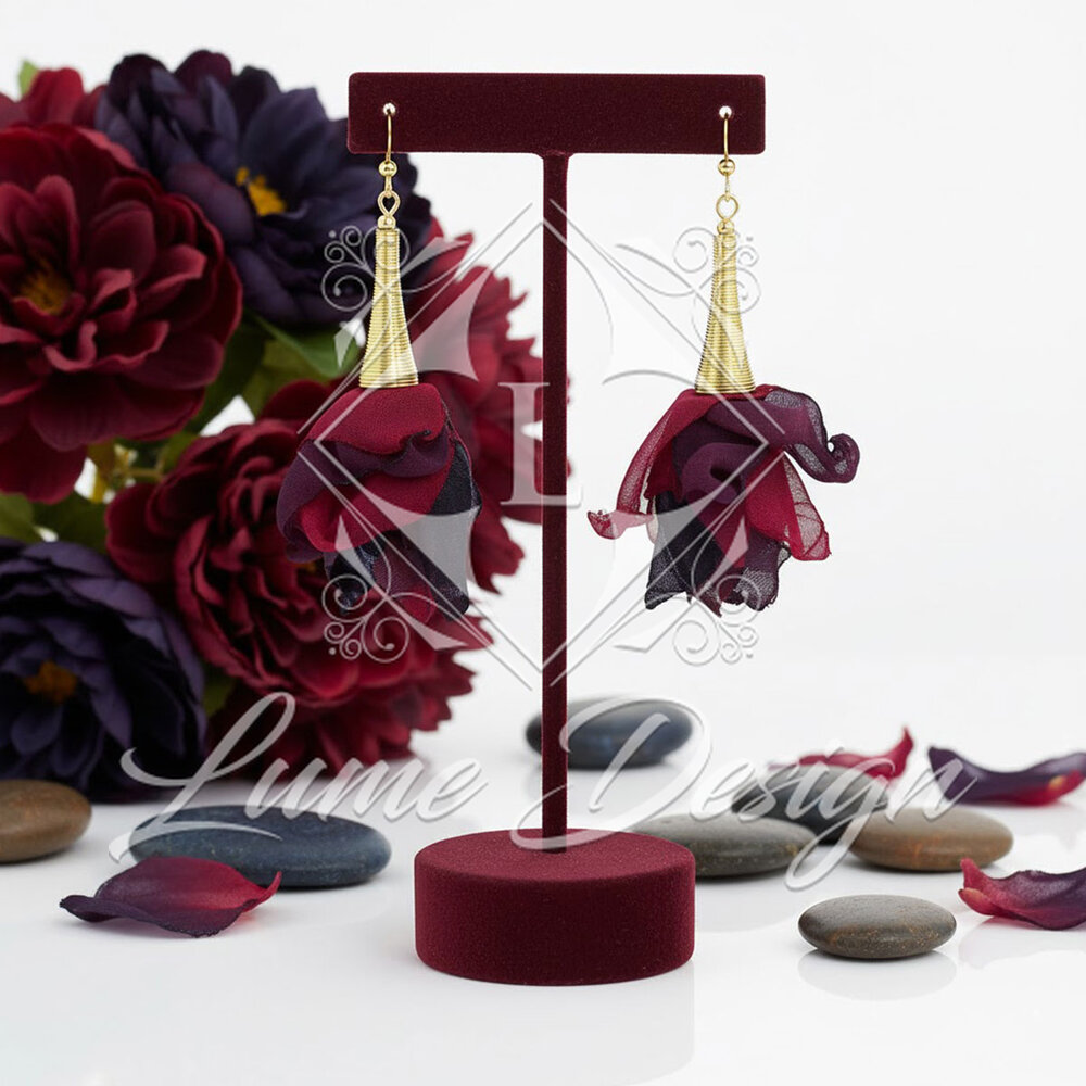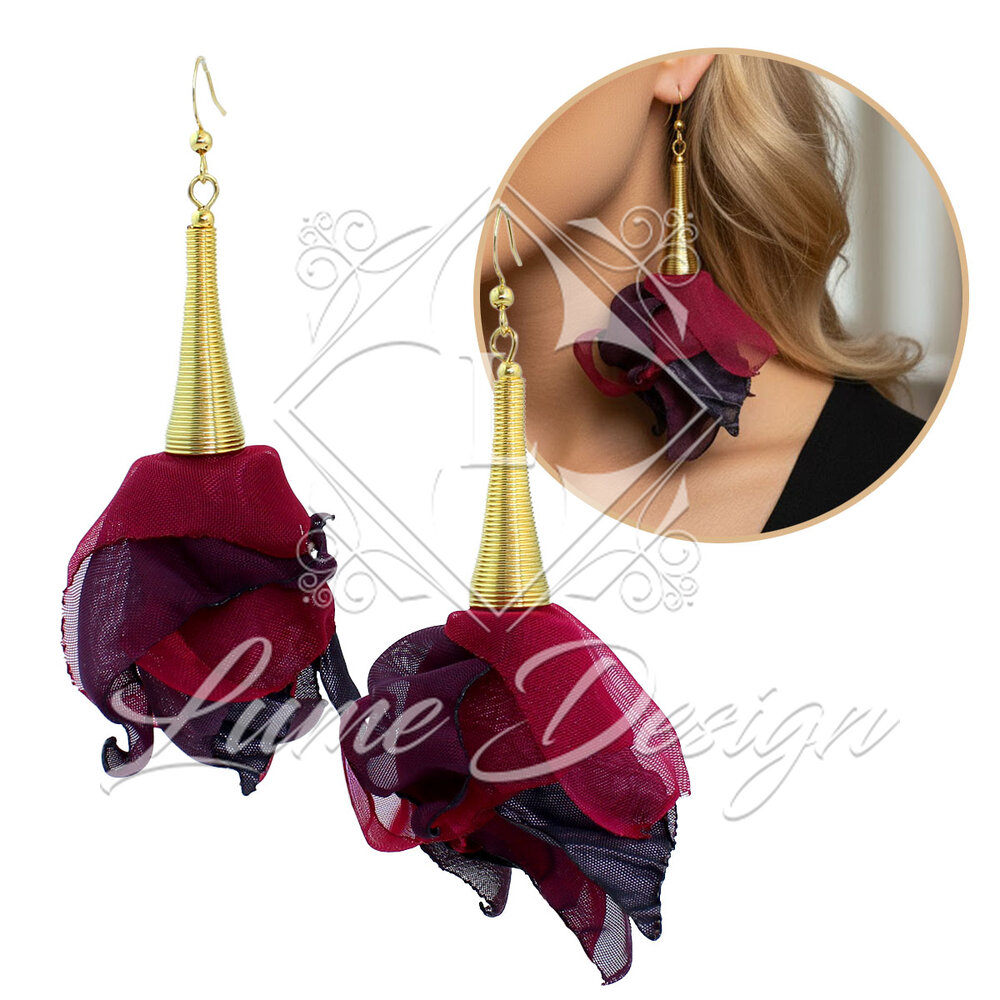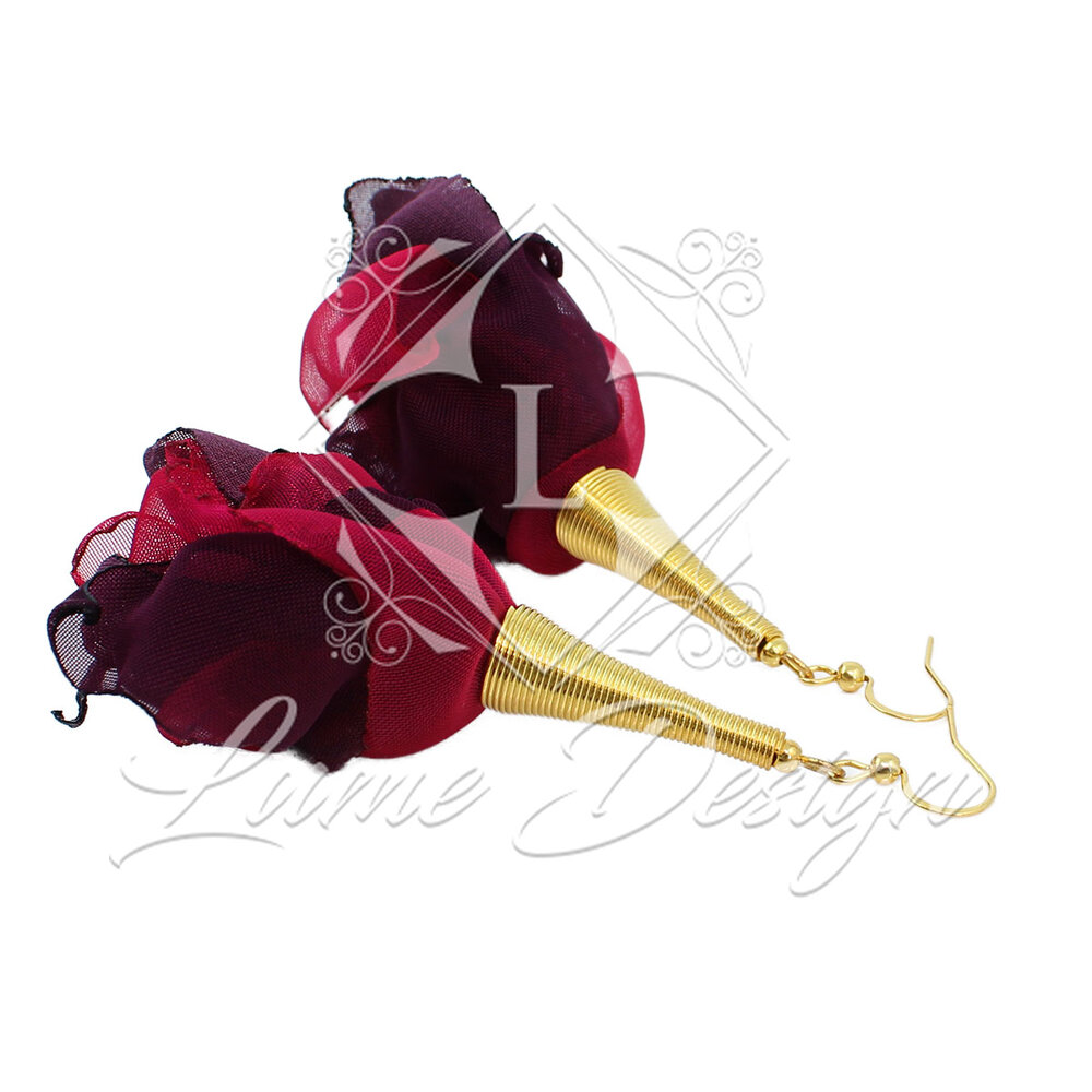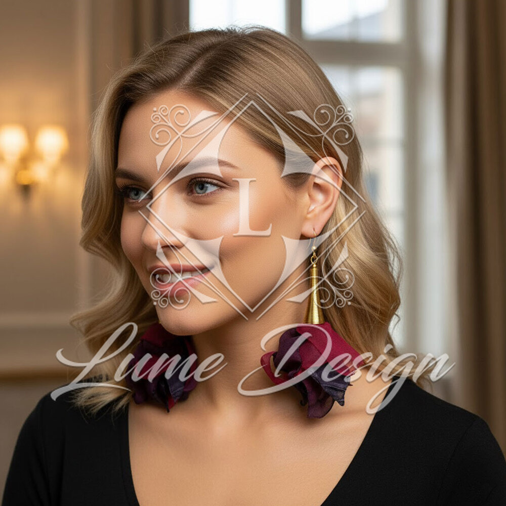 Ręcznie wykonane kolczyki z delikatnej, lekkiej tkaniny układającej się w miękkie, warstwowe płatki kwiatów.