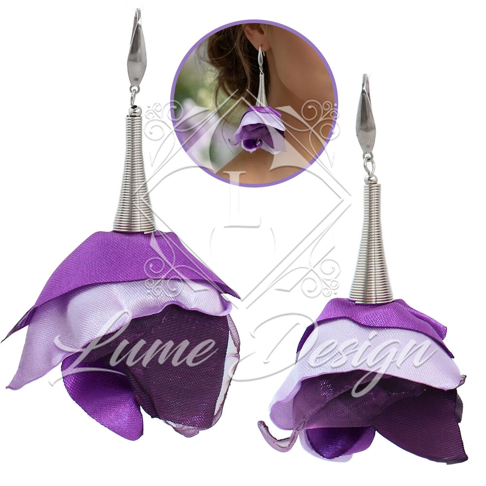 Ręcznie wykonane kolczyki z delikatnej tkaniny, układającej się w miękkie, przestrzenne płatki kwiatów.
