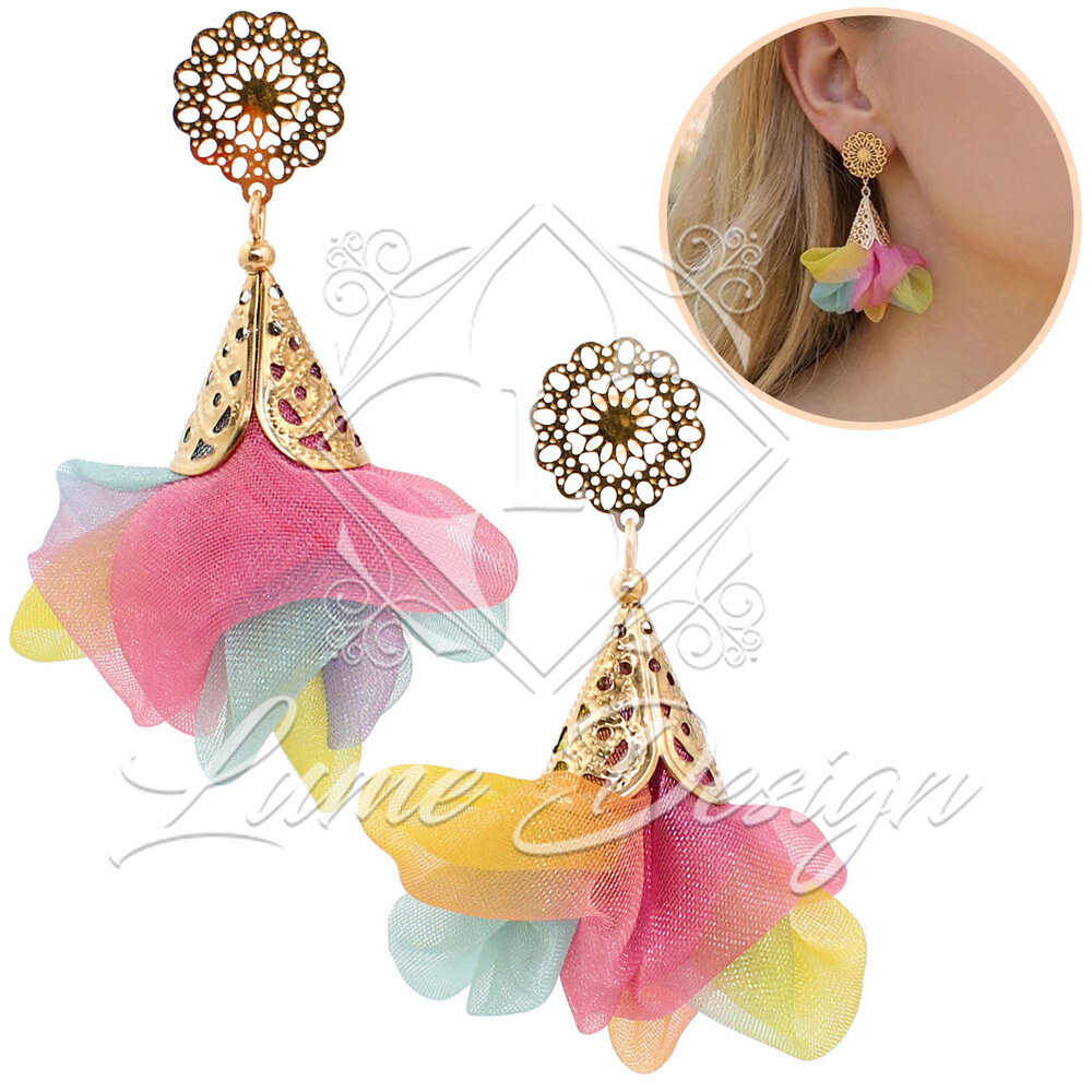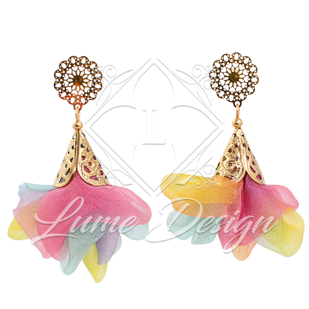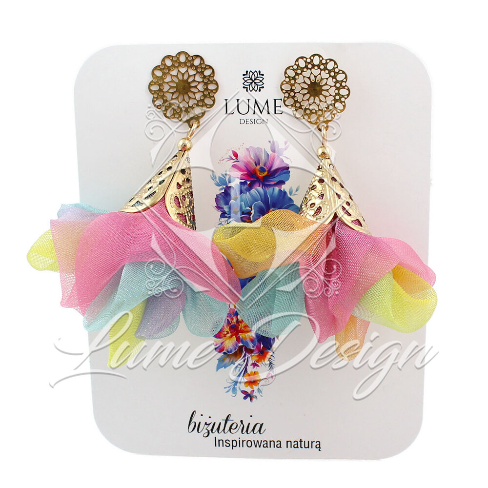 Kolczyki z tkaniny kolorowe lekkie kwiaty handmade pastelowe złote