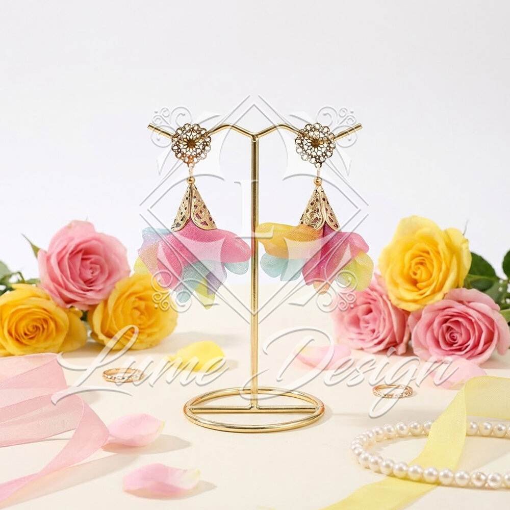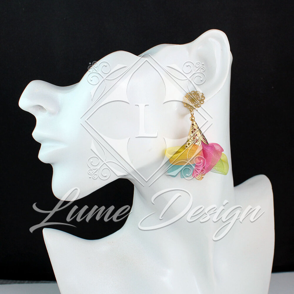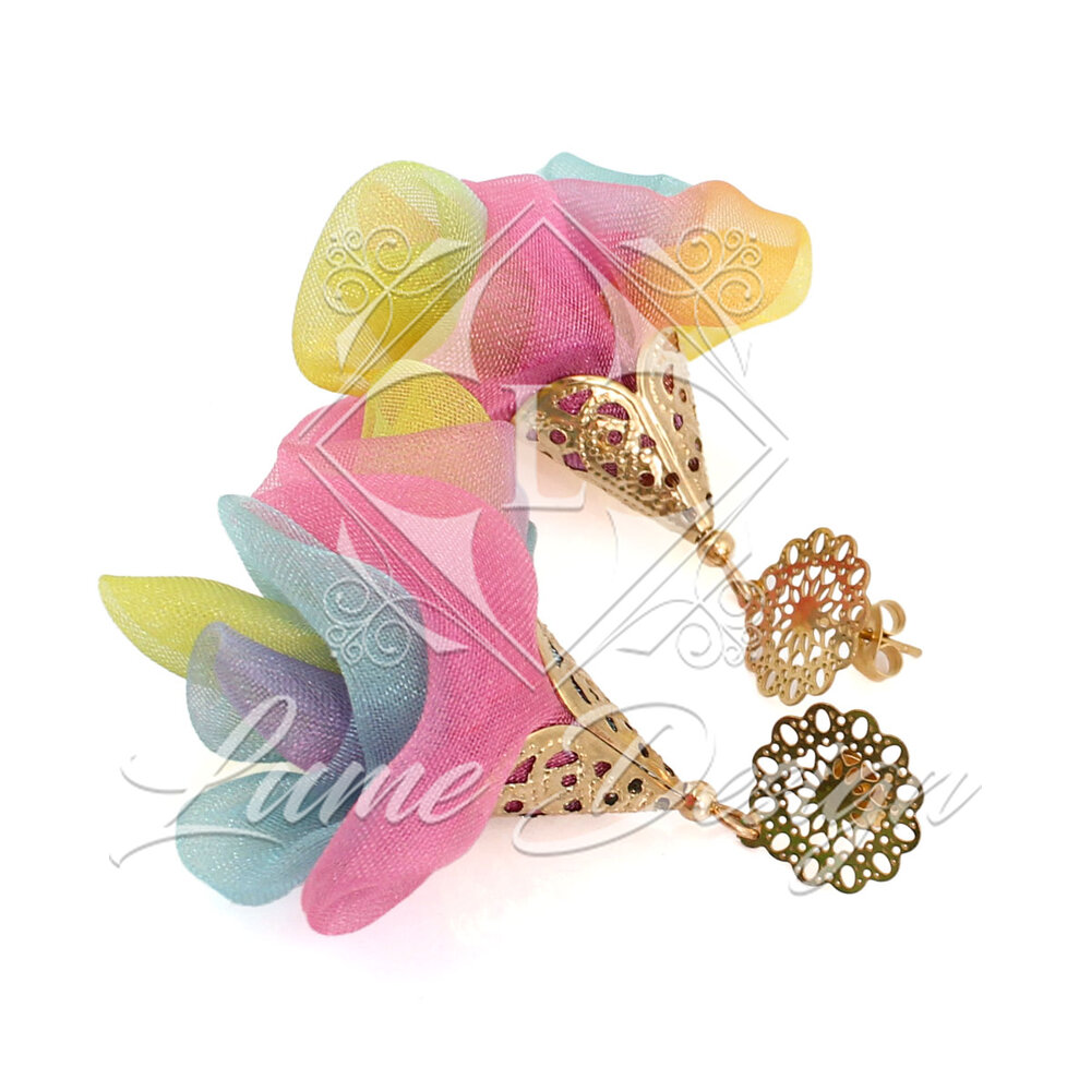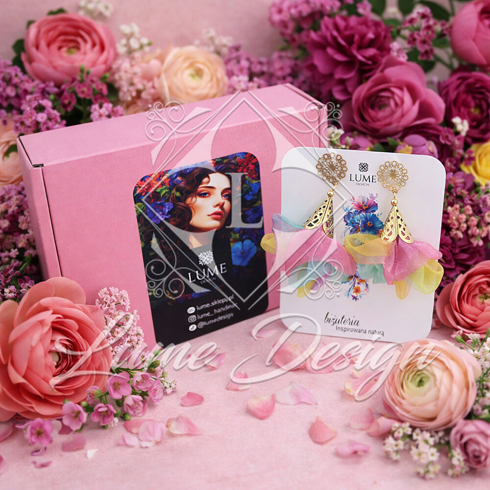 Ręcznie robione kolczyki z delikatnej, zwiewnej tkaniny w pastelowej, wielokolorowej kompozycji. Lekkie, kobiece i subtelne – dodają stylizacji świeżości, koloru i letniego charakteru.