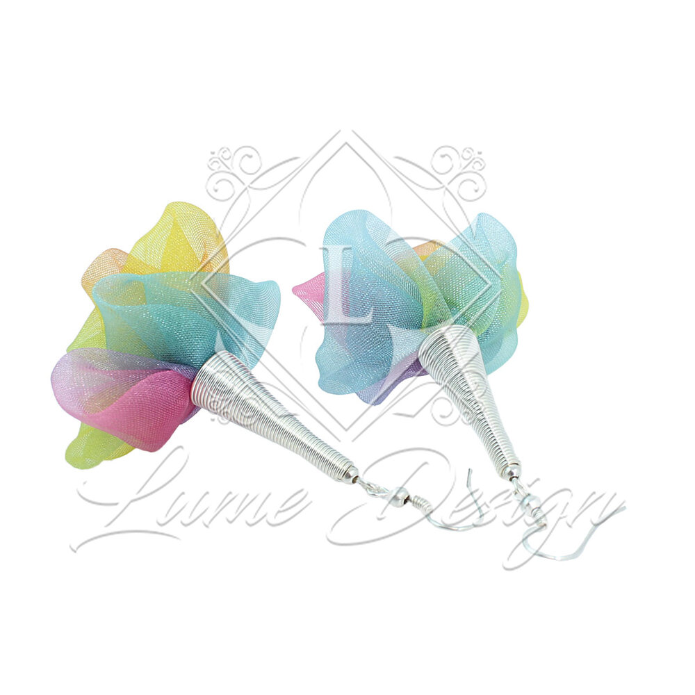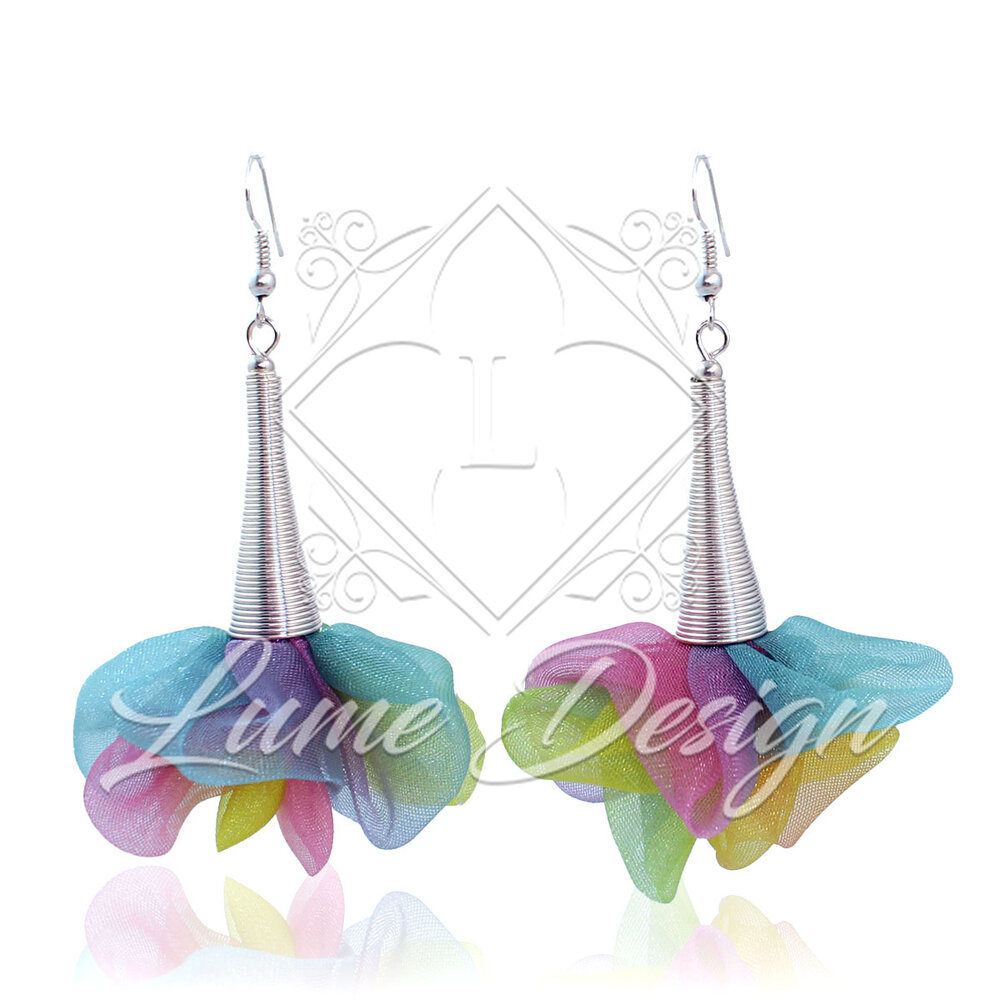 Ręcznie wykonane kolczyki z delikatnej tkaniny układającej się w kwiatki.