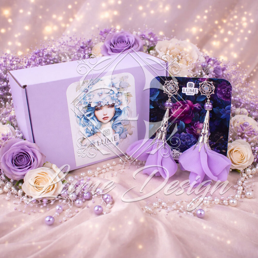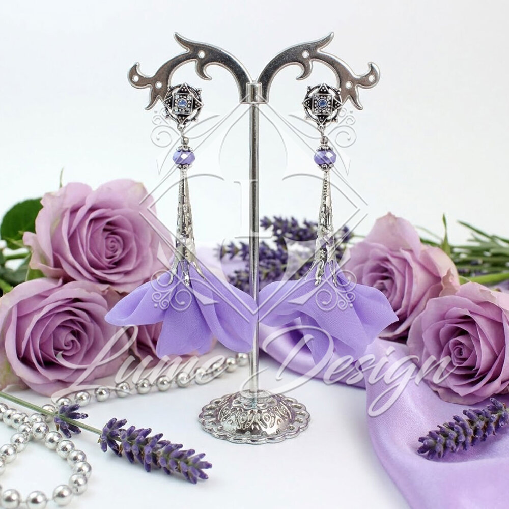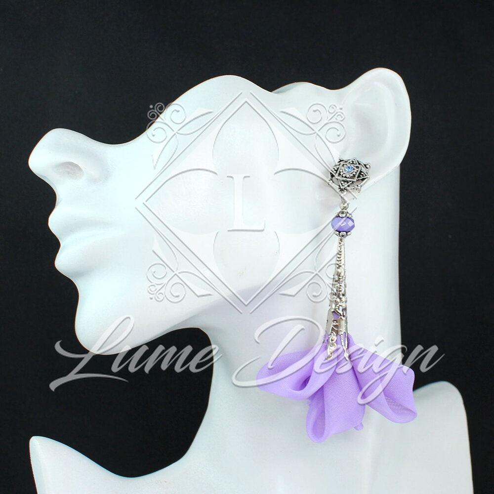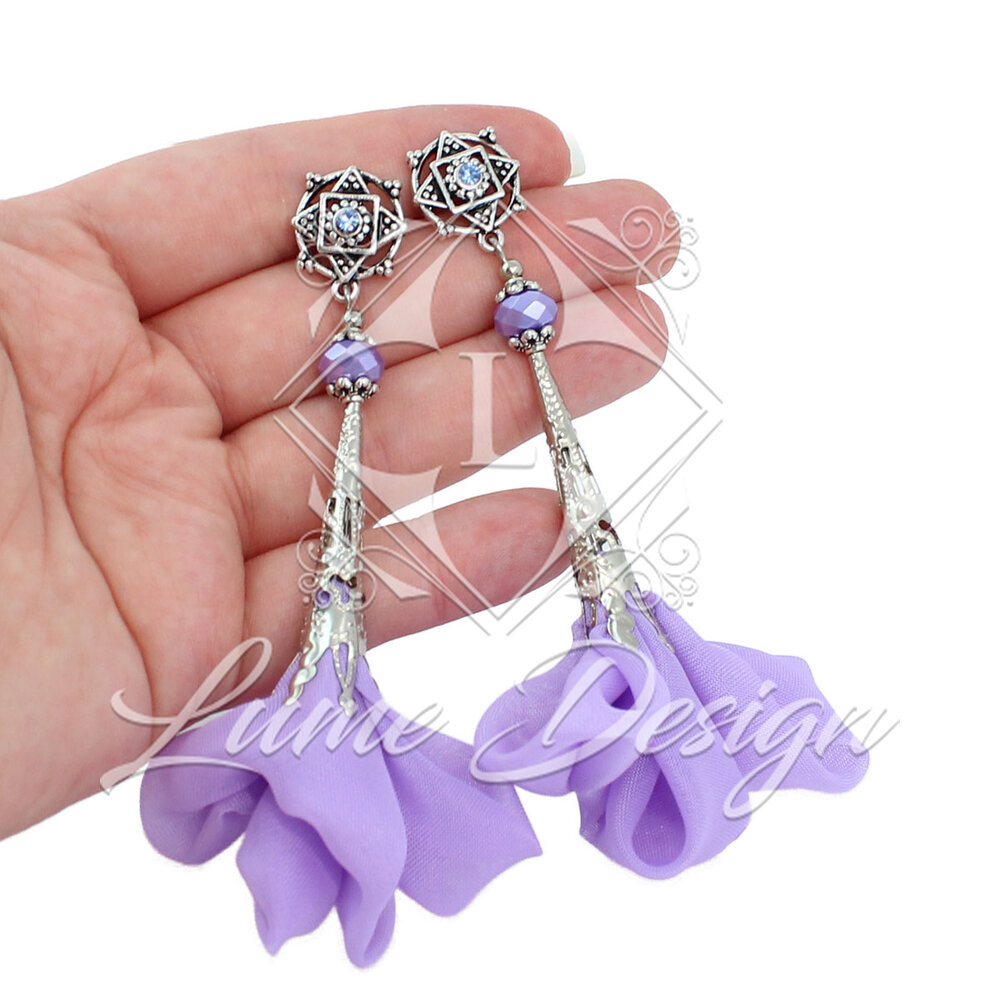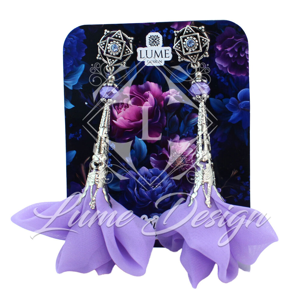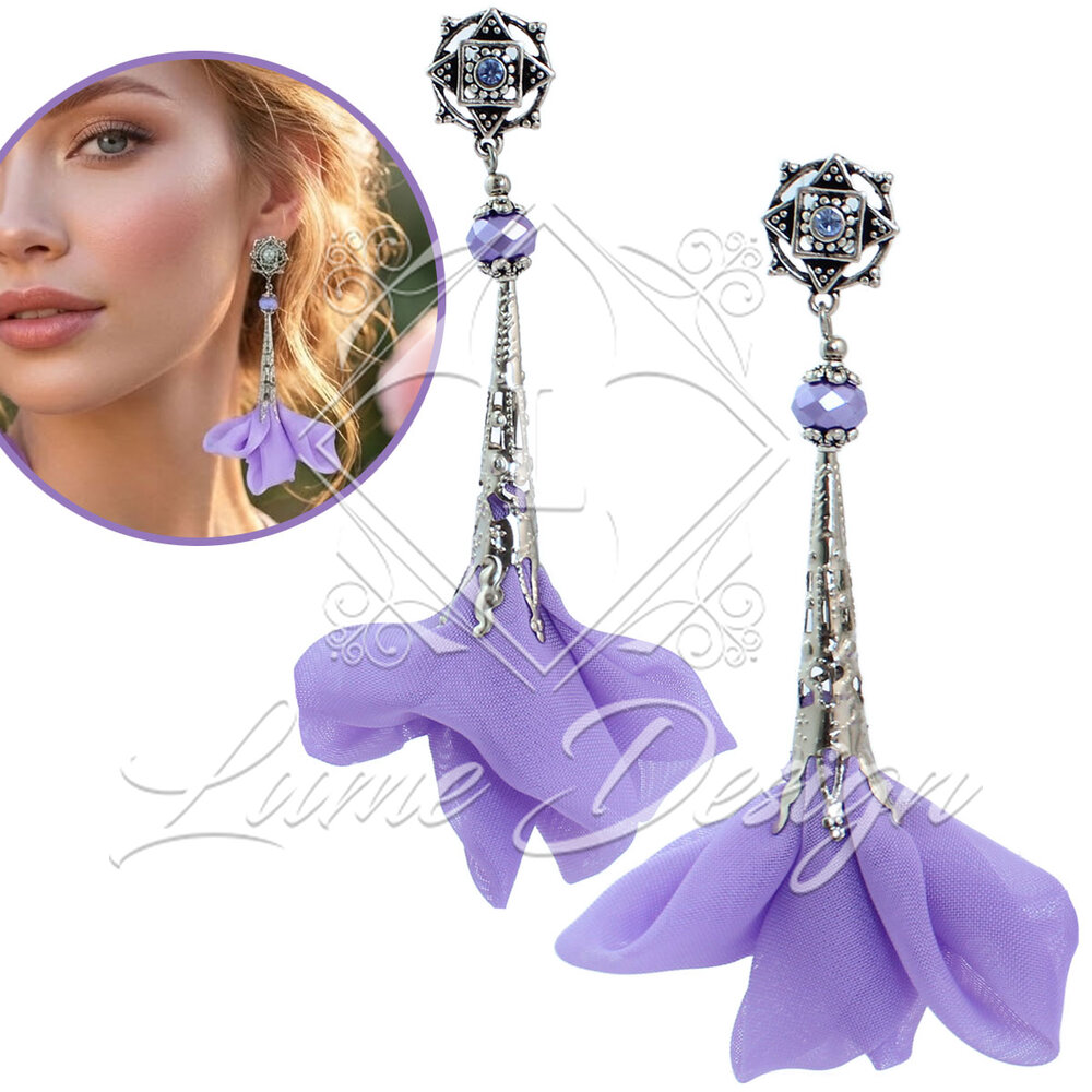 Ręcznie robione kolczyki z delikatnej, zwiewnej tkaniny w kolorze wrzosowo / lawendowym. Subtelne, lekkie i kobiece – dodają stylizacji romantycznego, eleganckiego charakteru.