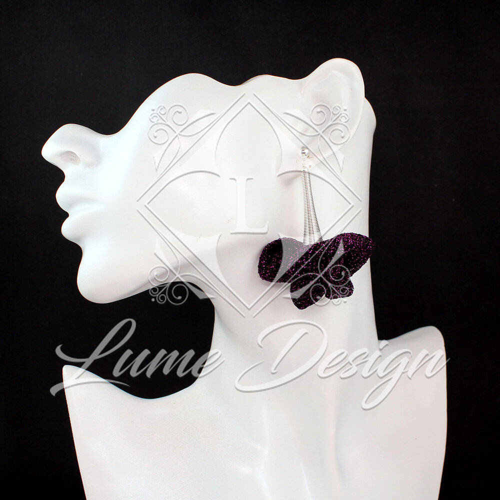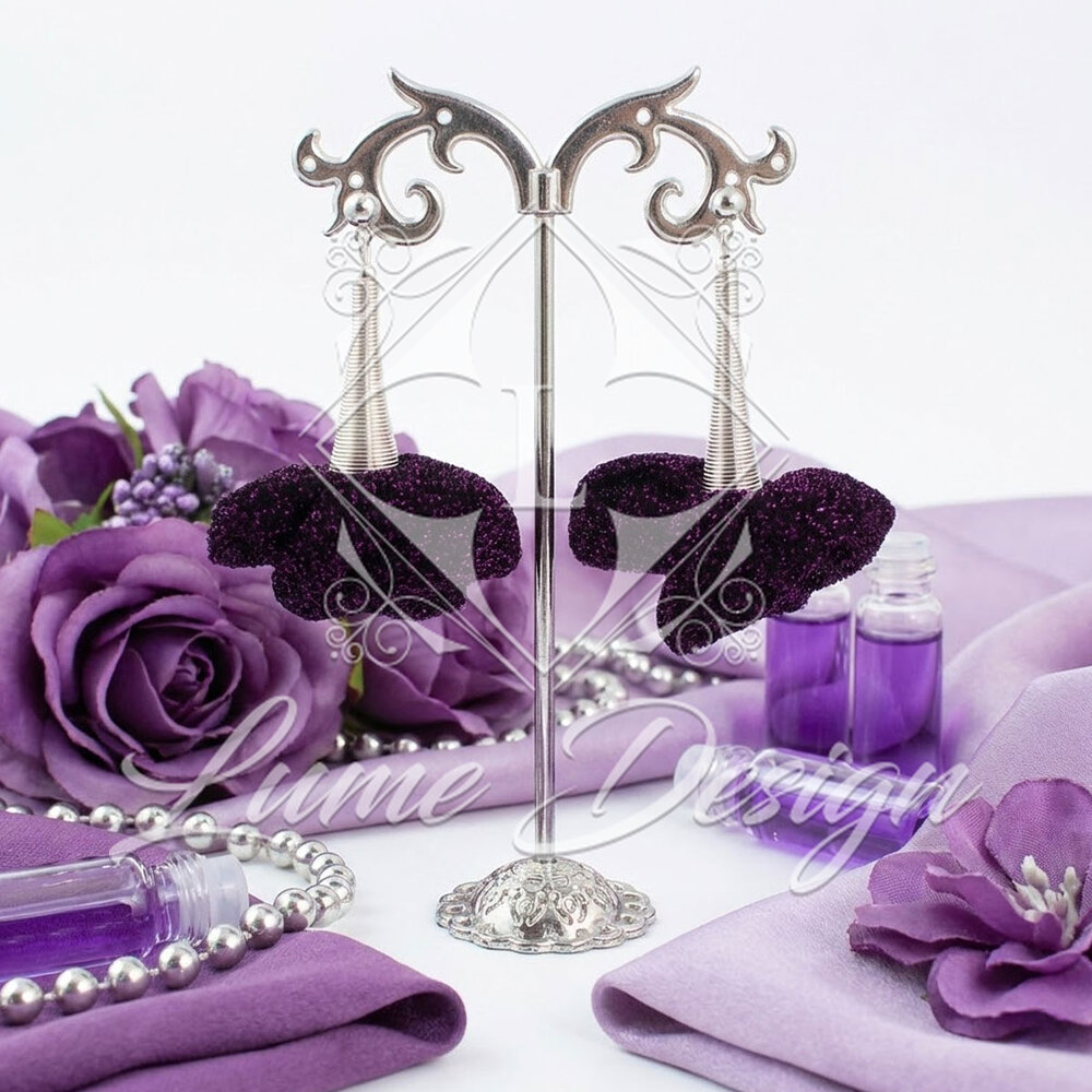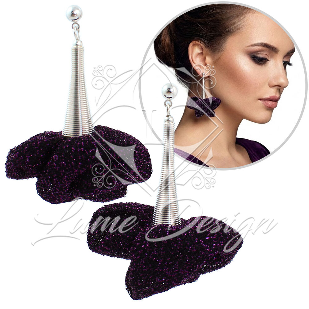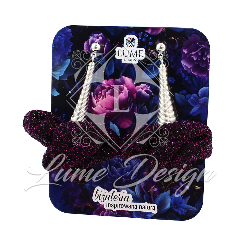 Ręcznie robione kolczyki połyskującej tkaniny w odcieniu ciemnego fioletu z subtelnymi drobinkami różu / fioletu.