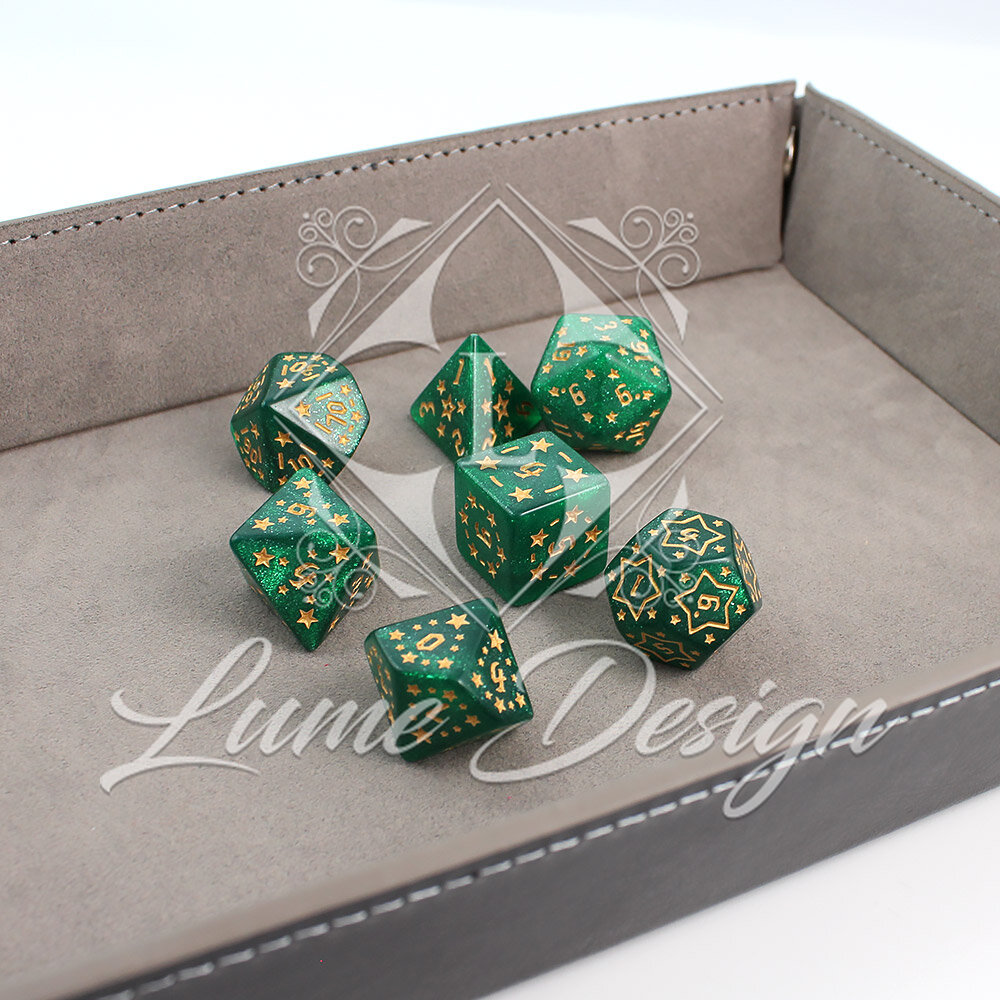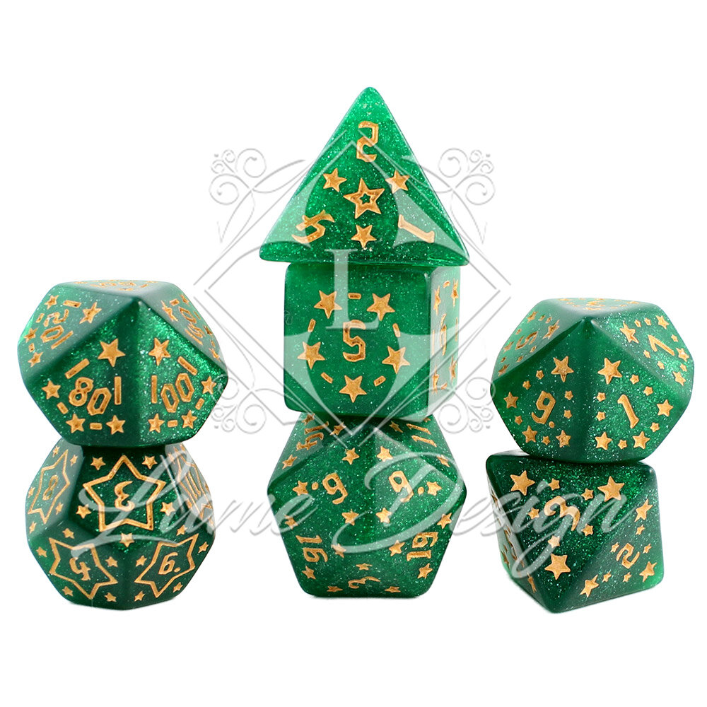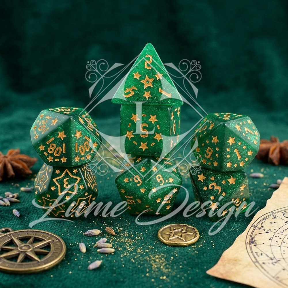 Wyobraź sobie nocne niebo obserwowane z samego serca elfiego lasu. Szmaragdowa zieleń mchu i koron drzew miesza się z blaskiem odległych konstelacji. Zestaw Emerald Stars to odrobina tego magicznego, leśnego kosmosu zamknięta w poręcznych kościach. Niezwykle przyjemne dla oka przyniosą szczęście zarówno początkującym łowcom przygód, jak i weteranom.
