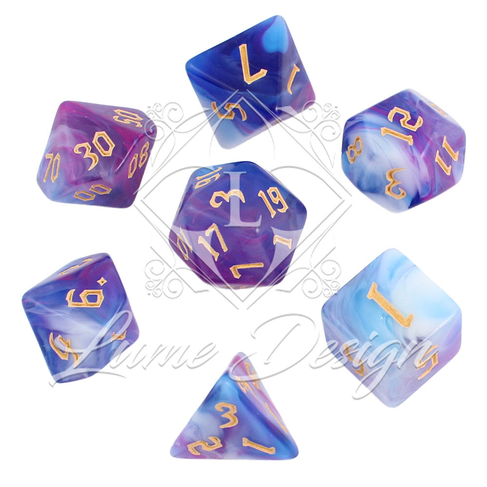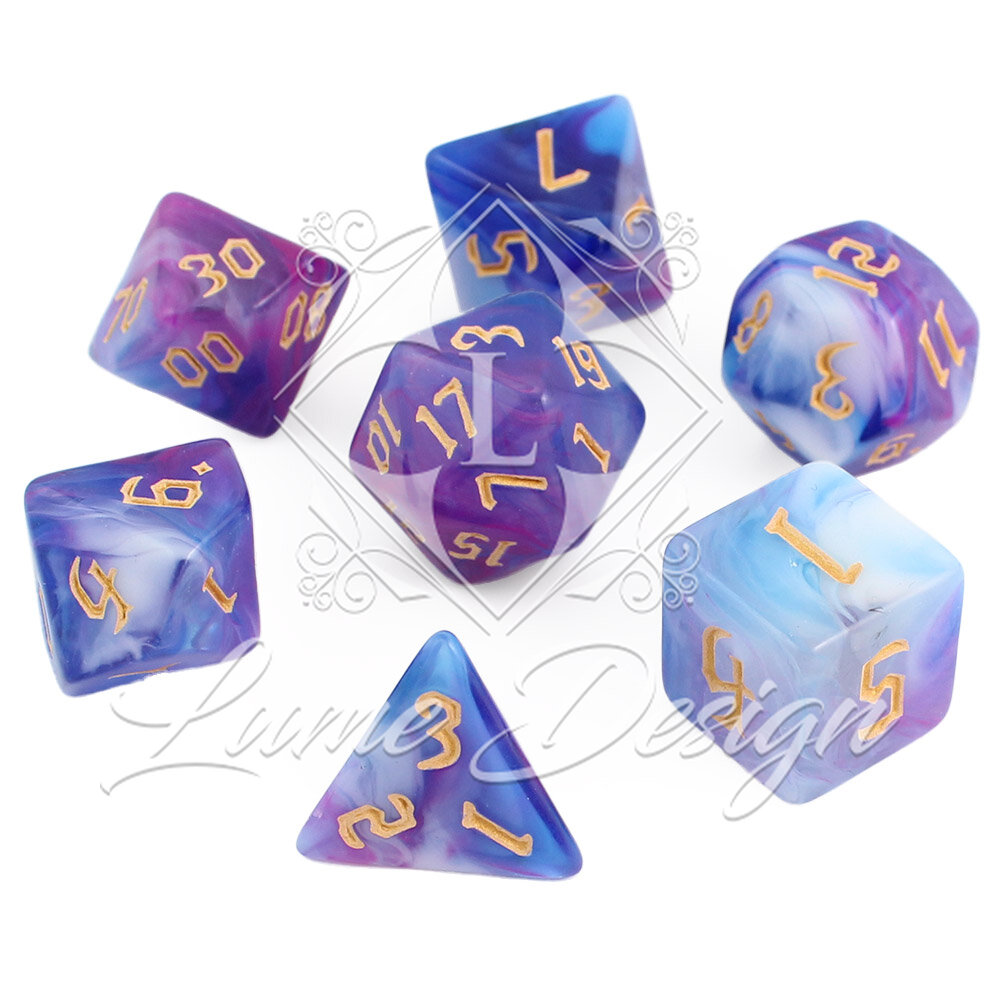 Zestaw 7 akrylowych kości RPG o zaokrąglonych krawędziach ze wzorem dymu w odcieniach fioletu, błękitu i bieli | Akrylowe Kości Twilight Mist Lume Design