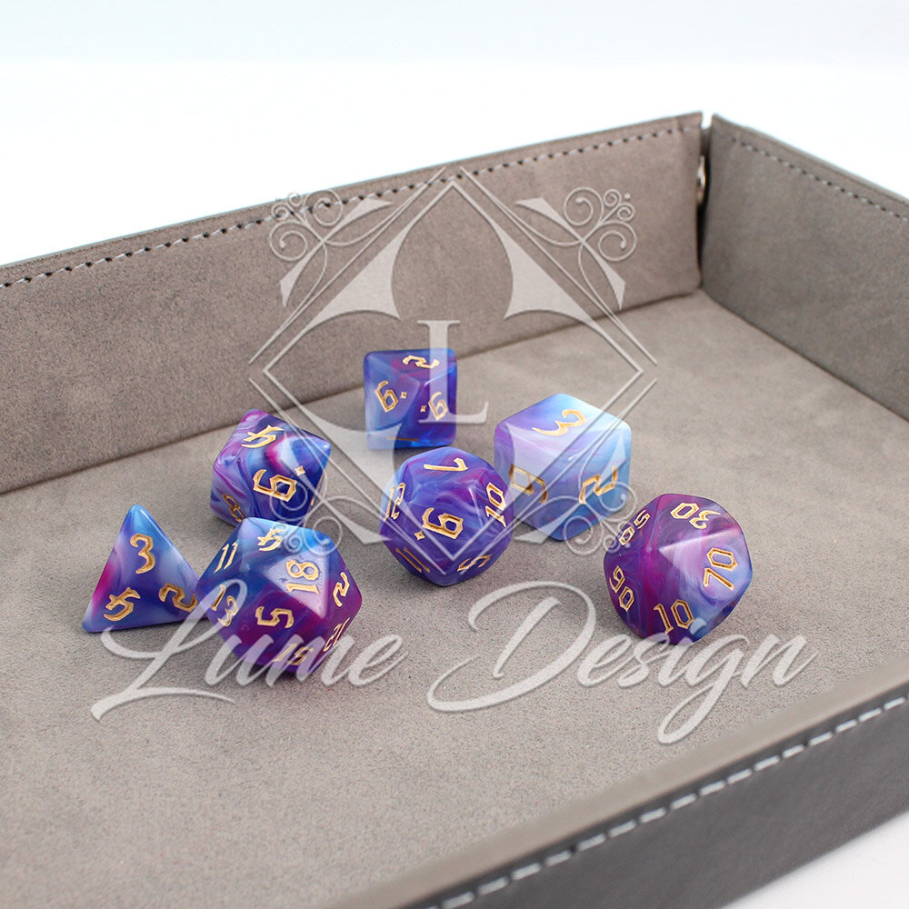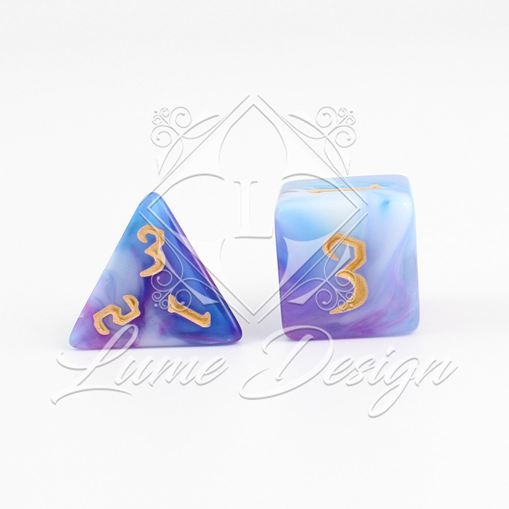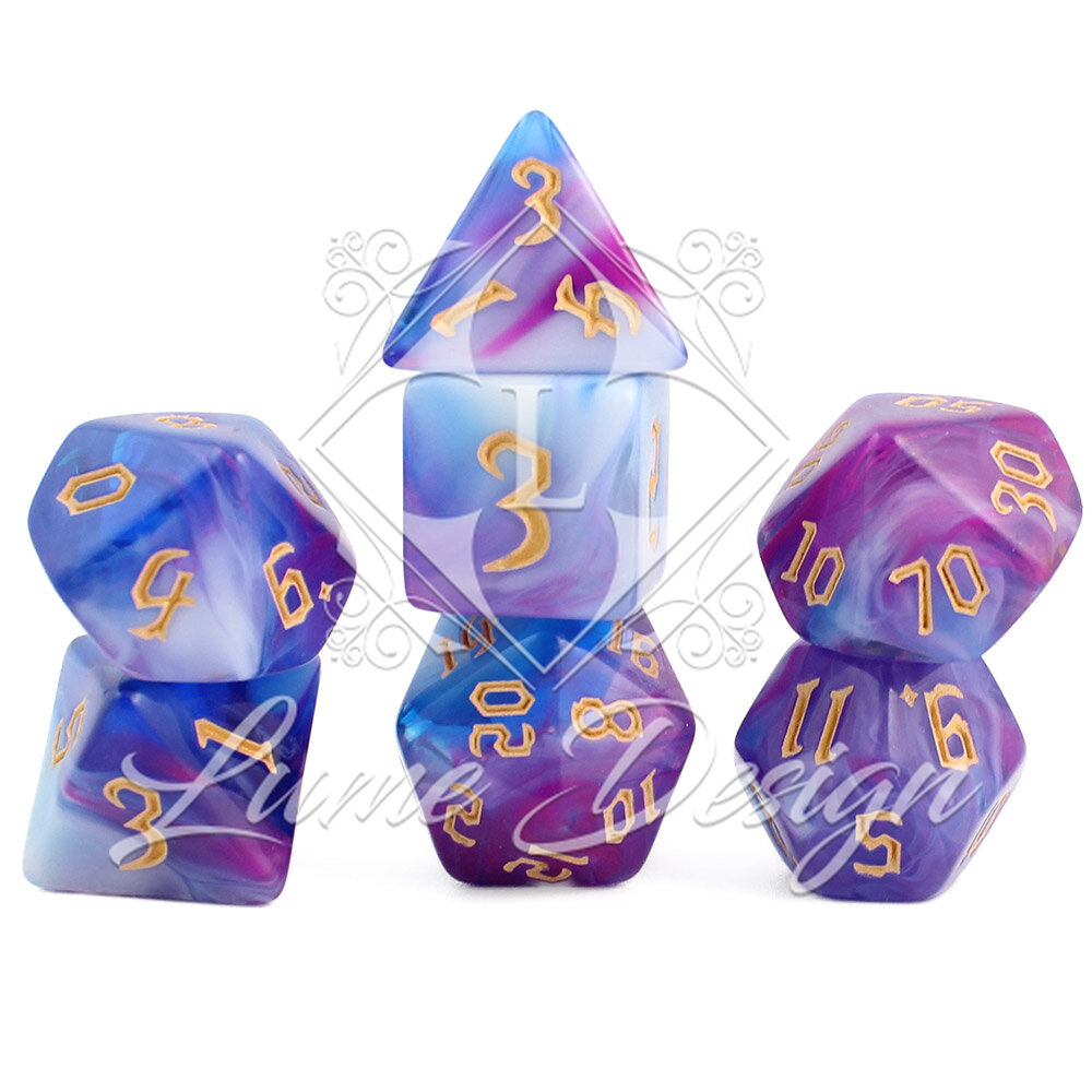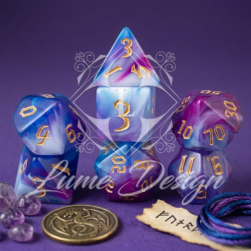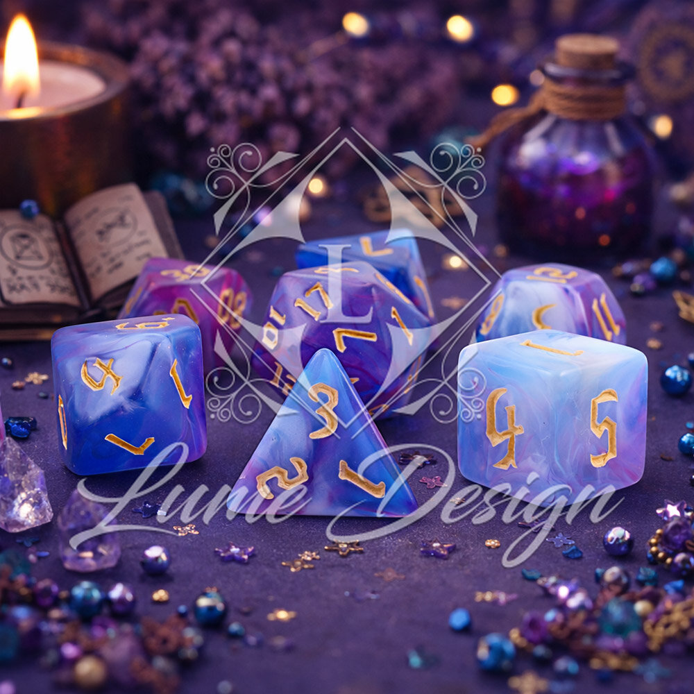 Te kości wyglądają, jakby wyrzeźbiono je z wieczornej mgły lub oparów eliksiru uwarzonego przez mistrza alchemii. Przenikające się barwy budują aurę tajemnicy, snu i iluzji. To zestaw, który nie narzuca się swoją formą, ale hipnotyzuje przy każdym rzucie, przypominając, że w świecie fantasy nic nie jest do końca takie, jakim się wydaje.