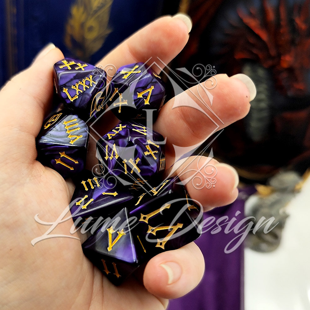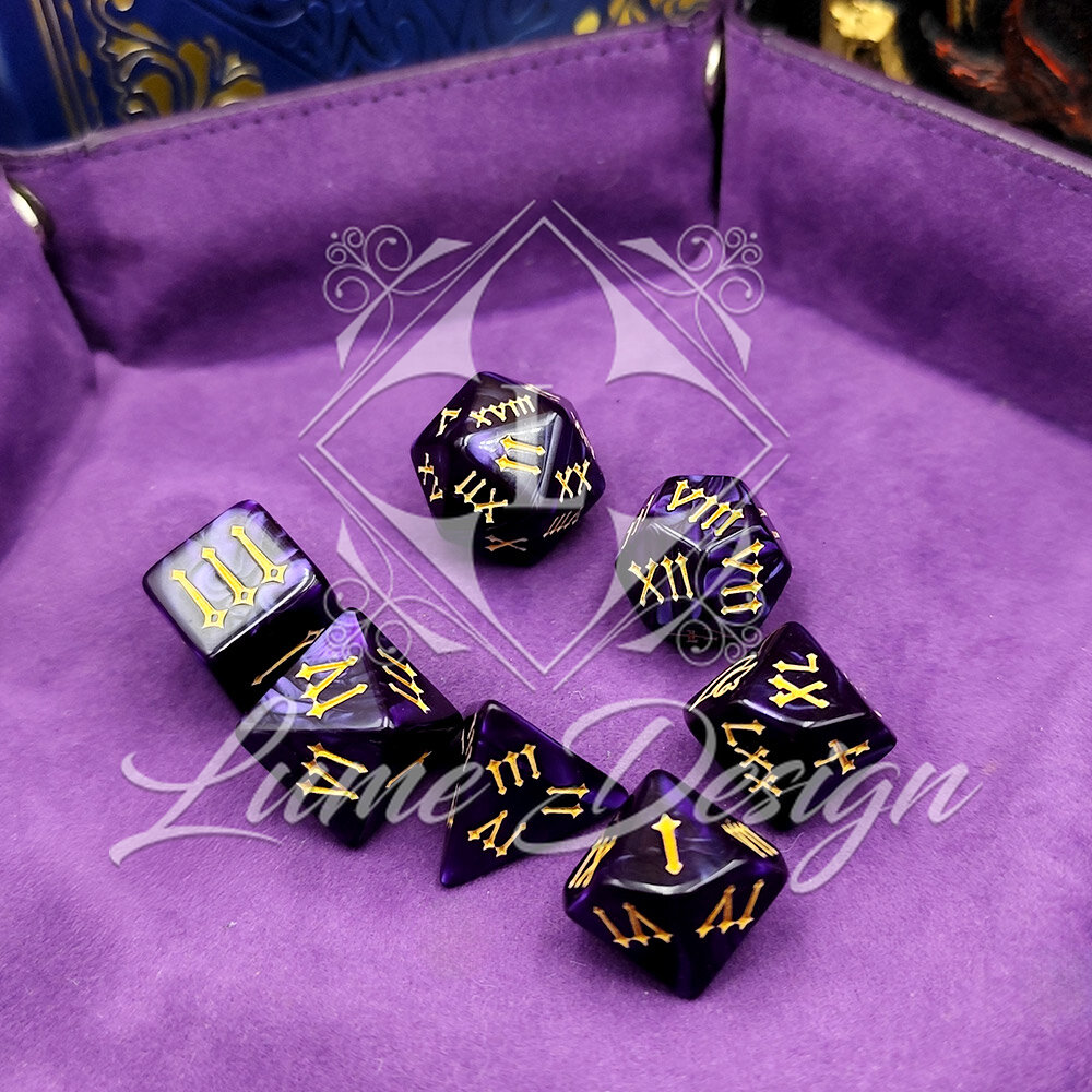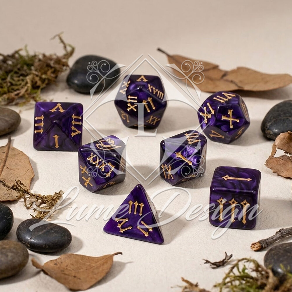Kości RPG Cyfry Rzymskie Fioletowe Złote Zestaw DnD