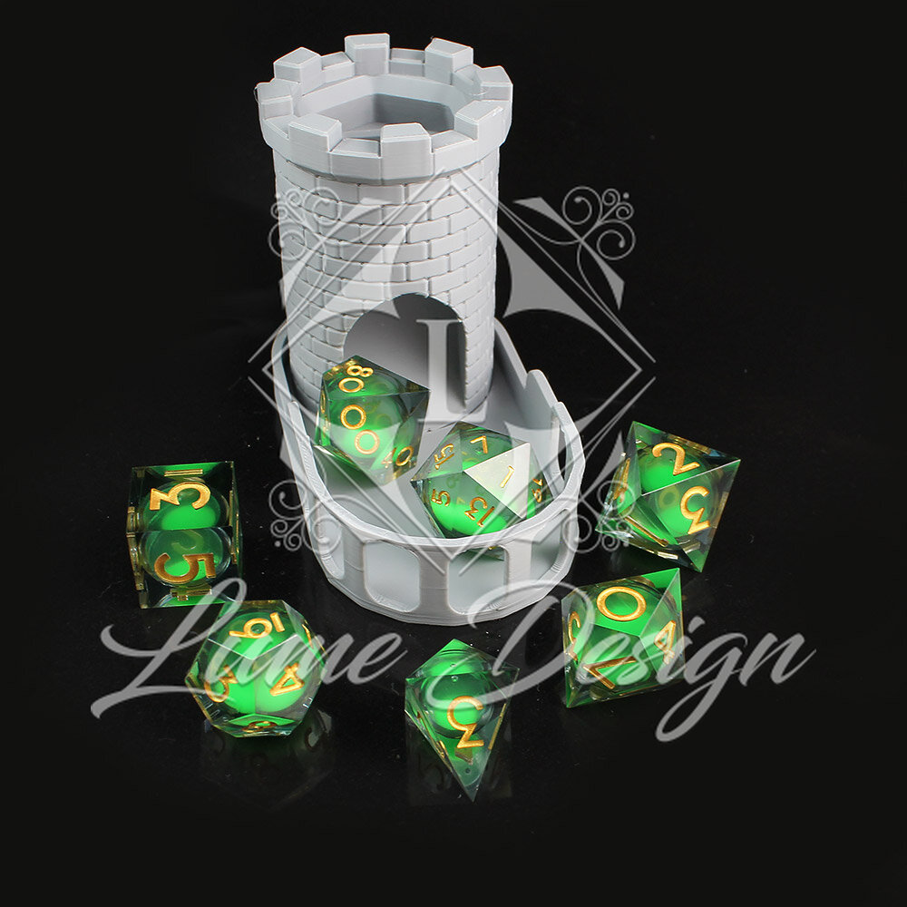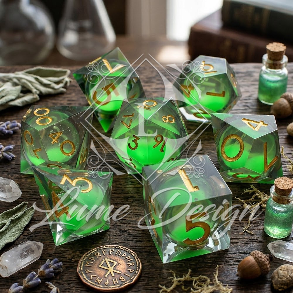 Efekt: Liquid Core – w sercu każdej kostki znajduje się płynna sfera wypełniona intensywnie zielonym, drobnoziarnistym piaskiem. Podczas rzutu piasek wiruje i przesypuje się, tworząc hipnotyzujący efekt "żywej energii".
