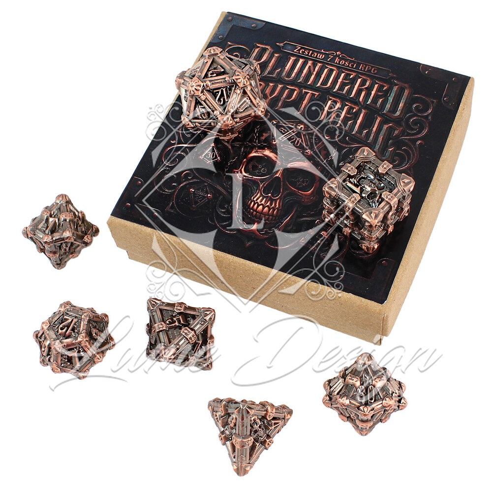 Plundered Crypt Relic to zestaw, który opowiada historię. Wyglądają jak skarby odnalezione w dłoniach dawno poległego króla Lisza lub dary wyjęte prosto z rąk bóstwa śmierci. Surowa, oksydowana miedź w połączeniu z motywem czaszek sprawia, że są idealnym wyborem na sesje w klimacie dark fantasy, horroru czy eksploracji niebezpiecznych podziemi.