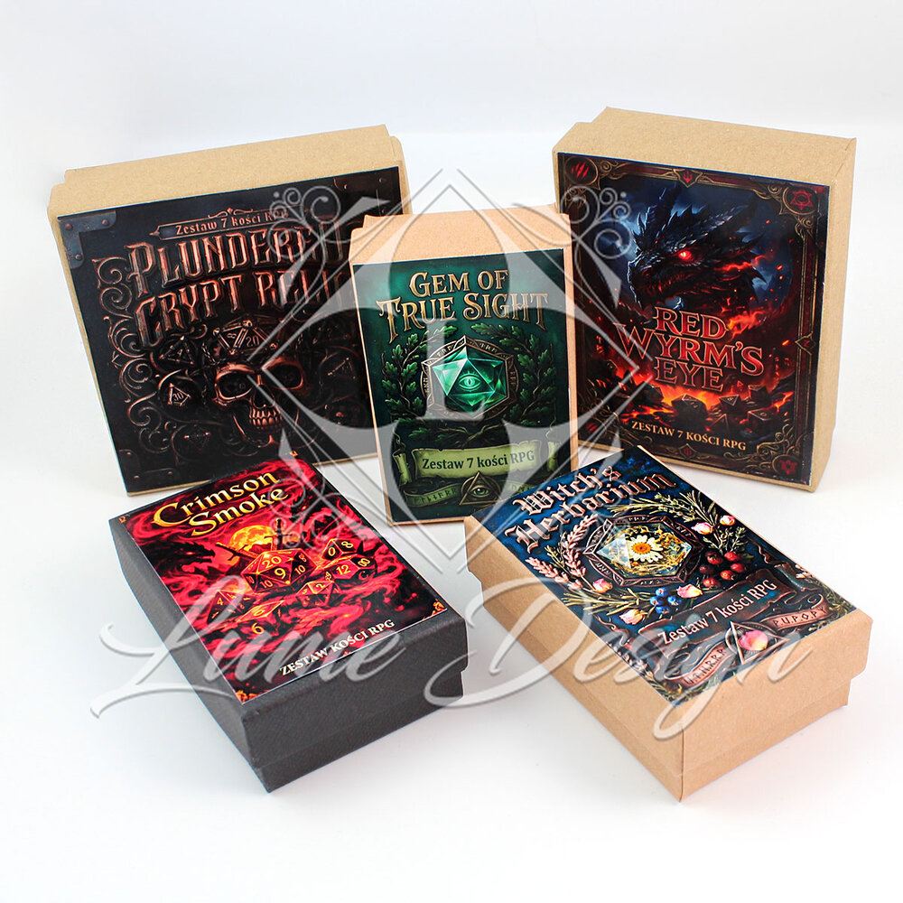 Zestaw pakowany jest w pudełko kartonik – kolor i wzór dobierany tak, by pasował do estetyki kości. Całość prezentuje się jako gotowy, luksusowy prezent dla wymagającego gracza.
