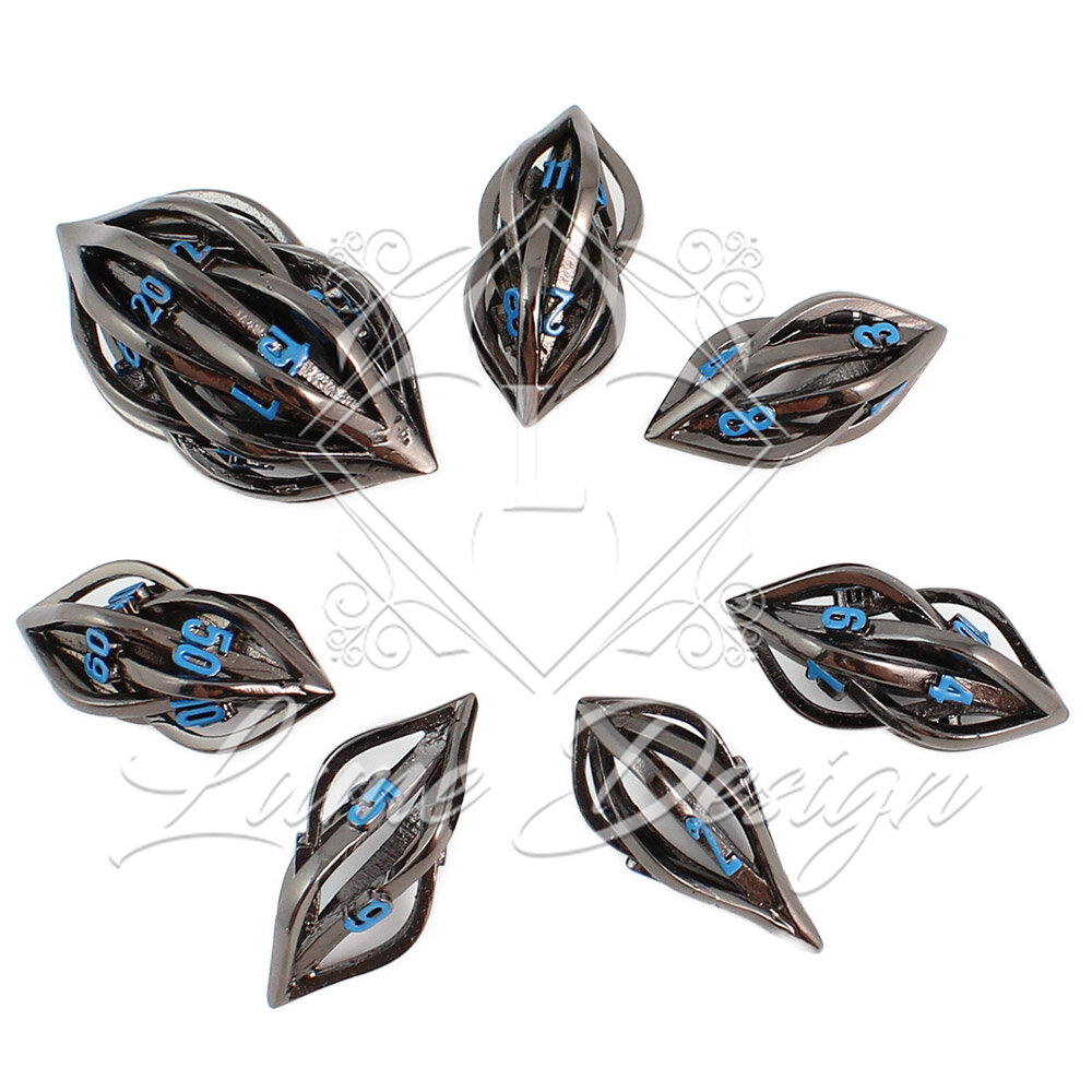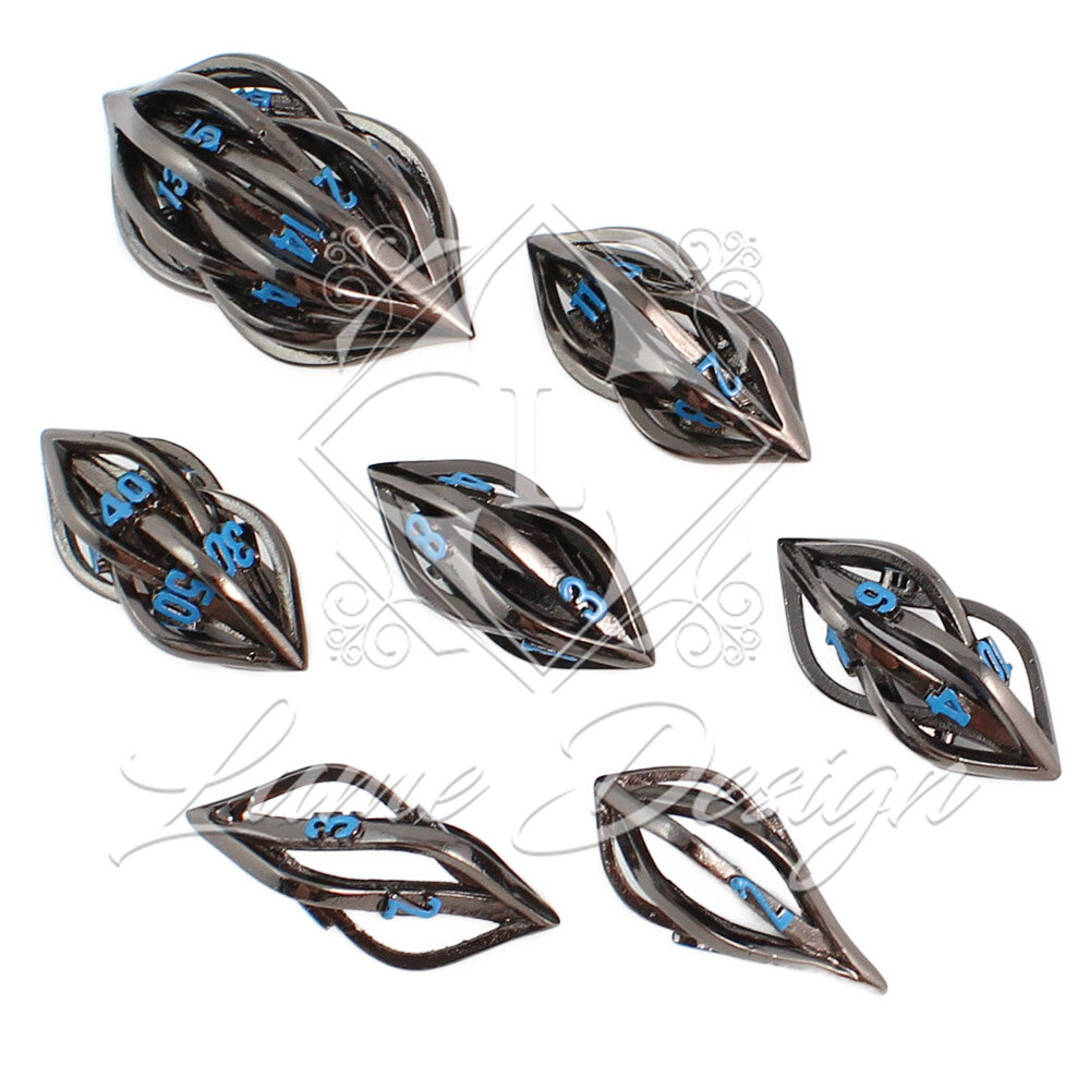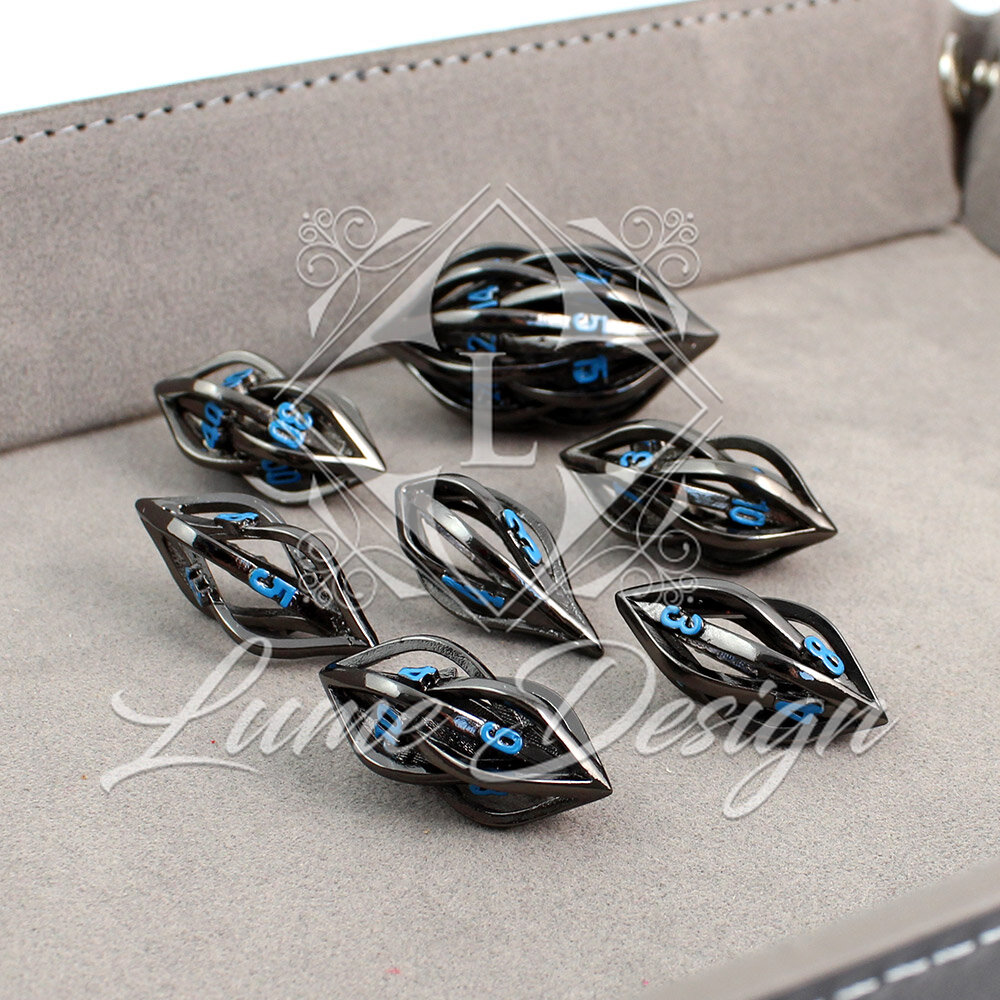Unikatowe ażurowe kości RPG w kolorze czarnym z niebieskimi cyframi o nowoczesnym kształcie | Kości Metalowe Neon Weave Lume Design