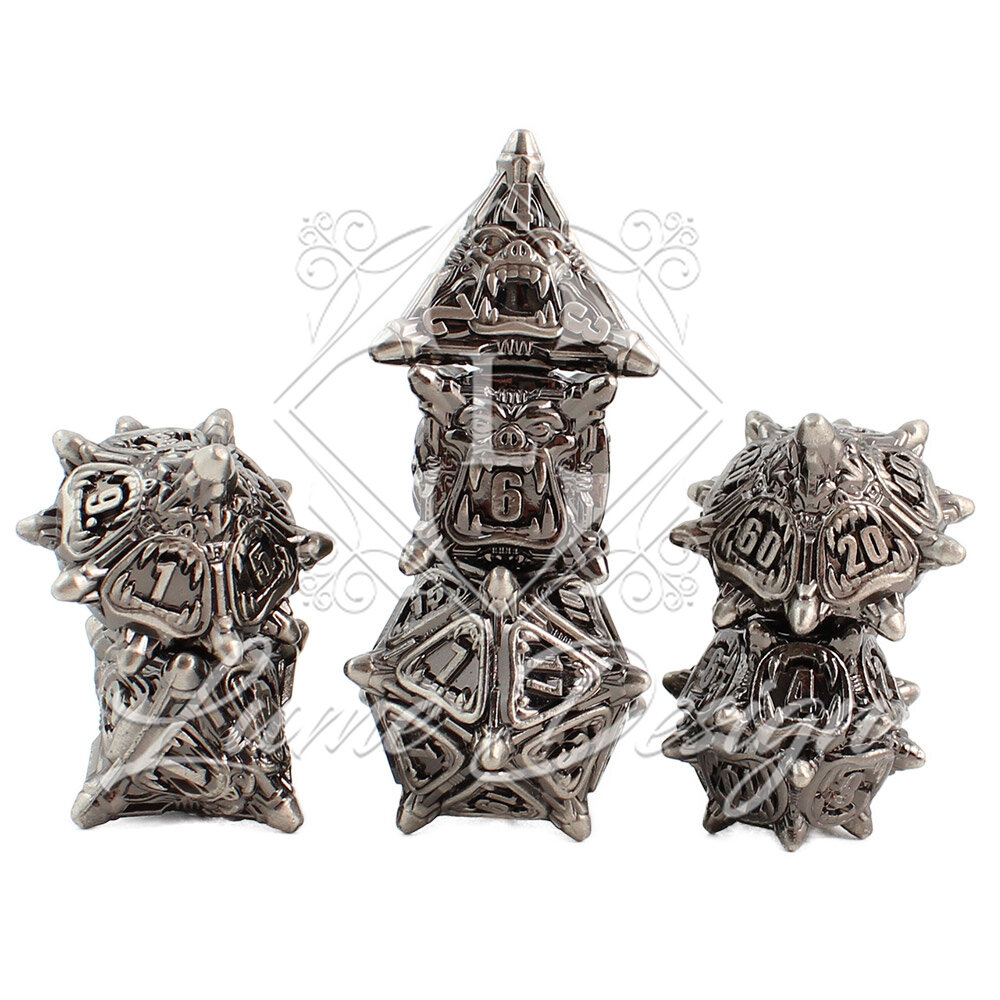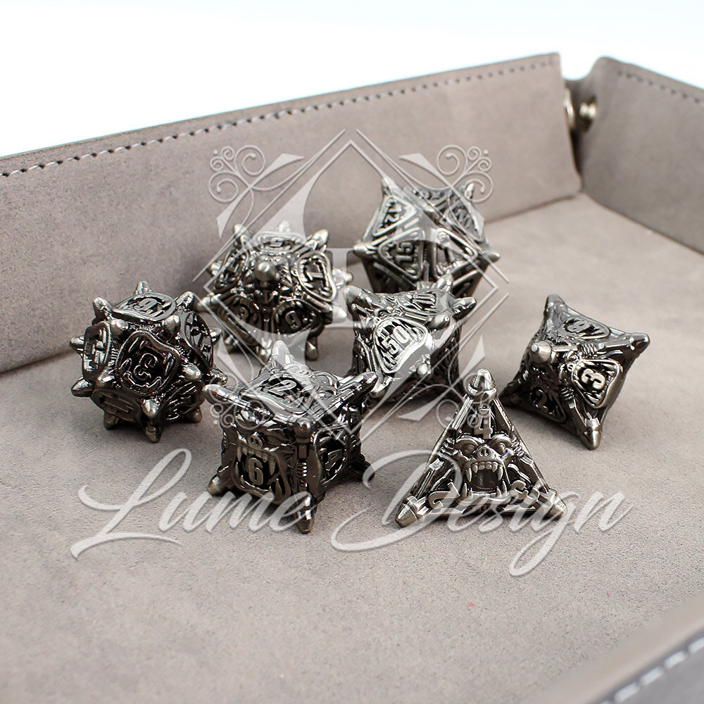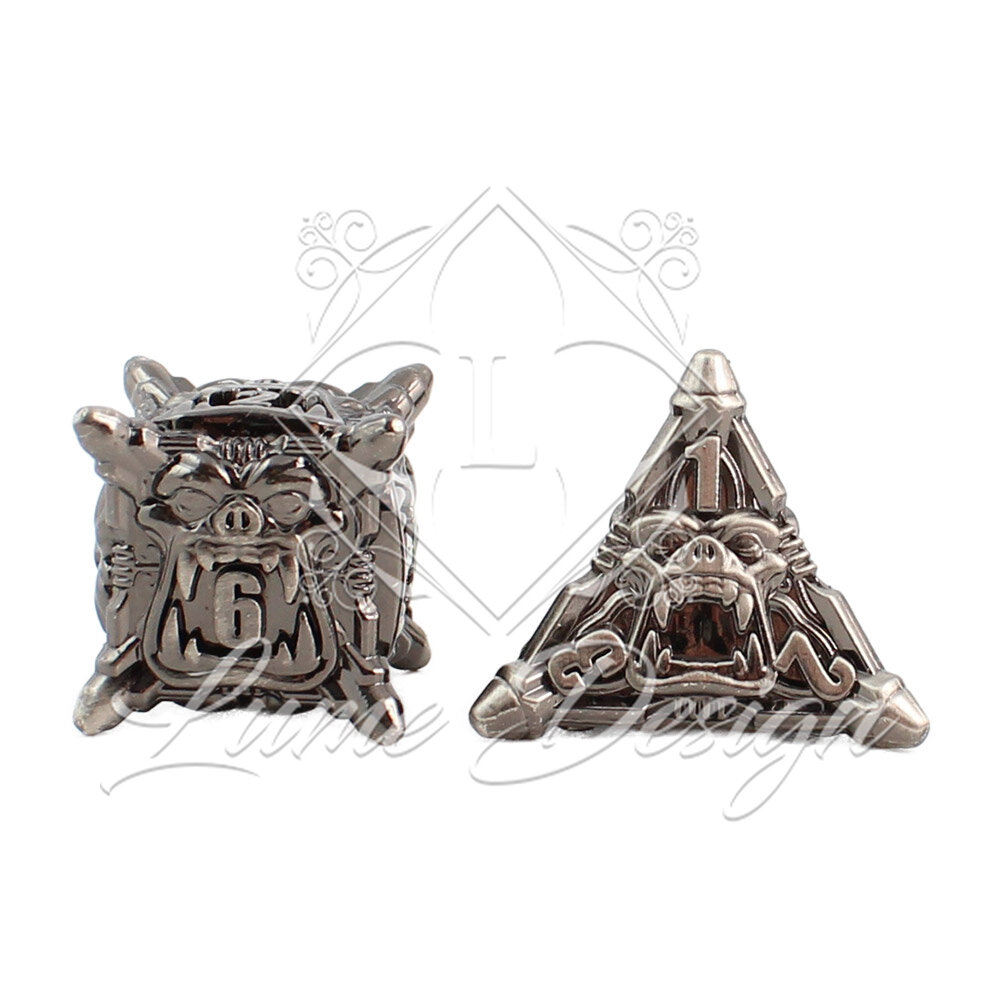 Metalowe kości RPG w kolorze ciemnego srebra (gunmetal) z rzeźbionymi twarzami orków | Kości Metalowe Orc Ironhide Lume Design