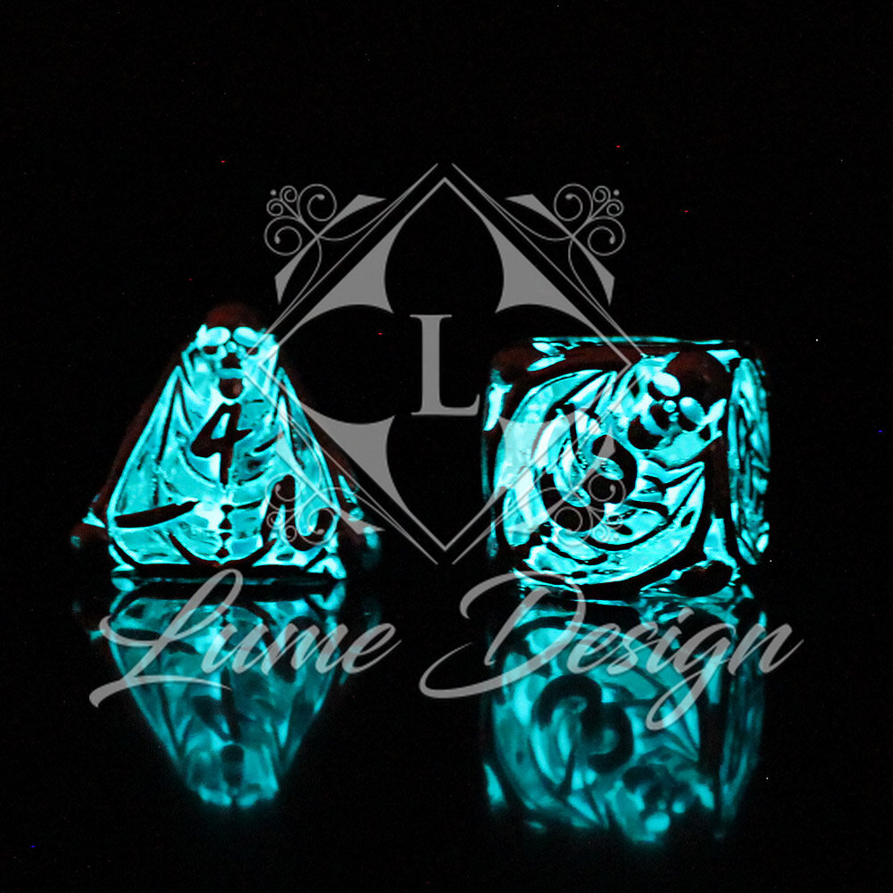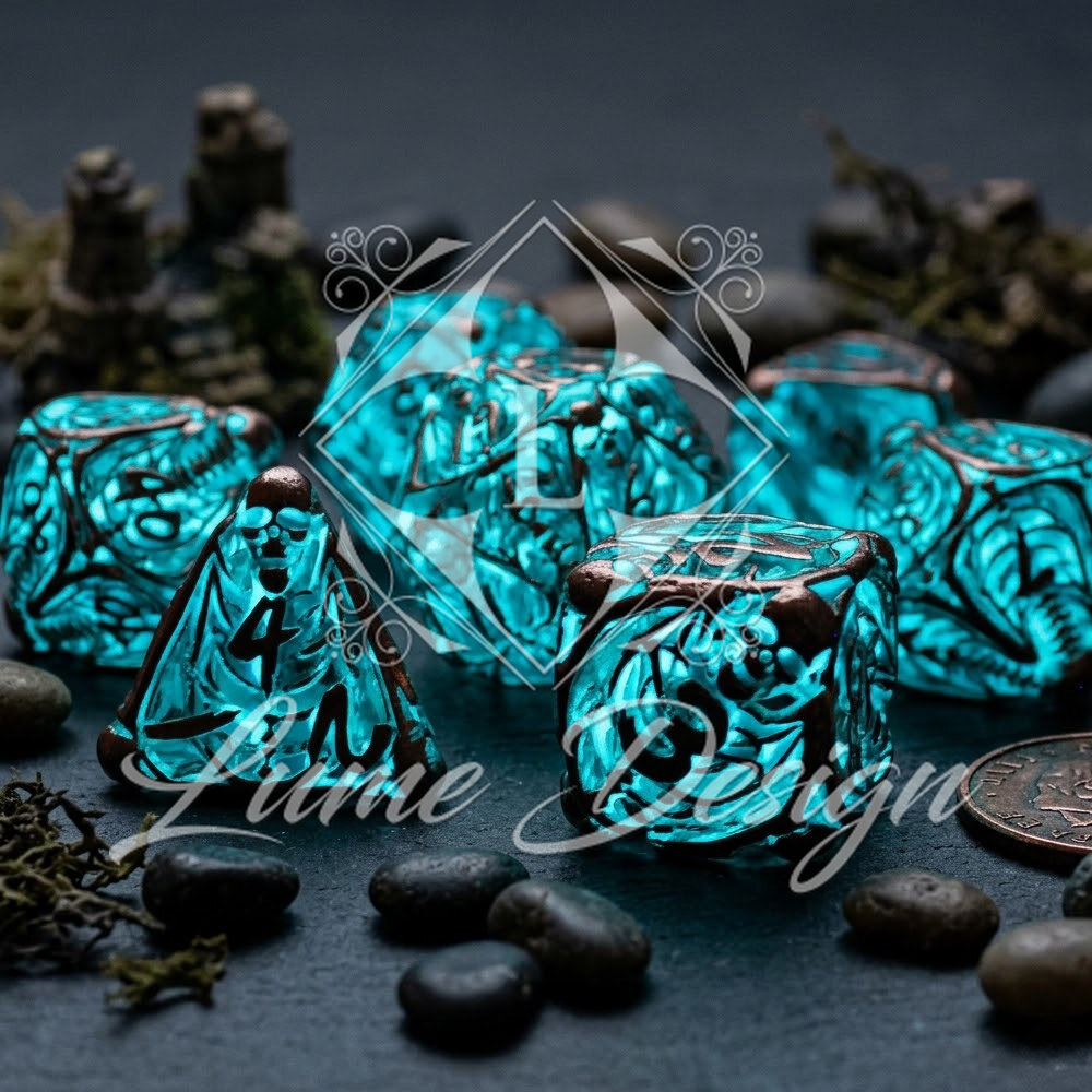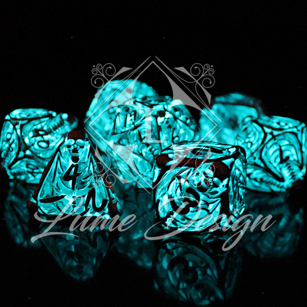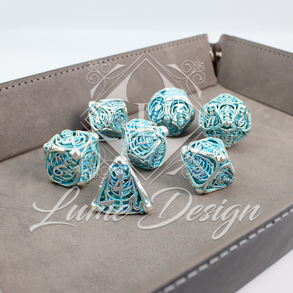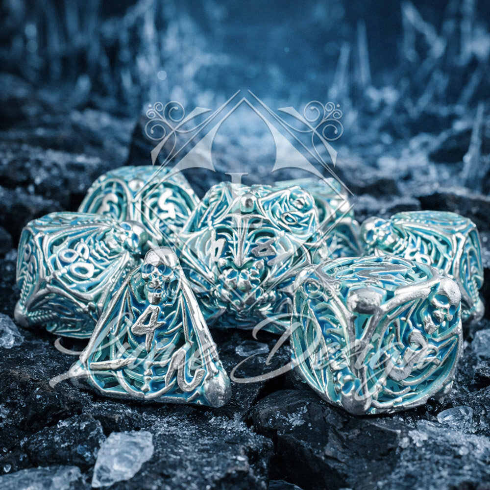 Metalowe ażurowe kości RPG ze szkieletami świecące na błękitno w ciemności | Kości RPG Frostbound Souls Lume Design