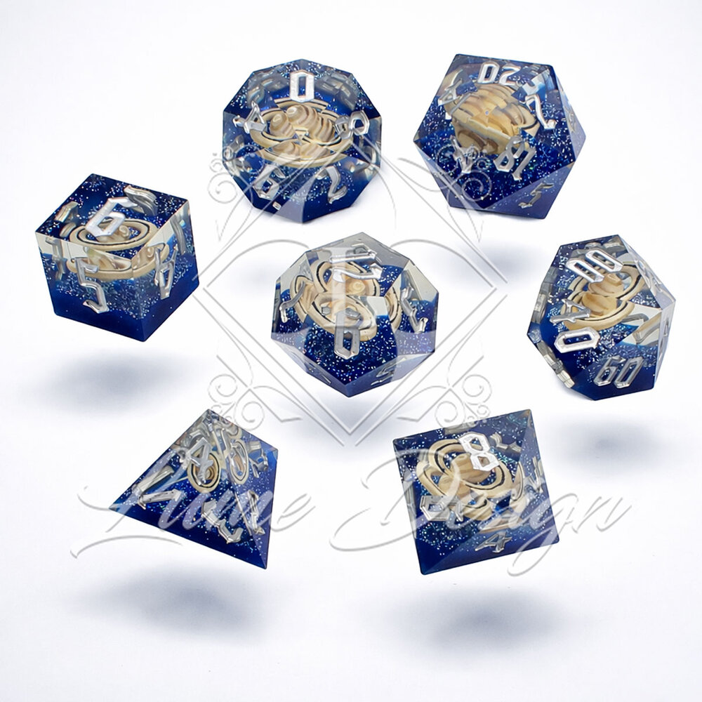 Zestaw ten to hołd dla nieskończoności kosmosu. Trzymając te kości w dłoni, masz wrażenie, że spoglądasz przez iluminator statku kosmicznego na nieznane układy planetarne. Idealnie oddają klimat podróży międzygwiezdnych, tajemnej wiedzy astronomicznej i magii grawitacji.