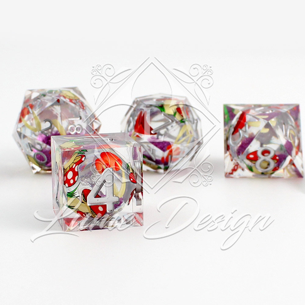 Baśniowy zestaw 7 kości wielościennych do gier fabularnych z ruchomym wnętrzem.