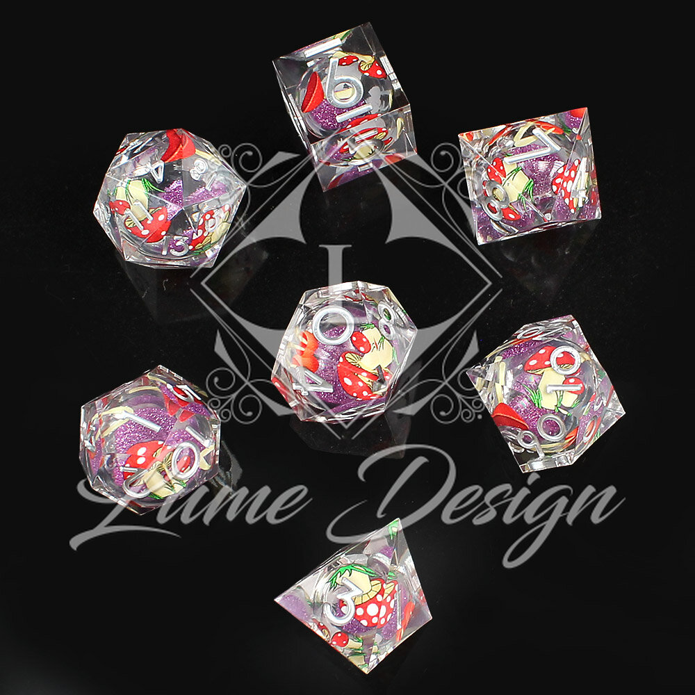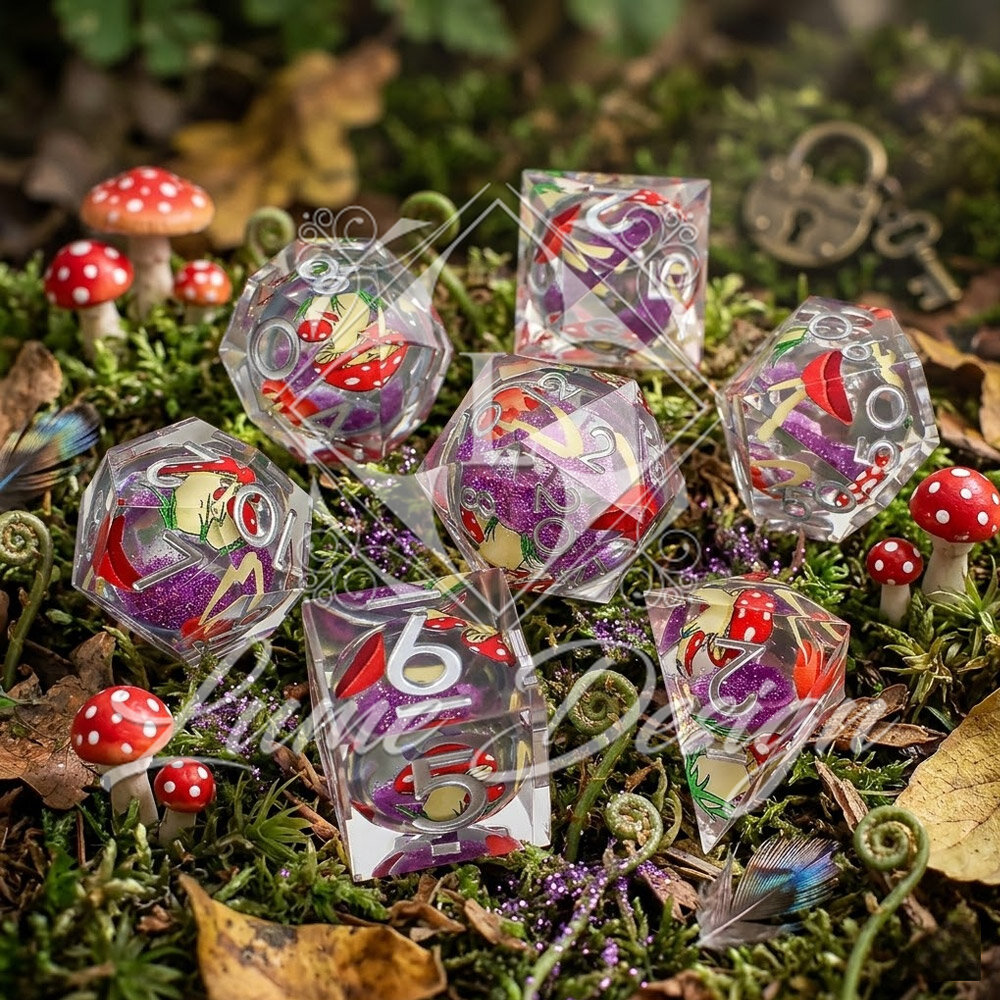 Kości RPG Płynne Grzyby Muchomory Fiolet Zestaw Prezent Grzybki dnd