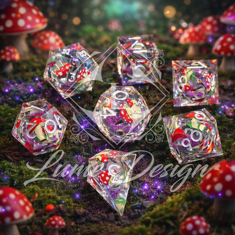 Te kości wyglądają, jakby zostały zebrane podczas pełni księżyca w samym sercu zaczarowanego lasu. Ilustracje muchomorów przywodzą na myśl ukryte ścieżki i kręgi wróżek, a wirujący wewnątrz fioletowy pył zdaje się tętnić własnym, magicznym życiem. Rzut tymi kośćmi to jak krok w nieznane, gdzie za każdym drzewem może kryć się przygoda lub pradawna tajemnica natury.